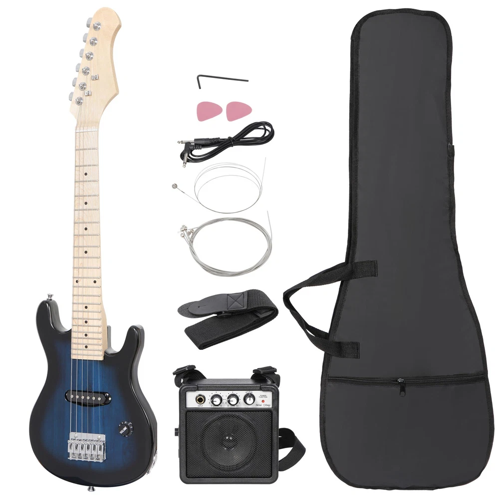 Beyond Toys: Choosing a Great Beginner Guitar for Kids Picking a starter guitar often involves juggling your budget with your kid’s expectations. To learn the instrument, buying something expensive and an equally costly premium amp is not necessary. Instead, it’s worth opting for a beginner’s guitar or a convenient and affordable combo pack. starter kit contains everything your need to get your kids up and playing instantly, including a guitar, an amp, a cable, strap, plectrums and additional strings set, at a price anyone can afford. Our Electric Guitar is a brand new 30"functional Electric Guitar. Good quality, beautiful surface especially the perfect size make it an ideal choice for your kids. It is lightweight and easy to carry. 30” scale is easier for small hands to manage. All accessories you need to start playing the guitar right away are included. This combo is perfect for kids and would make a great gift. The guitar holds tune very well but if you live in an area where temps and humidity changes a lot, so tuning will be a constant. Features: 30" Full size electric guitar Guitar Dimensions: 30"(L) x 10.4"(W) x 3.6"(H) Painting Surface: Polished Body: hardwood Finger board: rose wood Machine Heads: Chrome Diecast AMP Specifications: Amp Dimensions: 5"(L) x 2.5"(W) x 5"(H) 5 watts Two band EQ Volume, base tone and treble control Headphone out Package Include: 1 x 30'' electric gutiar 1 x 5 watt amplifier 1 x 420D bag 1 x guitar strap 1 x guitar cable 1 x additional strings set +1#additional string 2 x pick 1 x allen key Warm note: Recommended for children 3 years and up No assembly required It's 9V battery for the 5W amp( Battery not included) Any other question please feel free to contact seller first! We will be more than happy to help you! Recommended for children 3 years and up, this mini electric guitar set has an attractive blue color and smooth finish. The blue finish over wood grain is a very appealing effect you don't see often, and the light wood neck stands out against the dark blue body to make for a beautiful guitar. Made with a hardwood body and rosewood fretboard (22 frets); The strings are easy to press down on, passive electronics for a rich, full sound. Our guitars are brand new electric guitars, please adjust the settings and tune it before playing. Comes with a cable cord, convenient amp strap, guitar picks, and a mini amp (5 watt) that can be clipped on to your kid’s clothing; Portable amp needs only one 9 volt battery(battery is not included). Guitar length: 30” (L), Amp Dimensions: 5"(L) x 2.5"(W) x 5"(H), a nylon guitar case is included for storage and easy carry. For the aspiring guitarist in your family, you can not beat this deal! Kind Reminder: Amp is only compatible with adapter with negative electrode'-’inside, positive electrode '+’outside, otherwise it would cause short or fire. If you have a smart phone or tablet, you can download a electronic tuner to make tuning much easier.