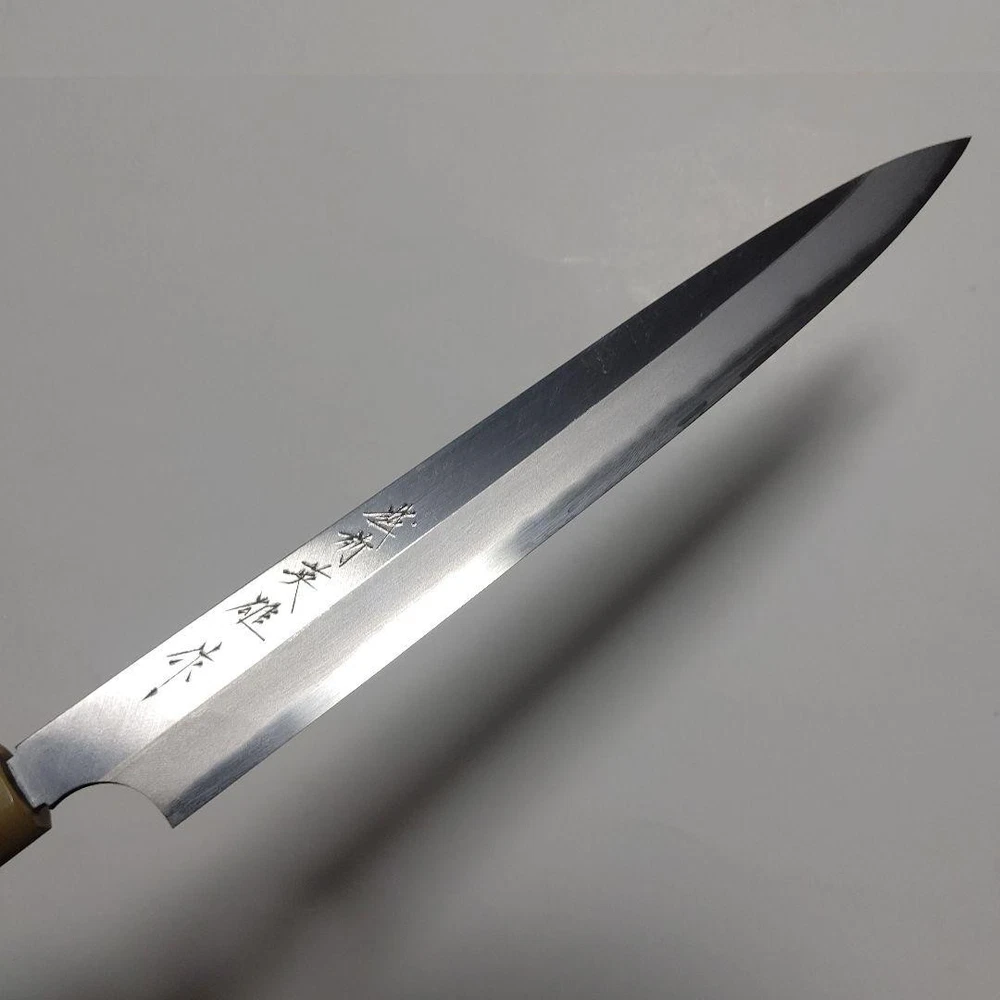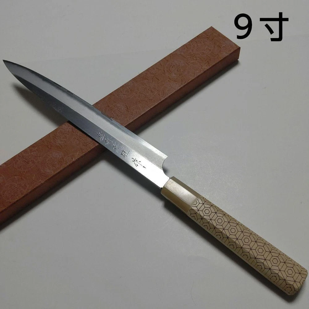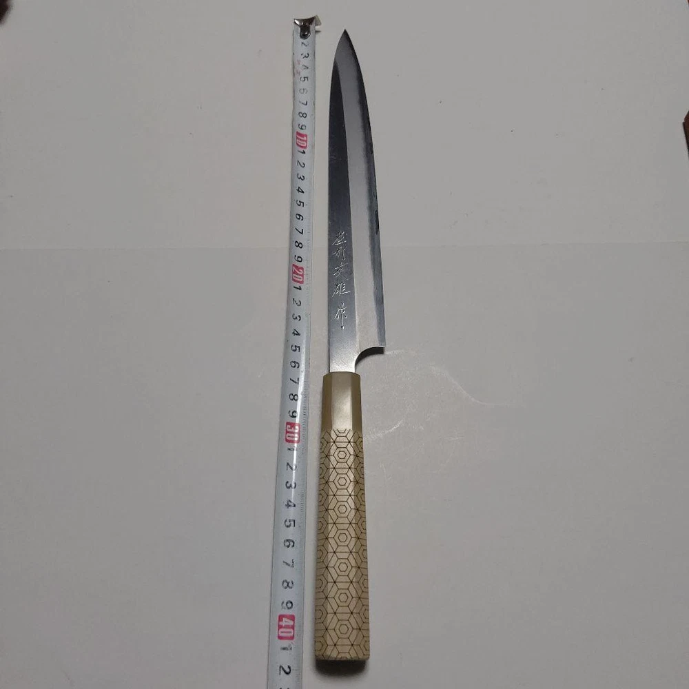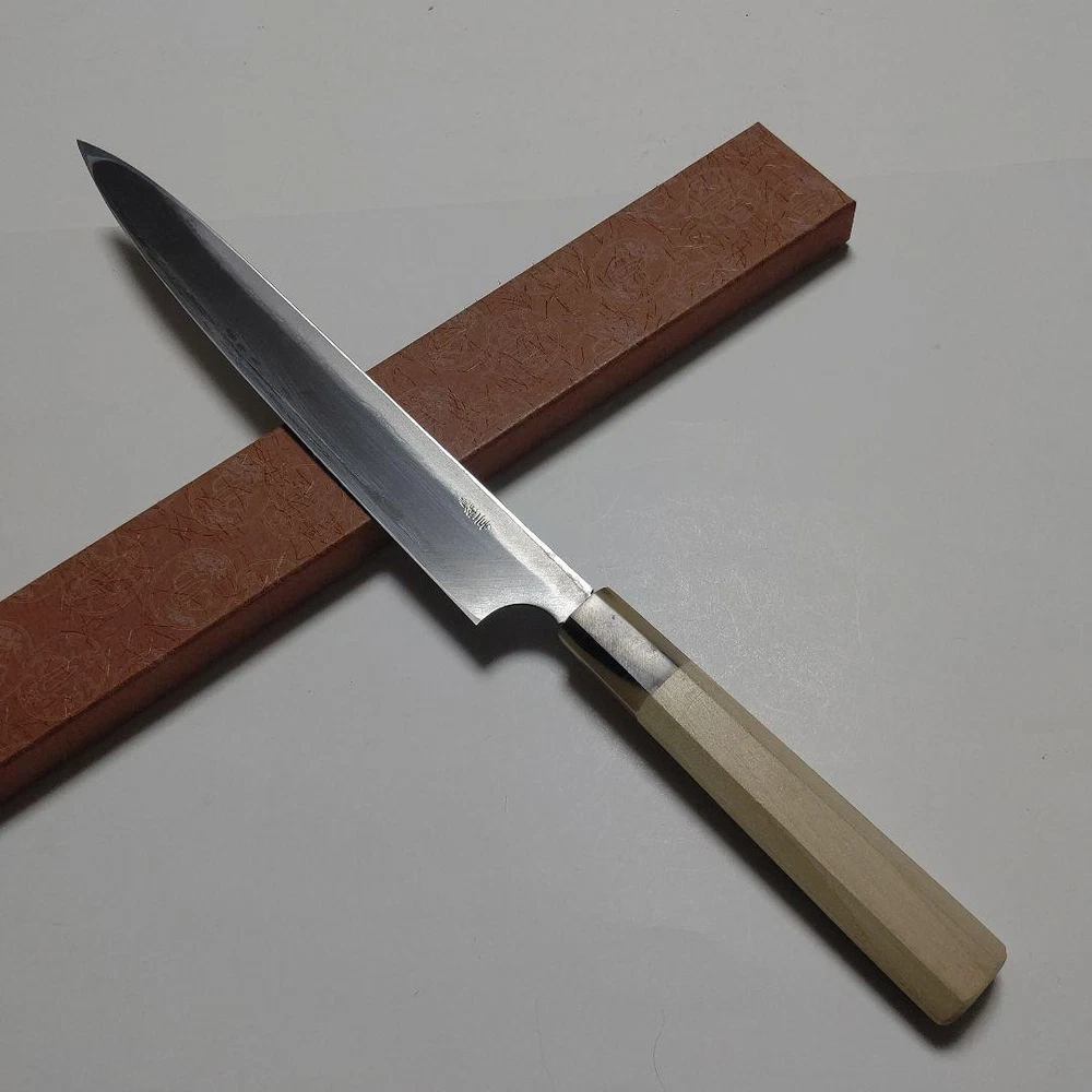 Kitaoka Hideo Yanagiba Knife 9" Blue Steel Single-Edged Octagonal Handle Key Features **Product Description:** - Brand: Kitauka Hamono Seisakusho - Product Type: Single-edged Sashimi Knife - Model: Echizen Hero Knife, 9-inch **Detailed Features:** - Color: Traditional design with a unique tortoiseshell pattern - Material: Blue paper steel, buffalo horn octagonal handle - Size: 9 inches **Condition of the Item:** - New, handcrafted by a traditional craftsman with a history dating back to 1868. Item Specifics: - Item Type: Sashimi Knife - Brand: Kitauka Hamono Seisakusho - Material: Blue paper steel - Handle Material: Buffalo horn - Size: 9 inches - Country/Region of Manufacture: Japan - Year of Manufacture: 2020 Specifications Brand No Brand Country Japan Type Sashimi Knife, Sushi Knife Set Includes Box Material Stainless Steel, Carbon Steel, Metal Color Silver Country/Region of Manufacture Japan Food Compatibility Meat, Universal, Raw fish, Sashimi, Sushi Handle Material Wood Blade Edge Straight Blade Length 9 in ~ Features Japanese-style, kitchen knife, Yanagiba Model Yanagiba Product Description If you feel the price is too high, please make an offer. You can always negotiate the price. Item Title Single-Edged Knife Yanagiba 4 By Kitaoka Hideo Payment Supports managed payments Please pay within 5 days after auction is finished. About Us We are located in Japan. It's our pleasure to make you happy by proposing our recommend item. If you have any questions or request about items, please feel free to ask us. International Buyers - Please Note: -Import duties, taxes, and charges are not included in the item price or shipping charges. These charges are the buyer's responsibility. -Please check with your country's customs office to determine what these additional costs will be prior to bidding/buying. -These charges are normally collected by the delivering freight (shipping) company or when you pick the item up - do not confuse them for additional shipping charges. -We do not mark merchandise values below value or mark items as - gifts - The US and International government regulations prohibit such behavior. Thank you for your understanding.