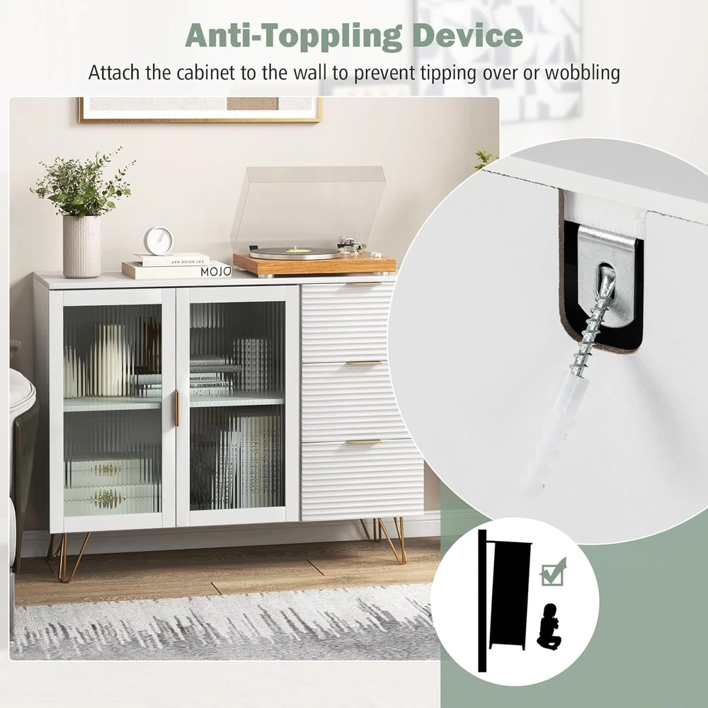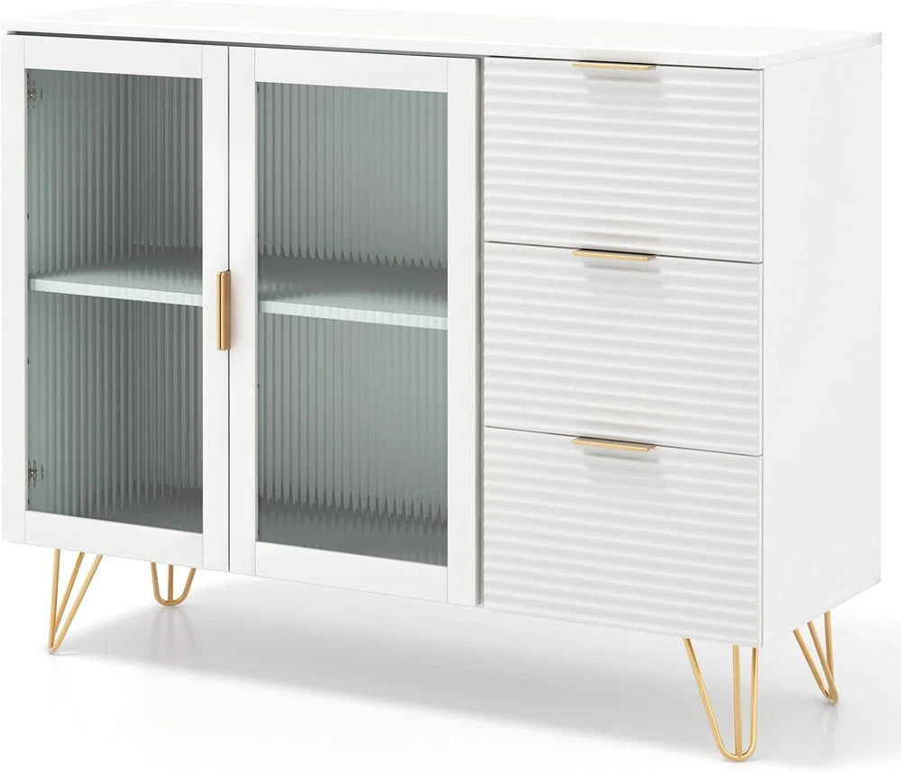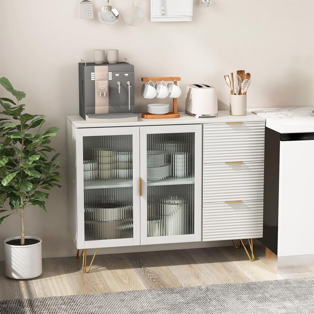 Product Description About this item Ample Storage Space: This kitchen storage cabinet comes with 3 large drawers and a 2-tier storage cabinet, offering generous storage for your household appliances, dinnerware, kitchenware, seasoning, wine, and glass. Besides, the top of the cabinet can also hold decorative items such as potted plants and photo frames. Durable & Safe Use: This buffet server sideboard is made of high quality board with painted surface, which is sturdy and stable for long time use. In addition, the anti-toppling device is served to attach the cabinet to the wall to prevent tipping over or wobbling. Suitable for Various Scenarios: Featuring a modern and elegant style appearance, this kitchen storage organizer seamlessly fits into any space, from the kitchen to the living room and dining room, keeping your belongings organized and within easy reach. More Exquisite Details: Elevate your space with solid metal legs, soft close hinges, and a sleek translucent tempered glass door. These thoughtful details not only enhance the cabinet's appearance but also ensure durability and functionality. Easy Assembly & Simple Clean-up: With simple instructions and provided hardware, this storage cabinet is a breeze to set up. Plus, its smooth surfaces make maintenance quick and effortless, which only needs to wipe it with a soft cloth. Description: Are you looking for a large and elegant kitchen storage organizer? Look no further than our storage cabinet. With its abundance of storage space, our kitchen storage cabinet is perfect for anyone who wants to keep their belongings organized and within easy reach. It comes with 3 large drawers, a 2-tier storage cabinet as well as a large tabletop. Whether you need a place to store your kitchen appliances, dinnerware, or even decorative items, this cabinet has got you covered. Besides, its durable construction ensures that it will stand the test of time, while the anti-toppling device provides extra safety and stability. Plus, the sleek translucent tempered glass doors and elegant metal legs endows this cabinet with elegant appearance, which makes it as a perfect addition to kitchen, living room and dining room. Features: 3 large drawers keep different kinds of goods organized Wide cabinet top convenient to get frequently-used kitchen utensils 2-tier storage cabinet helps to store private and fragile items Made of high-quality board with a painted surface for durability Anti-toppling device ensures safe use by attaching the cabinet to the wall The sleek translucent door endows the cabinet with elegant appearance Solid metal legs and reinforced hinges add extra stability to this cabinet Easy clean-up with smooth surfaces that can be wiped clean with a soft cloth Specifications: Color: White, Gold Material: Engineered Wood, MDF, Metal Overall Dimension: 42.5” x 16” x 33.5” (L x W x H) Drawer Dimension: 13” x 12” x 5.5” (L x W x H) Storage Shelf Dimension: 27” x 15” x 13” (L x W x H) Tabletop Dimension: 42.5” x 16” (L x W) Cabinet Doors Dimension: 27” x 14” (L x W) Net Weight: 82.5 Ibs Load Capacity: 300 lbs Package includes: 1 x Storage Cabinet 1 x User Guide On Aug 14, 2025 at 21:35:59 PDT, seller added the following information:
