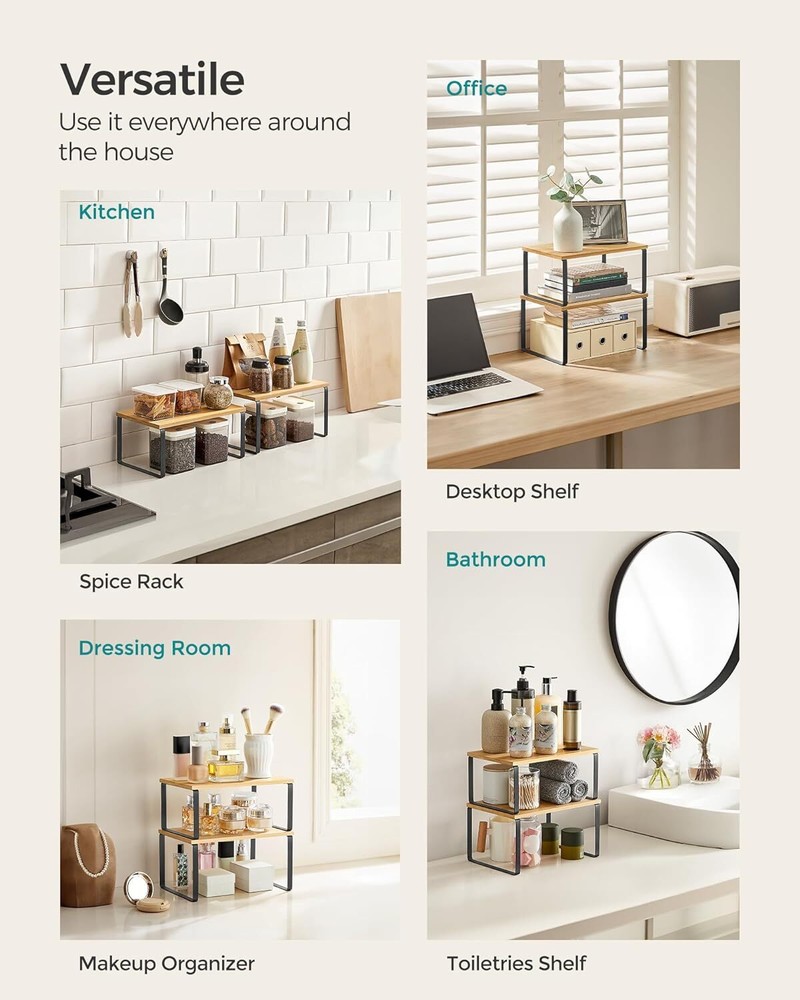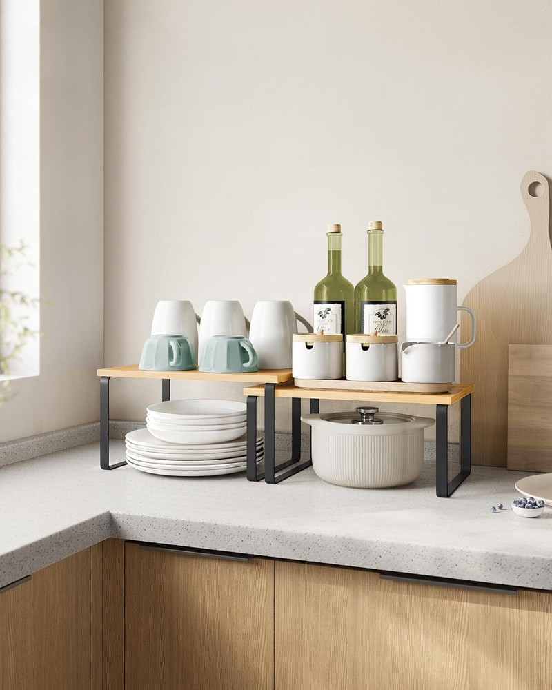 SONGMICS Cabinet Organizer Shelf, Set of 2 Kitchen Counter Shelves, Kitchen Storage, Spice Rack, Stackable, Expandable, Metal and Engineered Wood, Ink Black and Natural Beige UKCS02NB Item Description About this item [Plenty of Storage] Keep your cooking essentials, such as spice jars, containers, cans, cutlery, and cookbooks organized, easily visible, and quick to find with these kitchen organizers and storage. They can also serve as a small food table for cats [Sturdy and Durable] Made of high-quality engineered wood and metal, each spice rack organizer can hold a maximum weight of 33 lb, so you can store loads of supplies on them [Adjustable] With their unique design, with one slightly smaller than the other, these shelf organizers can be stacked on top of one another, nested, used separately, or even in an L-shape. Adjust them how you want to perfectly fit your kitchen space [Versatile] They can be used in more than just the kitchen! Use them in the dining room as a way to elevate your table centerpieces, on your bedroom desk to organize your items, or even in your bathroom to neatly store your bathroom essentials [Easy to Assemble] With their simple structure and included instructions, these kitchen cabinet organizers are easy to set up and use › See more product details *Bamboo Shelf Adds a refreshing natural touch to your space *Nesting Shelves 2 shelves of different sizes can be nested when needed *Strong Support Each shelf can hold up to 33 lb *Large Shelf Size: 7.7"D x 11.7"W x 6.2"H (19.5 x 29.7 x 15.8 cm) *Small Shelf Size: 7.3"D x 11.7"W x 5.4"H (18.5 x 29.7 x 13.7 cm) *Max. Static Load Capacity of Each Shelf: 33 lb (15 kg) 2 shelves of different sizes can be nested when needed Payment Fast and Free Shipping Shipping safe payment via eBay . Return 30 Day's returns