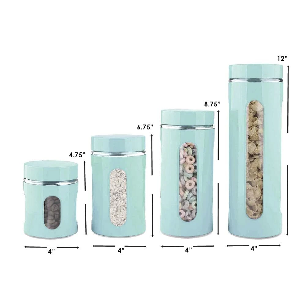 Store candy, sugar, trail mix and more with this 4 piece Canister Set. Made of heavy duty steel, it features a clear window along the center of the base to allow you easily see the contents of each canister. The vibrant finish adds a splash a color to your kitchen and provides a fun way to neatly organize your food. STORES SNACKS, CANDY, AND DRY INGREDIENTS: For all of your loose dry foods that need sturdy storage, use this sturdy set of four canisters to help provide storage. Place coffee beans, rice, flour, sugar, cereal, and candies inside for easy access MADE FROM QUALITY GLASS AND METAL WITH SEE-THROUGH WINDOWS: Each kitchen storage container is crafted from quality glass and a metal finish, with an illuminating finish that adds a bold modern touch to your kitchen. At the fronts of all four of them are clear windows for easily viewing your items. All the canisters are also equipped with twist-off lids that secure your contents PLACE ANYWHERE FOR A RETRO LOOK: These canisters are able to be placed anywhere in your household from a table to the countertop to help provide a stylishly retro look. They can also be stored more discreetly in your pantry or cabinet STORES OTHER ITEMS: Along with food, these pantry organization and storage canisters also provide storage for other items as well. Place pens, pins, clips, hair accessories, and even small jewelry inside for simple storage FOUR DIFFERENT SIZES FOR ALL YOUR FOOD STORAGE NEEDS: Four canisters are included, which vary in different sizes, and whether you are storing a lot or little, you will always have the right canister to accompany you. The capacities for these containers are 2 1/2 cups, 4 cups, 5.5 cups, and 7.5 cups