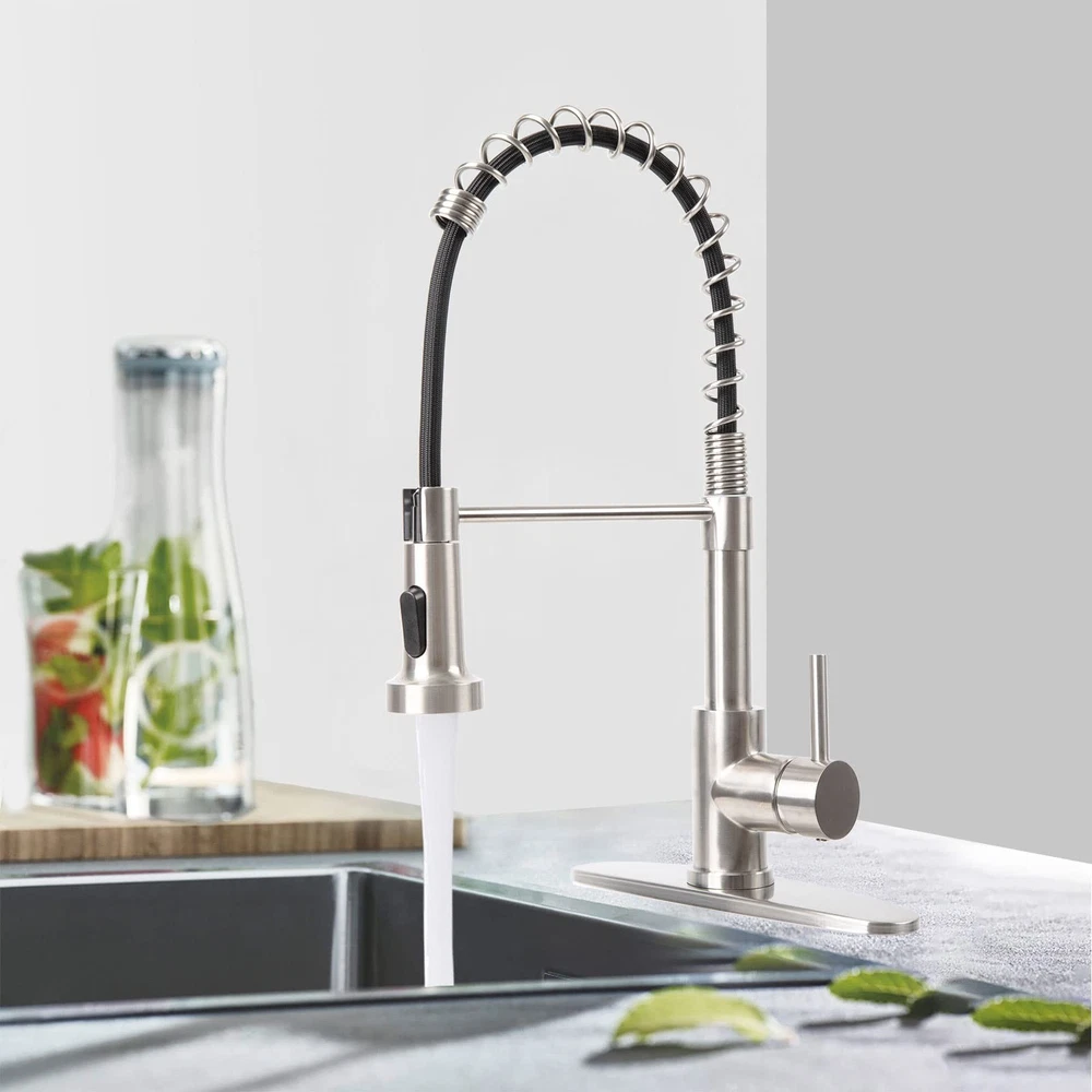 Kitchen Faucet With Pull Down Sprayer Material: 304 Food Grade Stainless Steel Finish: Brushed Nickel Cartridge: Lead-free Solid Brass Cartridge Nozzles: ABS Plastic Materialof Pull down faucet hose: Food-grade PEX Hose and Nylon Braided Outer shell Length of Pull down faucet hose: 19.7 inches Spout Swivel: 360 Degree Sprayer Function: Spray&Stream High-Quality Material: 304 stainless steel, brushed nickel finish, anti-fingerprint, anti-scratch. ABS aerator, lead-free brass cartridge. Stainless steel braided supply hoses, high-temperature and corrosion-resistant. Durable, non-deformable one-piece spring design. 100% lead-free. Pull-Down Design: 19.7-inch pull-out hose, food-grade PEX with nylon braid, no cracking or leakage. Counterweight for automatic retraction. Two-Function Sprayer: Stream mode for gentle, splash-free water filling. Spray mode for effective rinsing, meeting daily cleaning needs. Convenient Use: Single handle for easy water temperature and flow control. 360° rotating sprayer head for enhanced flexibility and convenience. Easy Installation: Includes deck plate, supply hoses, instructions, and 3/8" to 1/2" adapter nut. DIY-friendly installation. 7*24 customer support available.