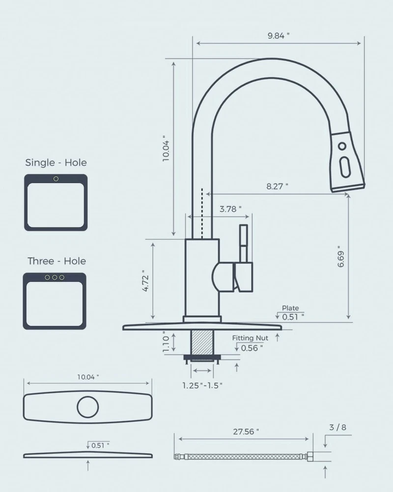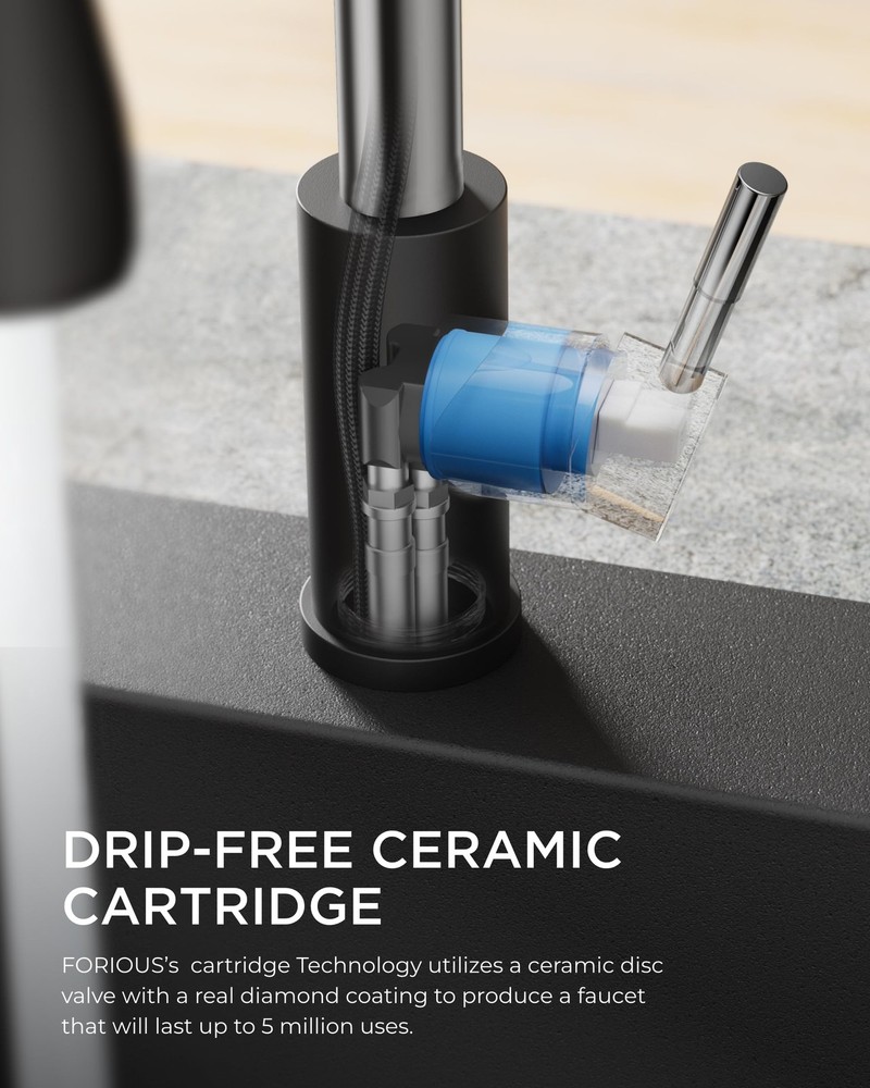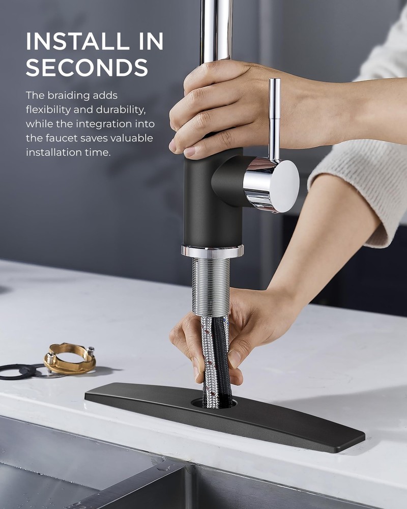 Product Description: Upgrade your kitchen with our premium Kitchen Faucet, designed to enhance both functionality and aesthetics in your culinary space. Crafted with high-quality stainless steel, our sink faucet ensures durability and longevity, making it the perfect addition to any modern kitchen. Key Features: Multiple Spray Options: Easily switch between stream, spray and paused modes for versatile usage. Effortless Operation: Our faucet features a single-handle design for seamless temperature and flow control. Drip-Free Performance: Equipped with advanced technology to prevent leaks and drips, ensuring a hassle-free experience. Sleek Design: The sleek and elegant design adds a touch of sophistication to your kitchen decor. Easy Installation: Designed for quick and simple installation, saving you time and effort. Specifications: Dimensions: 14.76 inches (height) x 10.04 inches (width) x 9.84 inches (depth) Weight: 3.8lb / 1.75kg Number of Holes required: 1-3 holes Compressive Strength: 16Bar Min Supply Pressure: 0.75Bar Installation: Fits USA/CAN standard kitchen sink configurations; easy-to-follow installation instructions included. Superior Quality: Made from lead-free SUS 304 stainless steel, this kitchen faucet features drip-free ceramic cartridges and high-temp PEX hoses that prevent leaks, ensuring durability and safety. Flow Rate: 1.8 Gallons Per Minute, saving 20% water Versatile Functionality: Our kitchen sink faucet combines three spray settings (Stream, Spray, Pause), a high arc, an 18 inch retractable hose, 360° rotation spray head, and a single handle for efficient sink coverage and effortless control Minutes to Install: Install the faucet for kitchen sink in under 15 minutes with no professional help. It features a 10-inch detachable deck plate for one, two, or three-hole sinks and includes all mounting hardware for a hassle-free setup Efficient and Simple Cleaning: The pull down kitchen faucet boasts a five-layer nanotechnology finish, resisting fingerprint and spots, and easy cleaning with a damp cloth for a tidy look —A reliable, cost-effective design Sleek Faucet, Reliable Support: This sink faucet features a minimalist design suitable for any setting and comes with a two-year limited, ongoing parts replacement, and dedicated technical support. Buy with confidence and reach out to us anytime