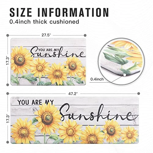 Menu 1. We require immediate payment. 2. We currently accept payment via eBay managed payments only. 3. Once payment is cleared, we will dispatch your shipment within 1-3 business days. Please refer to the "Shipping" tab for more information regarding shipping speed to your destination. Kitchen Floor Mats 2Pcs, Anti Fatigue Kitchen Rugs and Mats Farmhouse Sunflowers Non-Skid Cushioned Floor Comfort Mat for Kitchen, Doorway, Sink, Laundry, 17"x27"+17"x47" Product description Floor Comfort Mat: The kitchen mats for the floor are 0.4" thick, providing cushioned support to relieve fatigue in your feet and legs when standing for extended periods. Experience ultimate comfort and support with our thick kitchen mats. Non-slip Design: Our kitchen floor mat features an anti-slip design on the back, ensuring it stays securely in place and preventing accidents caused by slipping. Enjoy peace of mind knowing our non-slip kitchen mat works perfectly on various surfaces such as wood, ceramic, laminate, marble, and concrete. Easy Maintenance: Our kitchen runner rugs are made of safe and durable high-density material that is oil resistant, stain-resistant, and waterproof. Cleaning and maintaining them is a breeze—simply wipe off dirt or debris with a damp cloth. Say goodbye to stains and foul odors with ease. Versatile Use: These kitchen mats are suitable for a wide range of areas in your home or workplace, including kitchens, offices, bathrooms, and laundry rooms. With a variety of patterns available, finding the perfect one to complement your space is effortless. Package Includes: Our kitchen runner rug set includes two sizes: 17.3"x27.5" and 17.3"x47.2" (44 x 70 + 44 x 120cm). Each rug has a thickness of 0.4 inches (10mm). Prioritize safety by ensuring the floor is dry before using the kitchen rug set to prevent any potential slipping accidents. PLEASE MESSAGE US IF YOU HAVE ANY OTHER QUESTIONS, AND MANY THANKS FOR READING ALL OF THIS. Copyright ©#. All Rights Reserved.
