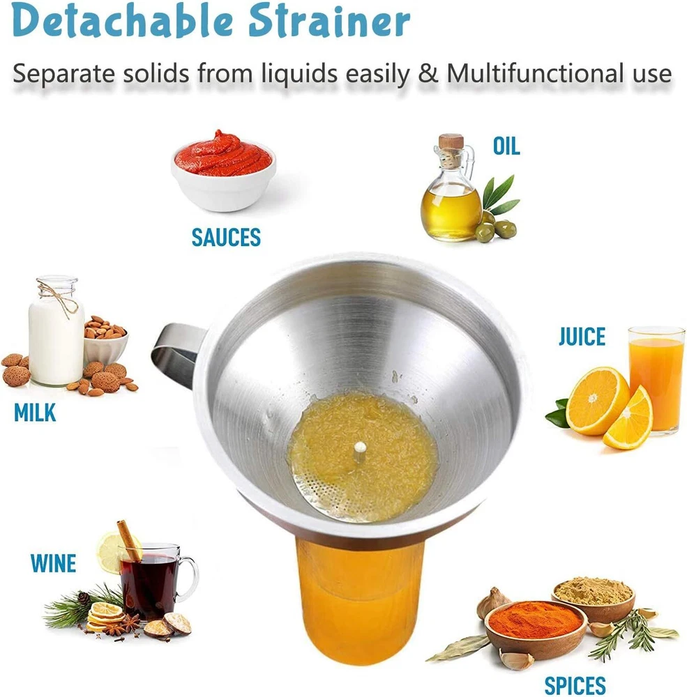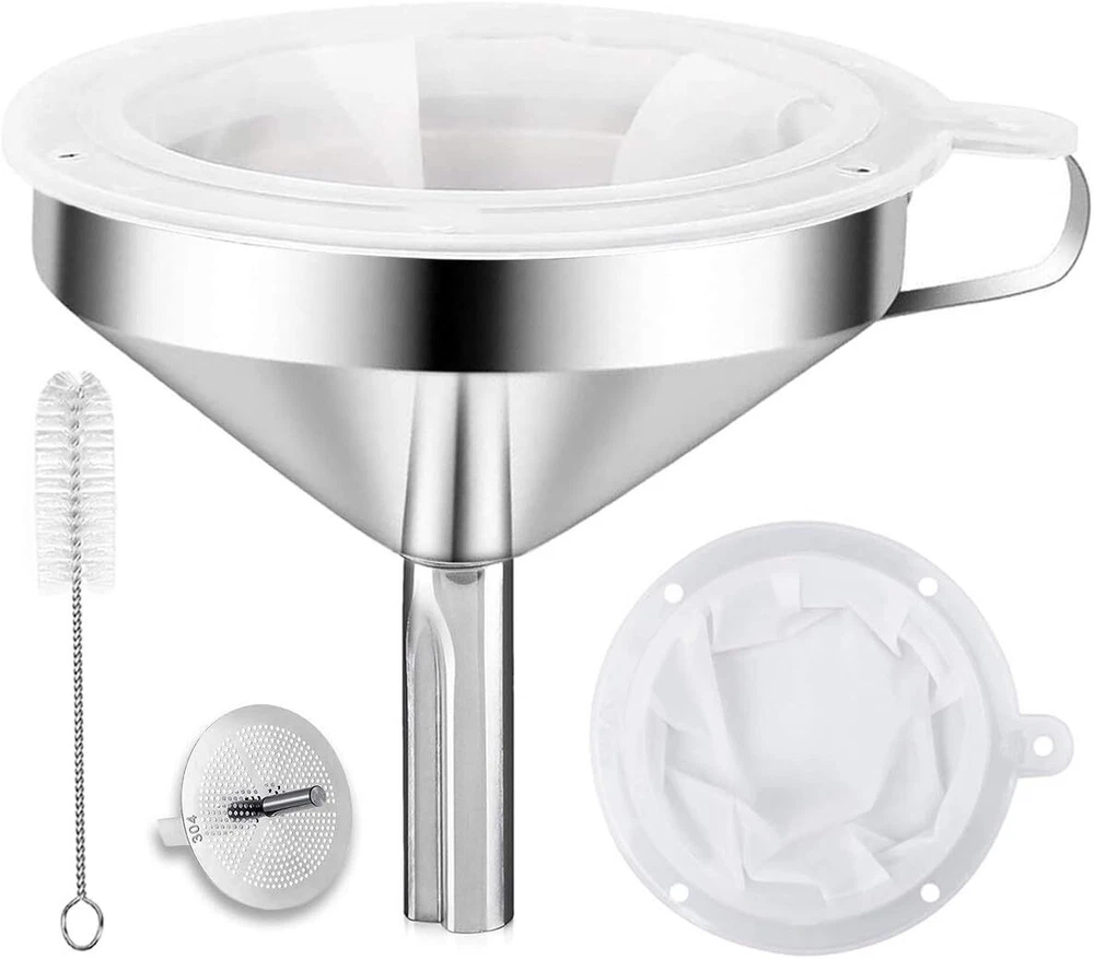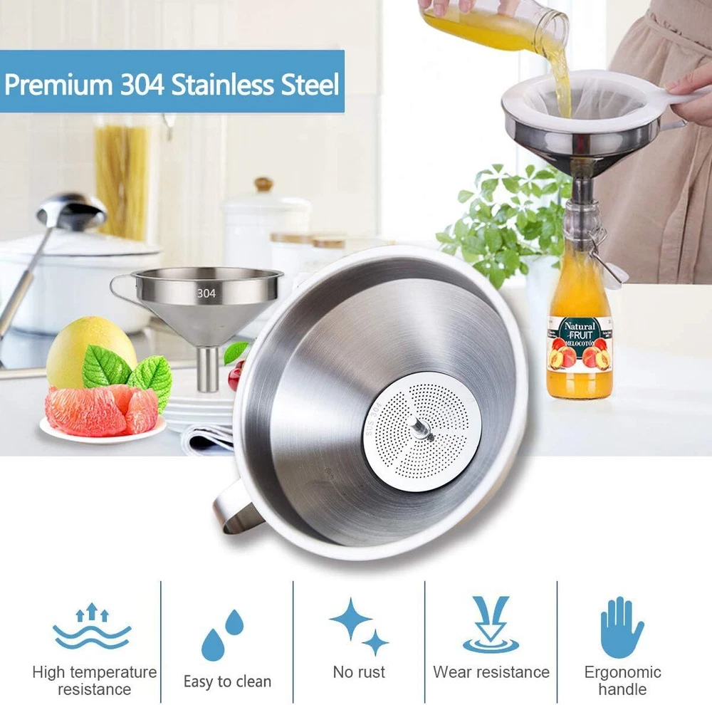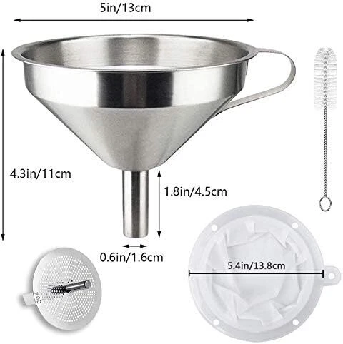 Kitchen Funnel for Filling Bottles, 304 Stainless Steel Food Funnels White Product Details Material: Stainless Steel Brand: HAWOWZ Color: White Manufacturer: HAWOWZ ★Durable Long Lasting: The kitchen funnel is Crafted from 100% food grade high-quality 304 stainless steel. The professional metal funnels resist breaking, bending, rusting and corrosion and stay beautifully and safe with you for years. ★Easy to Clean and Store: Our bottle funnel set is easy to clean, suitable for cleaning in the dishwasher or directly rinsed with water. With a practical handle, prevents slipping, which allows you to hang it anywhere you like, space saving and easy to get. ★Detachable Strainer filter: Features a removable straining filter. Made of 200 fine mesh nylon filters + PP frame, with a fine mesh that helps you to filter the fine grains, ideal for filtering juice, wine, milk, soy milk. ★Multi-Applications: Perfect for filling bottles, adding salt, pepper, herbs or spices into shakers or jars; transferring oils, beer and vinegars into cruets or small decorative bottles for gifts; adding powdered drink mixes into water bottles, etc. ★Perfect Combo Set: Our package includes 1x stainless steel funnel, 1x detachable strainer, 1x 200 mesh filter and 1x cleaning brush, which meets all your daily need. They are superior quality at a very competitive price.