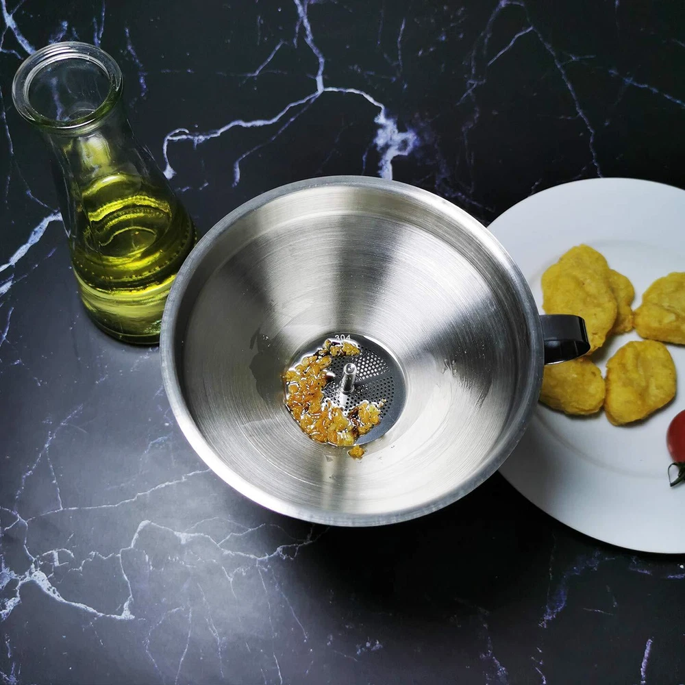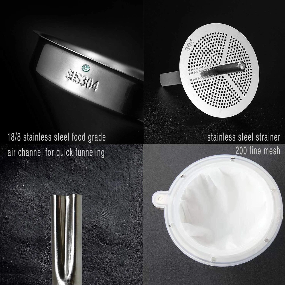 Kitchen Funnel for Filling Bottles, 5 Inch 18/8 Stainless Steel Silver Product Details Product Dimensions : 5 x 5 x 4.33 inches; 4.16 ounces Manufacturer : Voxmude Material: Stainless Steel Brand: voxmude Color: Silver Product Dimensions: 5"W x 4.33"H Wide End Diameter: 5 Inches Healthy, Sturdy 18/8 Stainless Steel Funnel - The kitchen funnel set is made from food grade 18/8 stainless steel that not only gives the products a bright, clean finish, it also makes them sturdy through years of use, with no more concerning of easily denting or cracking with this funnel set, you can count on these funnels to deliver long-term performance and decades of convenient pouring. Save Your Time to Separate Liquids and Solids with 2 Strainers - The stainless steel strainer is a convenient way to filter hot cooking oil, grease or soup. The 200 fine mesh strainer is suitable for filtering juice, coffee, nut milk, soy milk, or cold fryer oil. Easy to Clean and Store - The stainless steel funnel and the detachable stainless steel strainer is completely dishwasher safe, allowing you to spend your time on more important tasks, the ergonomic handle is easy to grip or hang in your kitchens, garages, or utility rooms. The 200 mesh filter strainer is simple to wash with flushing fresh water. Every home and kitchen will benefit from having these handy kitchen gadgets, funnel measures 5 inch mouth/0.63 inch stem. It is good for adding salt, sugar, or spices into shakers or jars, transferring oils into a cruet or small decorative bottles for gifts adding powdered drink mixes into water bottles, and much more. The specially designed dented stem allows the air outflow in order to fill liquids faster. Your satisfaction is our priority pursuit. If you find anything wrong with our products, please let us know. Kitchen Funnel for Filling Bottles, Cooking Oil Funnel with Strainer and 200 Mesh Filter, Tea Grease Juice Food Strainer, 18/8 Stainless Steel Funnel (5 inch Mouth, 0.63 inch Stem)
