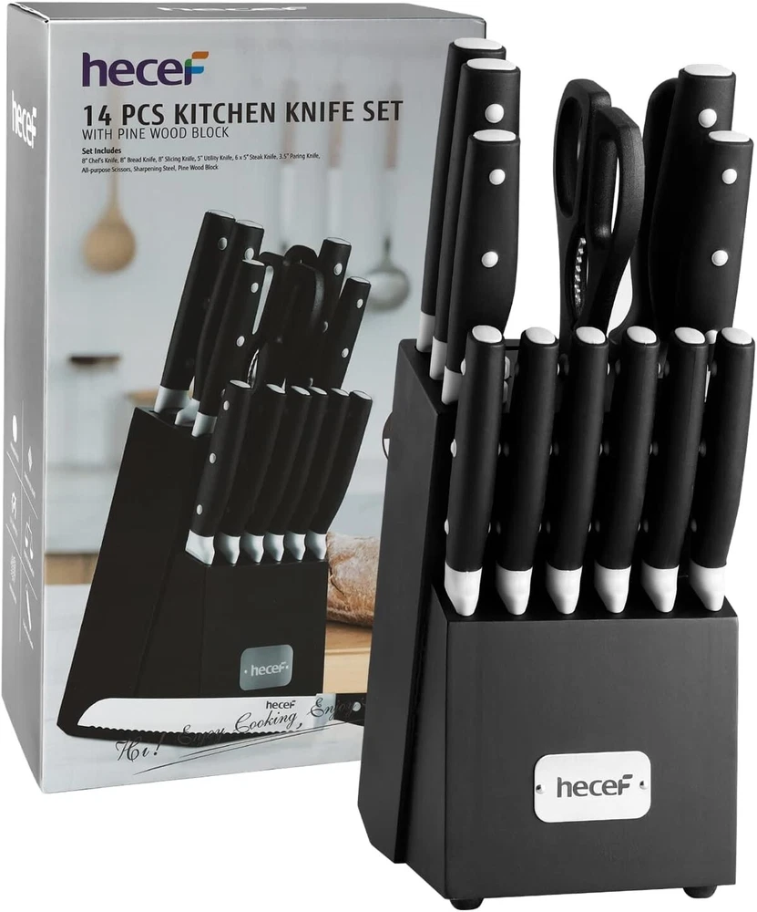 Kitchen Knife Block Set, 14 Pieces Knife Set with Wooden Block & Sharpener Steel & All-purpose Scissors, High Carbon Stainless Steel Cutlery Set (Black) Description: Space-saving Wooden Block: The block is made by pine wood with stylish non-stick black coating, which is odour and stain resistance. A ventilation design was added to the bottom of the knife block, ensuring the water from the blade can be evaporated quickly after cleaning, which strongly protect the blade from being rust and for a long-lasting use. Also, all the knives can be stored in the block, releasing the countertop and saving space for your cooking. Stylish & Ergonomic Handle: Injected with PP+TPR material, this triple riveted handle is sturdy that will never take apart and ensures good kitchen experience. Meanwhile, the color of handles are specially designed to match with our knife block and most of the kitchen. High Carbon Stainless Steel: The knife set is fabricated from quality X30Cr13 stainless steel with a Rockwell hardness of 52±2 for improved corrosion resistance and remarkable durability. Each knife has been precisely constructed to ensure superior grip feeling. Satin Finish: The knife set has been polished with a premium technology that makes it look high-end and more durable to prevent stain attached. After using, please hand wash by water and wipe clean. For longer life, it is recommended not to put in the dishwasher. Decent Choice: This knife set comes with exquisite package. Surprise someone with this delightful kitchen knife set, watching their face light up as they unwrap their unique box. This set can be for New Home, Birthdays, or many other holiday events.