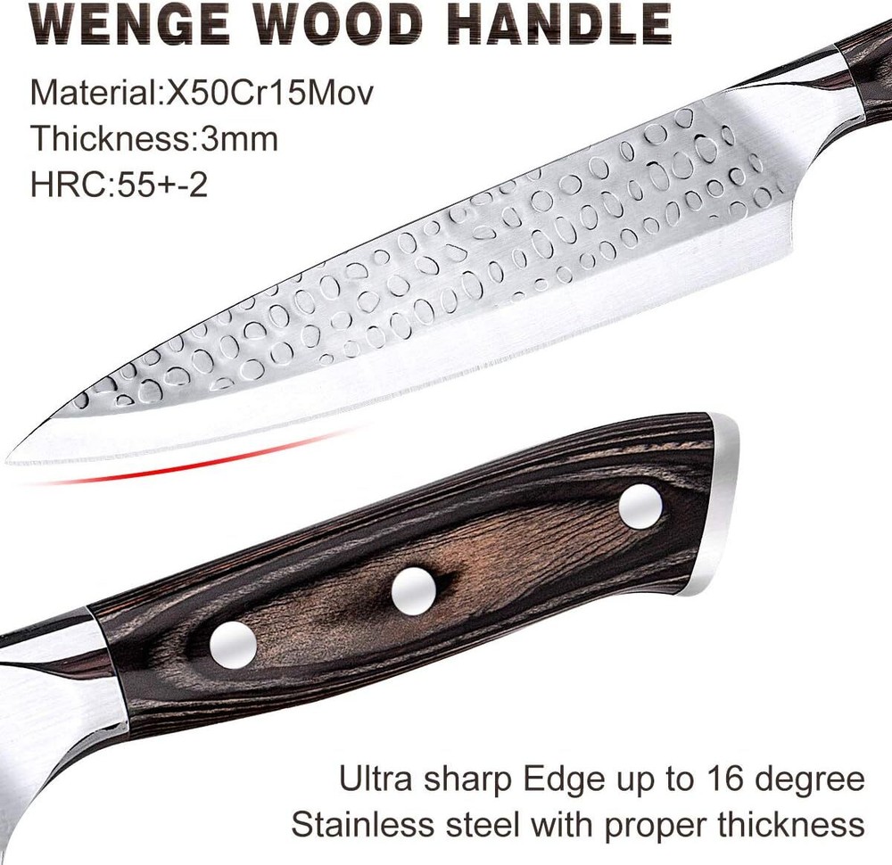 Color Stainless Steel Brand Tudoccy Blade Material High Carbon Stainless Steel Blade Edge Serrated Item dimensions L x W x H 14 x 9 x 5 inches About this item 【Valuable All-In-One Knife Set】 Tudoccy 16-pcs knife set included 8” Chef Knife, 8” Bread Knife, 8” Slicing Knife, 8’’ Knife Sharpener, 7” Santoku Knife, 6.3’’ Carving Fork, 5” Utility Knife, 3.5” Paring Knife, 6 pieces of 4.5” Steak Knives, Kitchen Scissors, and Finger Guard. Carving fork easily pick up and serve all types of meat 【High Quality Kitchen Knife Set】 All knives’ blade is forged from Superior high-Carbon German stainless steel with exceptional corrosion resistance and oxidation resistance. Strong bolster for perfect stability and control. Sharp, sturdy, and practical. No rust, stains, or pitting here. Every knife set is backed by superior quality and under strict quality inspection 【Ergonomic Design】The Unique rivets handle adopt the high-grade wenge wood. Beautiful non-slip handles - classy and timeless look, which wood grain only gets better with age. The curved design handle provides comfort and support. Exclusive taper grind edge technology provides optimum sharpness for precise cutting and is easy to re-sharpen. A perfect mix of design and practicality 【Easy Care & Storage】All knives are well organized into a beautiful Acacia Wooden Block, which could be a perfect kitchen decor while reducing the risk of rusting (Please Don't wash in a DISHWASHER, Hand Wash is highly recommended). Perfect gift for Thanksgiving, Wedding, Birthday, Housewarming Product information Color Stainless Steel Brand Tudoccy Blade Material High Carbon Stainless Steel Blade Edge Serrated Style Unique Item Weight 9 Pounds Is Dishwasher Safe No Handle Material Wood Construction Type Forged UPC 796862273262 Manufacturer Tudoccy Included Components 8’’ Chef Knife, 8’’ Bread Knife, 8’’ Slicing Knife, 8’’ Knife Sharpener, 7’’ Santoku Knife, 6.3’’ Carving Fork, 5’’ Utility Knife, 3.5’’ Paring Knife, 6 pieces of 4.5’’ Steak Knives, Kitchen Scissors, Finger Guard, and a Wooden Block Item Length 14 Inches Global Trade Identification Number 00796862273262 Item Weight 9 pounds ASIN B088KHCNKS Item model number ‎SHP-HS