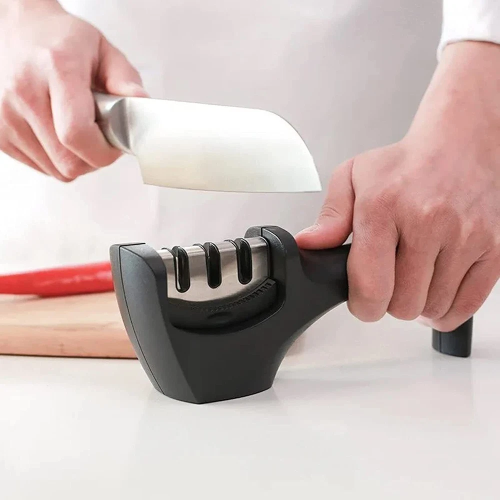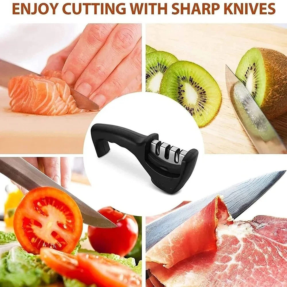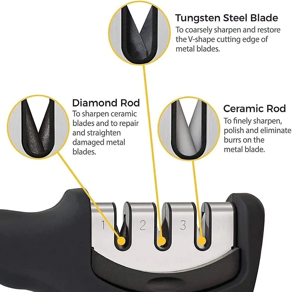 Material Plastic Item weight 320g Item Dimensions LxWxH 21 x 6.5 x 5.6 Centimeters Grit Type Fine About this item 3-step manual knife sharpening system. 1st diamond sharpening rod repairs and straightens damaged blades before. 2nd slot sharpens to restore its V-shape. Finally, the 3rd slot fine tunes for a clean polish. Package includes: 1 x kitchen knife sharpener. HOW TO USE KNIFE SHARPENER : Draw knife in the same direction with slightly downward head but not too much pressure. Do not pull the knife backward and forward. Easy to use tool made from good quality materials for quickly sharpening blunt knives right at home. 3-STEP KNIFE SHARPENING SYSTEM: Knife sharpener ‘s middle tungsten steel slot sharpens knife and restore its V-shape. The both side slots fine tunes for a clean polish. EASY TO CLEAN: Knife sharpener for kitchen has detachable blades section, nife sarper makes it easy to clean. HIGH QUALITY AND DURABLE: The kitchen knife sharpener is made of stainless steel and ABS plastic, which are durable, have a long service life, and can fully withstand the pressure generated during sharpening. Better than knife sharpener rod ANTI SKID DESIGN: knife sharpner ’s non-slip rubber base helps you to keep it in position while sharpening the blades and knife sharpening tool also has ergonomically designed handle for comfortable grip.