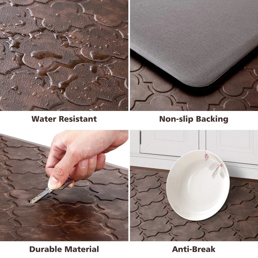 COMFORTABLE AND THICK: the cushioned kitchen floor mat is made from foam and ergonomically engineered to provide comfort; this kitchen runner rugs provides cushioned support to help improve circulation,help relieve discomfort due to long-time standing PREMIUM MATERIALS: the kitchen rugs and mats is made of premium PVC and thick foam that is phathalate-free,latex-free,and smell-free; the mat is constructed with premium strength material to ensure that it will keep shape even with extended and heavy use NON-SLIP BACKING: the anti-fatigue kitchen mat are designed with a beveled edge; its non-slip bottom ensures the mat can keep in place firmly and securely; there is a texture at the water-resistant top area that is helpful to prevent slipping EASY TO CLEAN: the padded kitchen floor mats is easily cleaned when water, stains or oil splashes on the mat; simply wipe off the dirt with a damp cloth or hand-held vacuum as need, and the mat will still look as good as new MULTI-PURPOSE: the standing pad provides an extra large activity area in kitchen, office, or any other high-traffic place; the neutral color any décor and it is a great gift for your family if you take good care of your and well-being NOTE: open kitchen carpet fully place on even, flat, dry floor; water under mat may result in slippage; mat must be placed on dry surface during use