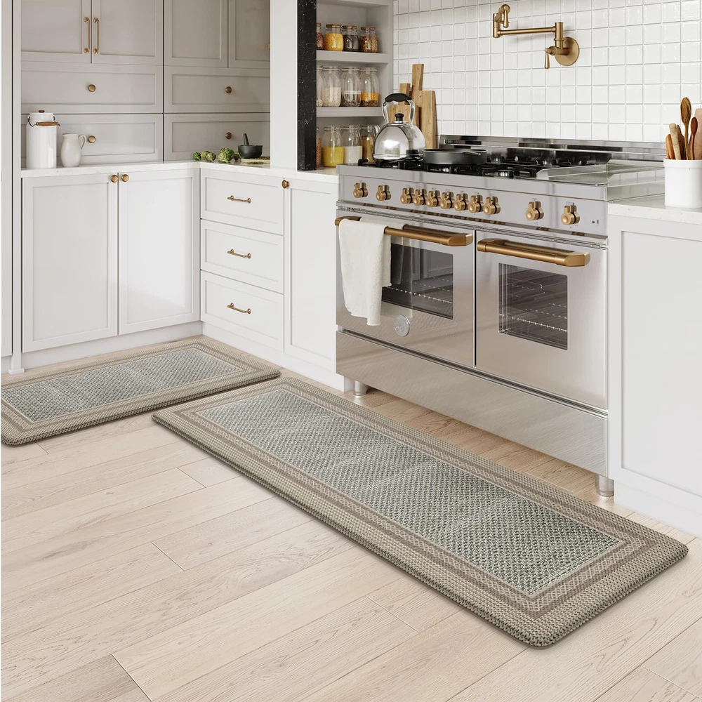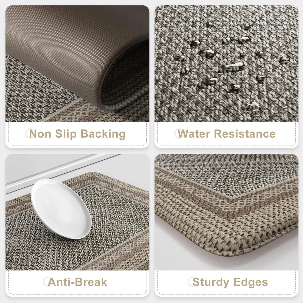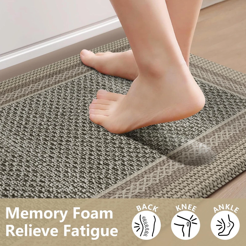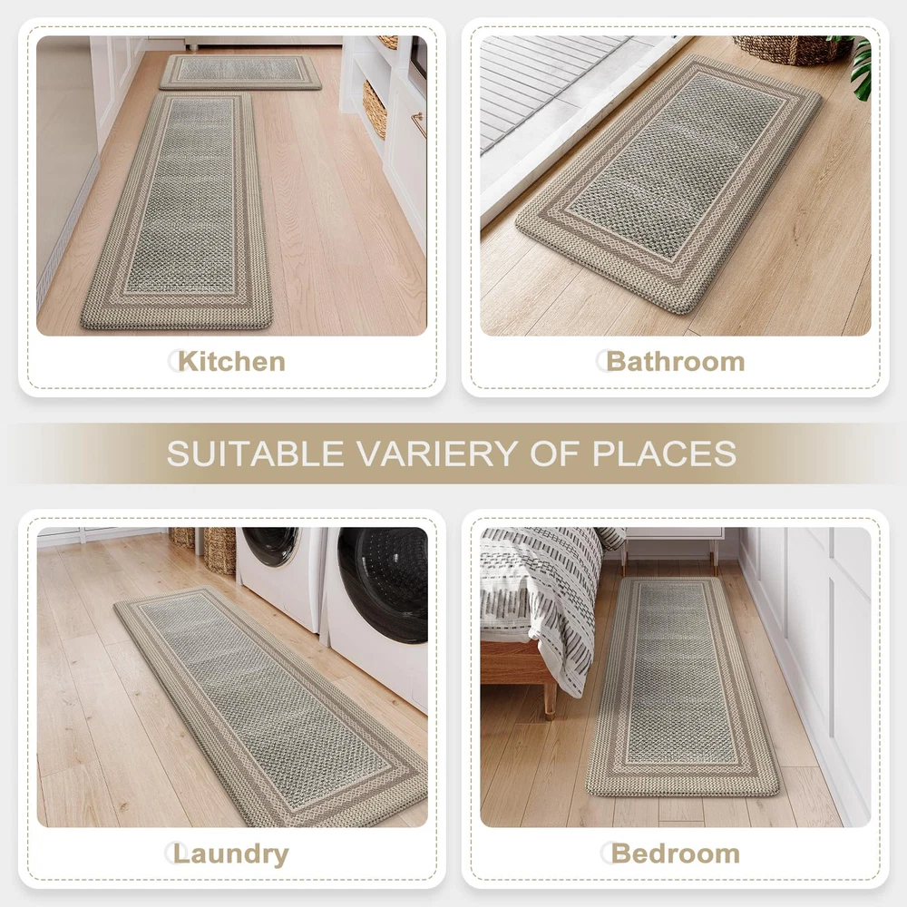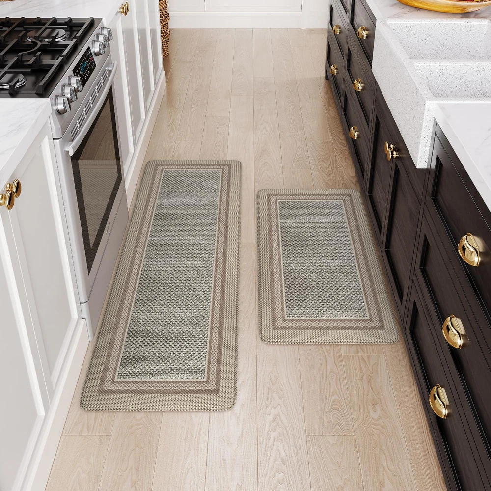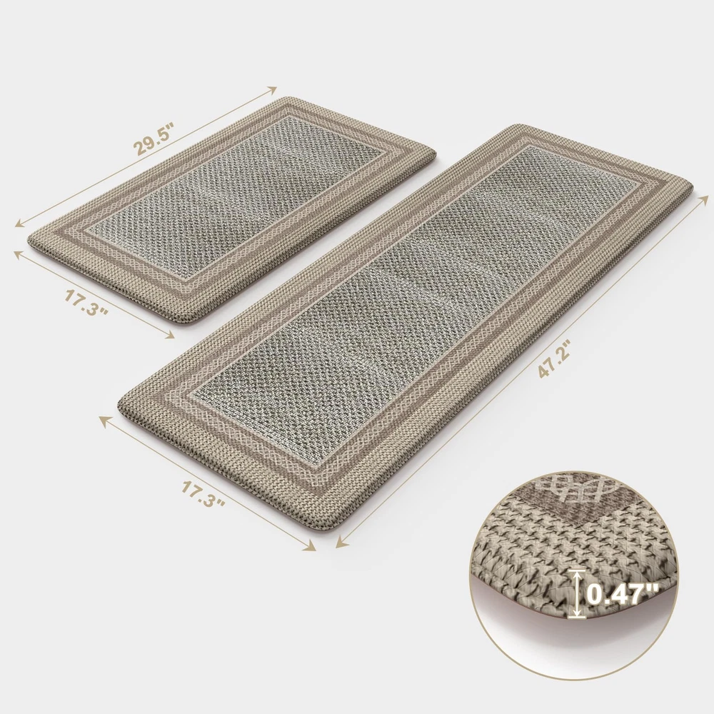 Anti Fatigue & Comfort: The 0.47 inch (12 mm) thick kitchen anti fatigue mat is ergonomically engineered, helping reduce on your feet, joints and lower back, alleviating long-stand fatigue. Stands like walking on clouds, offering a cozy foot feel Non Slip & Safety: Our non skid kitchen mat is crafted with bevelled edge and rubber backing to prevent tripping or slipping and protect the elderly and children. The padded kitchen floor mats can be used on various surfaces(tiles, wood, marble, etc) Waterproof & Easy to Clean: The fatigue mats for kitchen floor is resistant to liquids, oils, and stains, just wipe with a damp cloth, sponges, sweep or vacuum, but not machine washable. High quality surface ensures durability and easy maintenance Versatility: In addition to being used as kitchen decor, it can also be used in diverse places such as laundry room, office, in front of sink, doorway, balcony, etc. The farmhouse kitchen mats for floor is a perfect gift for family and friends Perfect size & Safe material: The kitchen mat set contains 2 rectangular mats (44*75+44*120). Our kitchen rugs are made of premium PVC and thick foam that is latex-free and odor-free. High-quality materials are durable, even with heavy use