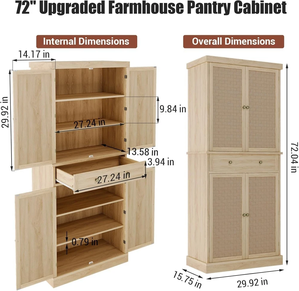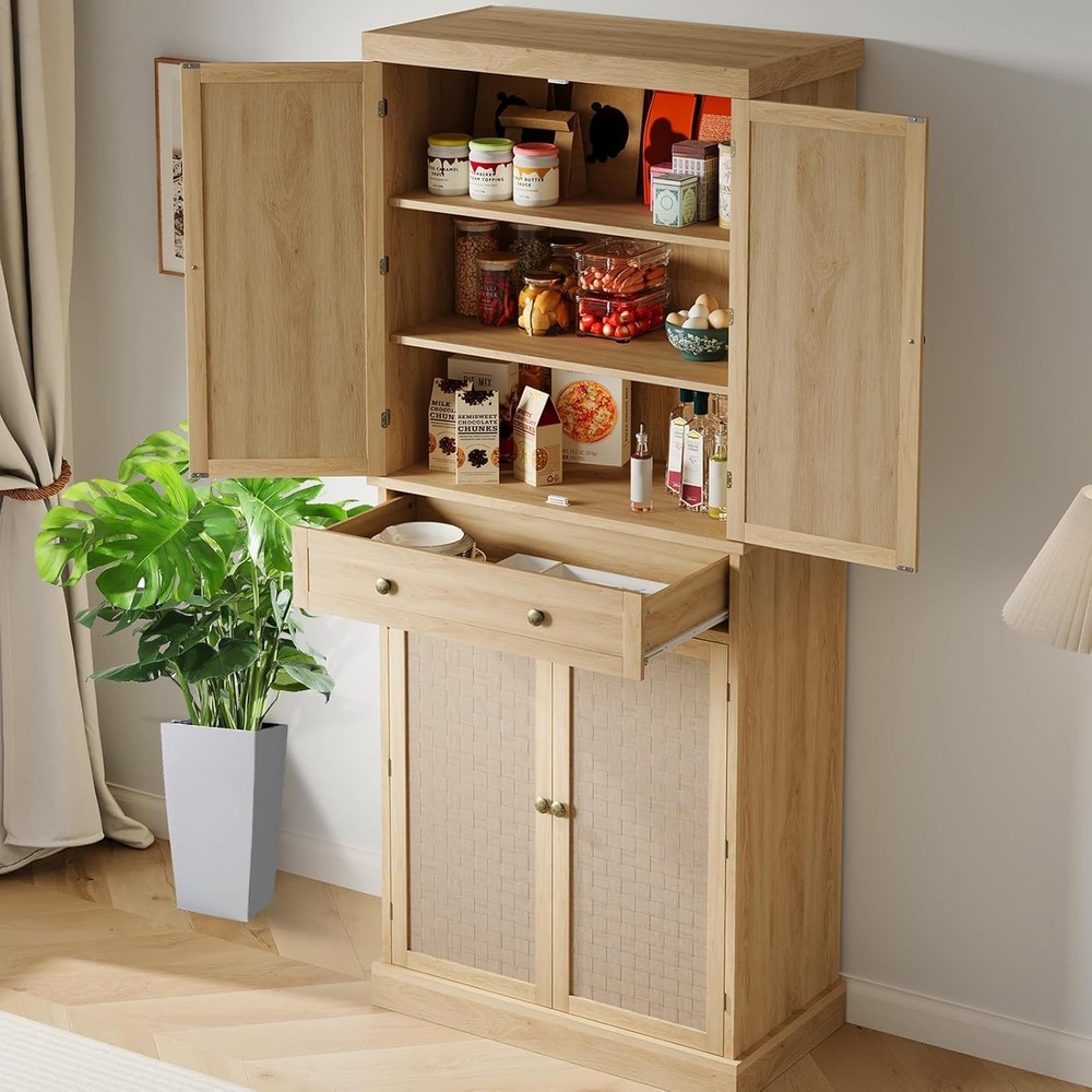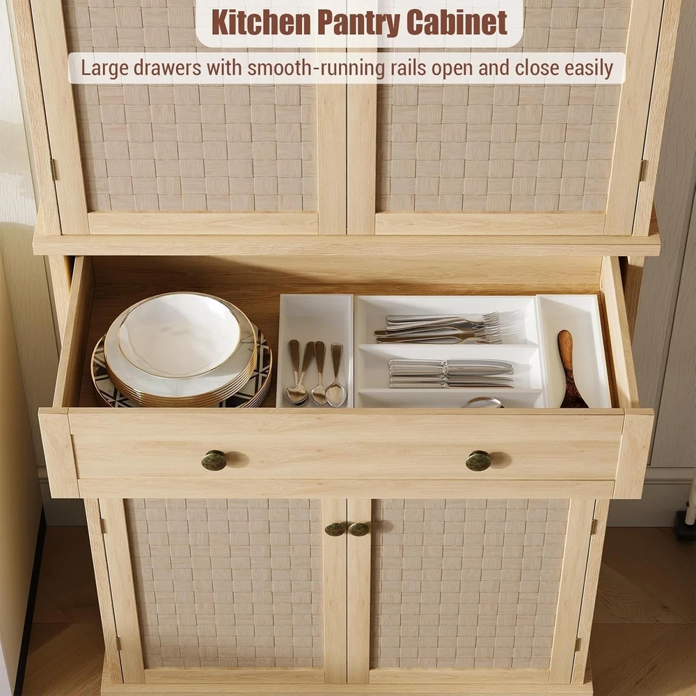 Tall Storage Cabinet Information: Measuring 30" W x 16" D x 72" H, this kitchen cabinet can hold up to 220 lbs overall, with each shelf supporting 22 lbs. It's the ideal choice for anyone seeking durable and functional pantry cabinets for kitchen storage and organization Huge Storage Capacity: This spacious pantry cabinet includes 2 large cabinets, a slide-out drawer, and 4 door shelves, offering ample space to store everything from your food and dinnerware to kitchen appliances, helping you keep your space tidy and organized Versatile Uses: With its farmhouse-style braided strip doors, round metal handles, and sleek design, this tall pantry cabinet complements any kitchen, dining room, living room, or study. It effortlessly blends style with functionality, offering both storage and decoration in one piece Easy Assembly: Each tall cabinet comes with detailed instructions and all necessary parts included for quick assembly, our dedicated customer service team is ready to assist you with any questions or concerns regarding the product Adjustable Shelves: The pantry cabinet comes with 4 adjustable shelves that can be set to 3 different height positions, each holding up to 60 lb. This feature lets you store items of varying sizes, from tall bottles to smaller kitchen tools, ensuring flexibility for all your kitchen storage needs