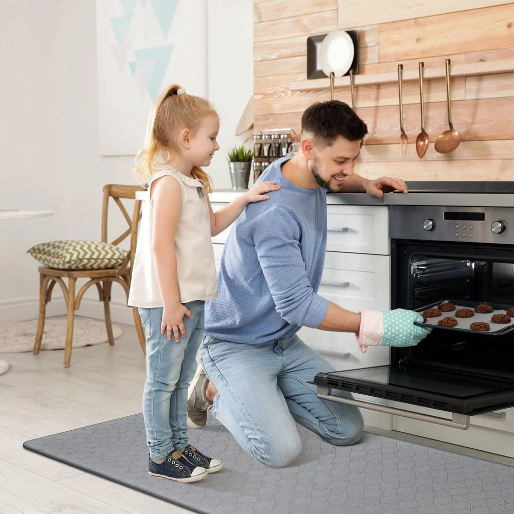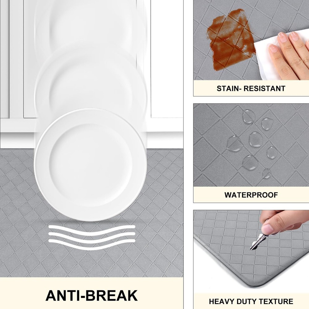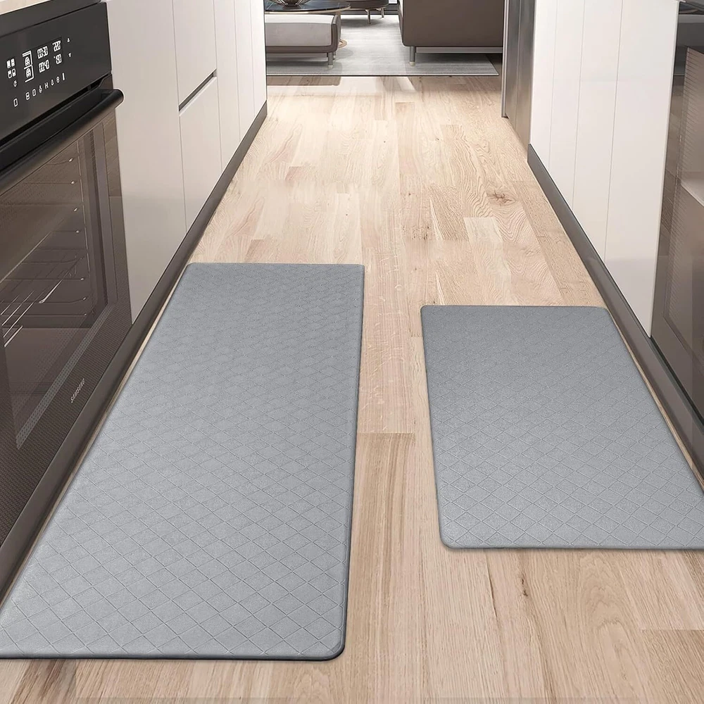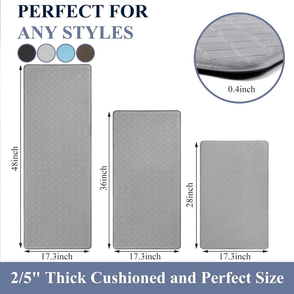 Anti Fatigue Kitchen Mats for Floor 3 Piece Set: Our farmhouse antifatigue kitchen mat and runner set measures 17.3''x28''+17.3''x 36''+17.3''x 48''.The comfort standing mat with runner are made of premium PVC materials,which is not easily deformed Comfort Anti-fatigue Mats for Kitchen Floor: 0.4'' thick cushioned anti fatigue kitchen floor mats are ergonomically engineered,so thick and cushioned that you are able to stand comfortably while working in the kitchen or at any work station Non Slip Kitchen Rug Set: Backing of the anti fatigue gel kitchen mat set is made of non-slip material;also beveled edges help prevent tripping.Please clean the floor before use.Clean and dry surface will be conducive to the kitchen mats slip resistant Waterproof Kitchen Rugs Set of 3: If the kitchen rug runner set gets dirty,just simply wipe clean with a damp cloth or sponge in a timely manner,or use any common household cleaner to clean.Please do not put it in the washing machine Versatile Cushioned Kitchen Rugs and Mats Set: Cushioned kitchen floor carpet set provides ample support for standing in kitchen, kitchen sink, stove, laundry room, office, farmhouse or any other high-traffic indoor or outdoor space