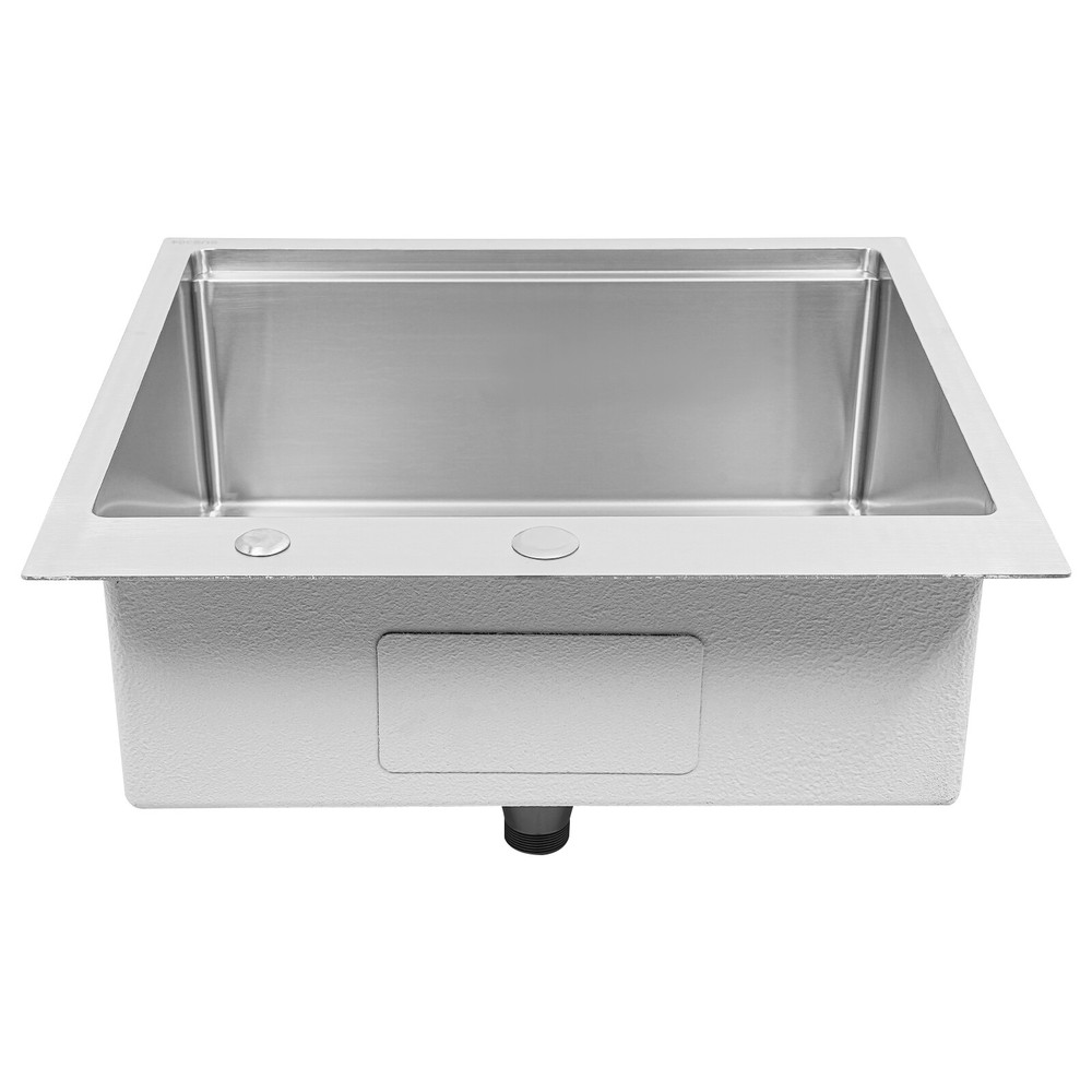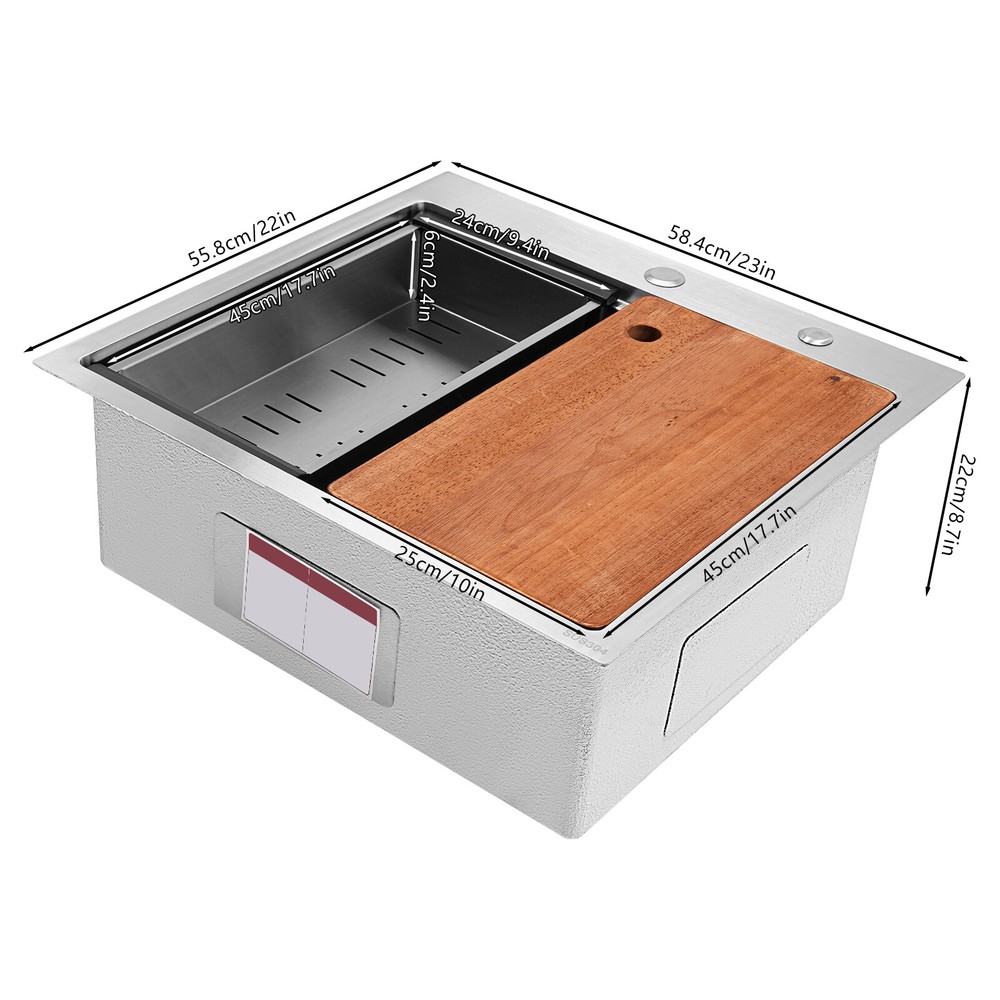 Specification Material: 304 Stainless Steel Color: Silver Style: Modern Process: Brushed Shape: Rectangular Mount Type: Topmount, Undermount, Flushmount Assembly Required: Yes Thickness: 100mm/0.39in Drain Hole Diameter: 8.9cm/3.5in Cutting Board Size: 45*25cm/17.7*10in Drainage Frame Size: 45*24*6cm/17.7*9.4*2.4in Product Size: 58.4*55.8*22cm/23*22*8.7in Package Size: 63*50*28cm/24.8*19.69*11.02in Gross Weight: 11kg/24.25lbs Net Weight: 10.2kg/22.49lbs Package Included 1* Stainless Steel Kitchen Sink 1* Cutting Board 1* Bottom Rinse Grid 1* Strainer 1* Drainage Frame 1* Roll-up Dish Drying Rack All Accessories for Use Kitchen Sink 23 x 22 Inch Drop-in Bar Sink Stainless Steel Topmount Kitchen Sink Description Made of high-quality 304 stainless steel, this kitchen sink is exquisitely crafted, wear- resistant , and corrosion- resistant . Its enlarged and deepened sink not only alleviates the splashing problem but also increases space utilization for cleaning numerous cookwares. The design with a cutting board, bottom rinse grid, roll-up dish drying rack and drainage frame allows you to wash and cut fruits and vegetables simultaneously, with which you can enjoy a more convenient life. Key Features Strong and Durable: Made of premium 304 stainless steel through the brushed process, it is corrosion and heat- resistant and will remain as good as new for a long time, even in the face of frequent daily use and all kinds of kitchen utensils collision. Space Optimization: The workstation sink is designed to hold the cutting board and drainage frame on a single track, maximizing the available space on the countertop. Large Capacity: Its large size ( 23*22in ) allows you to clean large amounts of plates, dishes, and pots, and wash fruits, and vegetables at one time without splashing, saving time. Life Assistant: This sink with a cutting board, bottom rinse grid, roll-up dish drying rack and drainage frame cleverly combines washing and meal preparation functions, allowing you to enjoy a convenient life. Invisible and Beautiful: It supports three mount types: top mount, flush mount, and under mount, which will not affect the aesthetics when the sink is flush with the countertop, and the smooth lines and low-key silver-colored appearance can also add a touch of simplicity and elegance to the kitchen. Hassle-free Cleaning: The brushed surface is not easy to leave marks, you can remove surface dust and grease by wiping with a damp cloth and detergent (not included). User Friendly: The rubber mute mat can effectively reduce the noise generated by the faucet water release and the collision of dishes, creating a quiet kitchen environment. The anti-condensation coating effectively prevents excessive temperature differences and protects the cabinet from moisture. Rapid Drainage: The X-shaped water guidelines and enlarged 3.5-inch drain hole help drain water quickly. The equipped drainage frame also ensures that the kitchen is dry and hygienic. Customer Service: We aim to provide quality products and services. If you have any problems, please feel free to contact us. We will reply to you and solve the problem for you as soon as possible. Details Rounded Corners: They are not easy to leave hygiene blind spots, making it convenient for you to clean the sink. Bottom Rinse Grid: With protective covers, it can prevent scratches on the kitchen utensils and sink. Utensils can be placed on the rinse grid for fast drainage. Roll-up Dish Drying Rack: It facilitates you to quickly clean your cookware and drain the bowl quickly to prevent bacteria growth. Hanging Hole: It is convenient for you to hang the cutting board freely in your kitchen after use to keep it dry and hygienic. Application It can be widely used in homes, restaurants, laundries, basements, bars, kitchens, food trucks, dessert stores, coffee shops, hotels, garages, gardens, etc. for washing dishes and cutting vegetables and fruits. Specification Material: 304 Stainless Steel Color: Silver Style: Modern Process: Brushed Shape: Rectangular Mount Type: Topmount, Undermount, Flushmount Assembly Required: Yes Thickness: 100mm/0.39in Drain Hole Diameter: 8.9cm/3.5in Cutting Board Size: 45*25cm/17.7*10in Drainage Frame Size: 45*24*6cm/17.7*9.4*2.4in Product Size: 58.4*55.8*22cm/23*22*8.7in Package Size: 63*50*28cm/24.8*19.69*11.02in Gross Weight: 11kg/24.25lbs Net Weight: 10.2kg/22.49lbs Package Included 1* Stainless Steel Kitchen Sink 1* Cutting Board 1* Bottom Rinse Grid 1* Strainer 1* Drainage Frame 1* Roll-up Dish Drying Rack All Accessories for Use Notes Please check the style and size before purchasing. Please do not scratch its surface with sharp objects to prolong its service life. If you want to get a better installation effect, we suggest you ask professional workers to install it. Please allow the slight color difference caused by the shooting light and 1-3cm error due to manual measurement and make sure you do not mind before ordering. Payment Delivery details Terms of sales About us Contact us Payment We accept ebay payment 。 Fees such as import duties, taxes are not included in the item price or shipping costs. These charges are the buyer's responsibility. Delivery details Shipping: 2-9 working days to: USA Terms of sales We maintain high standards of excellence and strive for hundred percent customer satisfaction. Feedback is very important to us. We hope that you contact us immediately before you give neutral or negative feedback, so that we can address your concerns. It is impossible to address issues if we do not know about them! About us Your satis faction is our ultimate goal. We work hard to earn your trust and future business. Our certified technicians have tested each item before shipping. The unit comes with 1 year limited warranty on all manufacturing defects. a) If you receive a defective item, you may return it or ask for a discount. Please contact us within 14 days after you receive the package. b) What you returned must be intact 