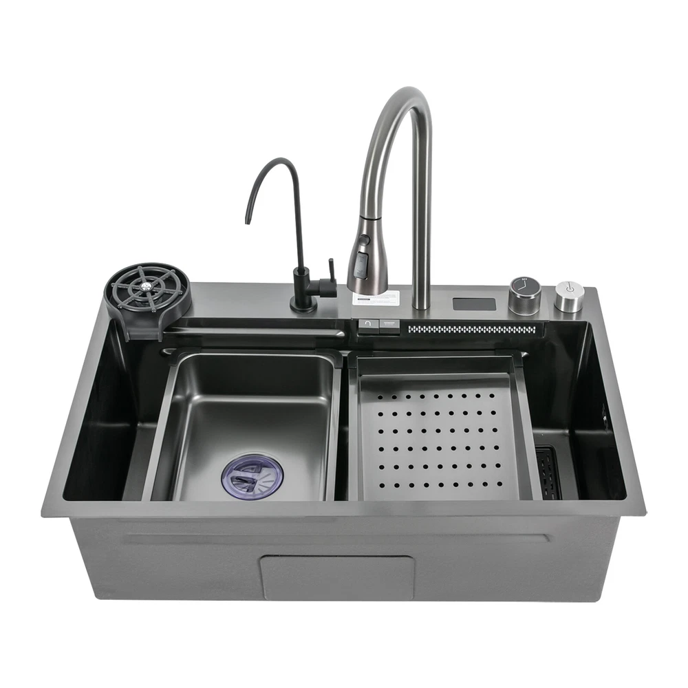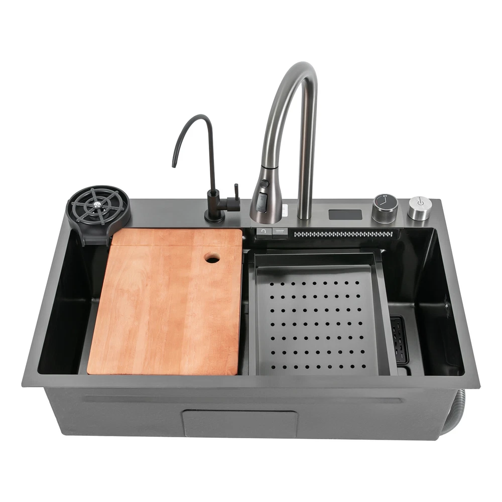 πππ Welcome to Interview888 πππ Welcome to our store~ Description This 201 stainless steel sink adopts a nano-electroplating process, with exquisite workmanship, which is wear-resistant and corrosion-resistant. Its enlarged and deepened sink not only alleviates splashing problems but also increases space utilization for washing large quantities of cookware. It can not only be used as a traditional sink but also can hold a cutting board for chopping vegetables and meat. With it, you can enjoy a more convenient and healthier life. Key Features Build to Last: The premium 201 stainless steel, as well as the exquisite nano-electroplating process, make this product wear-resistant, heat-resistant, corrosion-resistant, and not easy to rust and deform, ensuring a long service life. Large Sink Size: It is large (29.5*18.1*7.9 inches) and can accommodate a large number of plates, dishes, and pots at once. Moreover, it prevents splashing when washing fruits and vegetables. Washing Assistant: The 360Β° pull-out faucet, three water dispensing modes, and the waterfall spout make the product a wide range of cleaning and more convenient to use. The smart temperature display allows you to easily monitor water temperature and improve the safety of use, and the hydroelectric design doesn't require an external power supply, which is energy-saving and efficient. Humanized Design: The anti-condensation coating prevents condensation in the sink and thus prevents moisture in the kitchen cabinets, and sound-deadening pads reduce noise. Additionally, the right-drain design effectively increases the utilization of cabinet space underneath the sink. Multi-functional: The double-rail design of this sink helps you achieve efficient cooking. It converts into a work platform with the flexibility to place the mobile cutting board and draining basket without taking up countertop space, which greatly saves your workspace and makes it easier and more efficient for you to wash vegetables and dishes. Quick Drainage: It has deflector slots at the bottom for good drainage, effectively preventing water from accumulating inside. It comes with a convenient knob, removable strainer, and a large-diameter drain that allows large amounts of water to drain quickly while preventing food debris from clogging the pipes. Easy Installation: The simple structure and complete set of mounting accessories allow for fast and accurate installation. In addition, different mounting methods can meet your different needs. Easy to Clean: The smooth surface and round corner allow you to easily clean it without leaving dead corners of dirt accumulation. Ideal Gift: This product is stylish and high-quality and can be used as an ideal housewarming, birthday, and holiday gift for parents, friends, and loved ones. Good Customer Service: We stand behind all our guests and look forward to assisting you with your purchase. It is our pleasure to answer your confusion and questions. The end of the story between us is not "we sell and you buy". Details High-pressure Cup Washer: With it, you can operate with one hand, cleaning cups faster and more convenient, while freeing your hands. Water Purification Faucet: The product comes with a separate water purification faucet, and you can connect it to a water purifier (not included) for clean water. Narrow Edge: This design saves space and meets a variety of installation methods. Drain Pipe: It can be bent freely to suit the installation position, reducing restrictions on use. Arcs Shape: The rounded and smooth edges not only add to the aesthetics of the product but also improve the safety of use. Application This product can be widely used in homes, restaurants, laundry rooms, basements, bars, kitchens, food trucks, dessert shops, coffee shops, hotels, garages, gardens, pet shops, etc. for cleaning tableware, vegetables, fruits, pets, etc. Specification Color: Black Style: Modern Shape: Rectangular Material: 201 Stainless Steel Process: Nano-electroplating Assembly Required: Yes Cold Water Pipe Length: 60cm/ 23.62 in Hot Water Pipe Length: 60cm/ 23.62 in Downpipe Length: 60cm/ 23.62 in Faucet Height: 40cm/ 15.7in Sink Size: 75*46*20 cm/ 29.5*18.1*7.9 in Gross Weight: 12kg/ 26.46 lbs Package Size: 81*52*28 cm/ 31.89*20.47*11.02 in Package Included 1* Sink 1* Digital Pull-out Faucet 1* Cutting Board All Accessories for Installation Notes Please note that the main water outlet switch needs to be turned off after each use. Please do not let soft iron, hard or rusty objects contact with the sink for a long time. Please do not wash items in the sink with strong acids and bases. Please clean the sink after each use and wipe it dry. Please allow the slight color difference caused by the shooting light and the 1-3 cm error due to manual measurement, and make sure you do not mind before ordering. Payment Delivery details Terms of sales About us Contact us Payment We accept ebay payment γ Fees such as import duties, taxes are not included in the item price or shipping costs. These charges are the buyer's responsibility. Delivery details Shipping: 2-9 working days to: USA Terms of sales We maintain high standards of excellence and strive for hundred percent customer satisfaction. Feedback is very important to us. We hope that you contact us immediately before you give neutral or negative feedback, so that we can address your concerns. It is impossible to address issues if we do not know about them! About us Your satis faction is our ultimate goal. We work hard to earn your trust and future business. Our certified technicians have tested each item before shipping. The unit comes with 1 year limited warranty on all manufacturing defects. a) If you receive a defective item, you may return it or ask for a discount. Please contact us within 14 days after you receive the package. b) What you returned must be intact and in its original packaging as re? u. Customer is responsible for shipping costs of the returned item. c) We wi