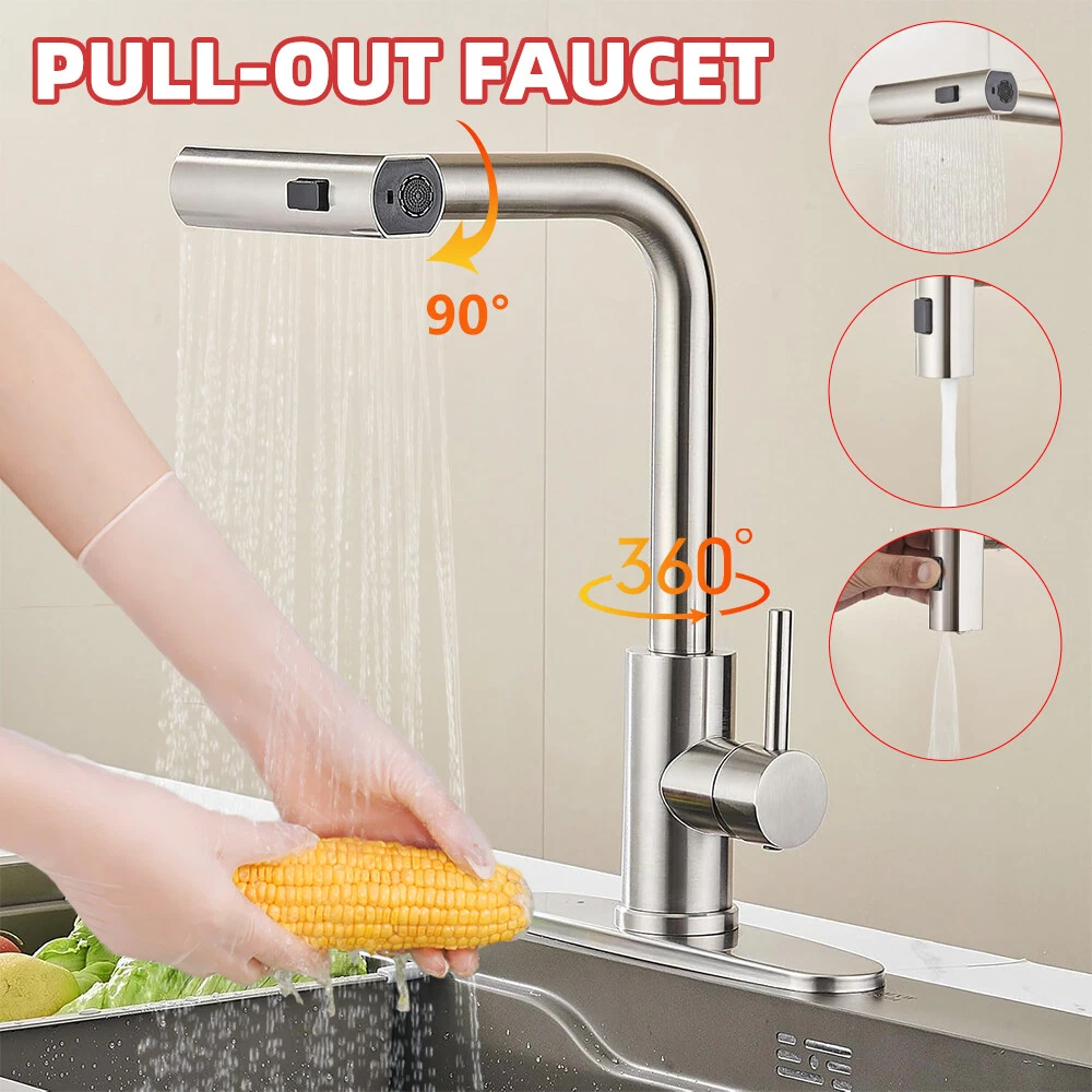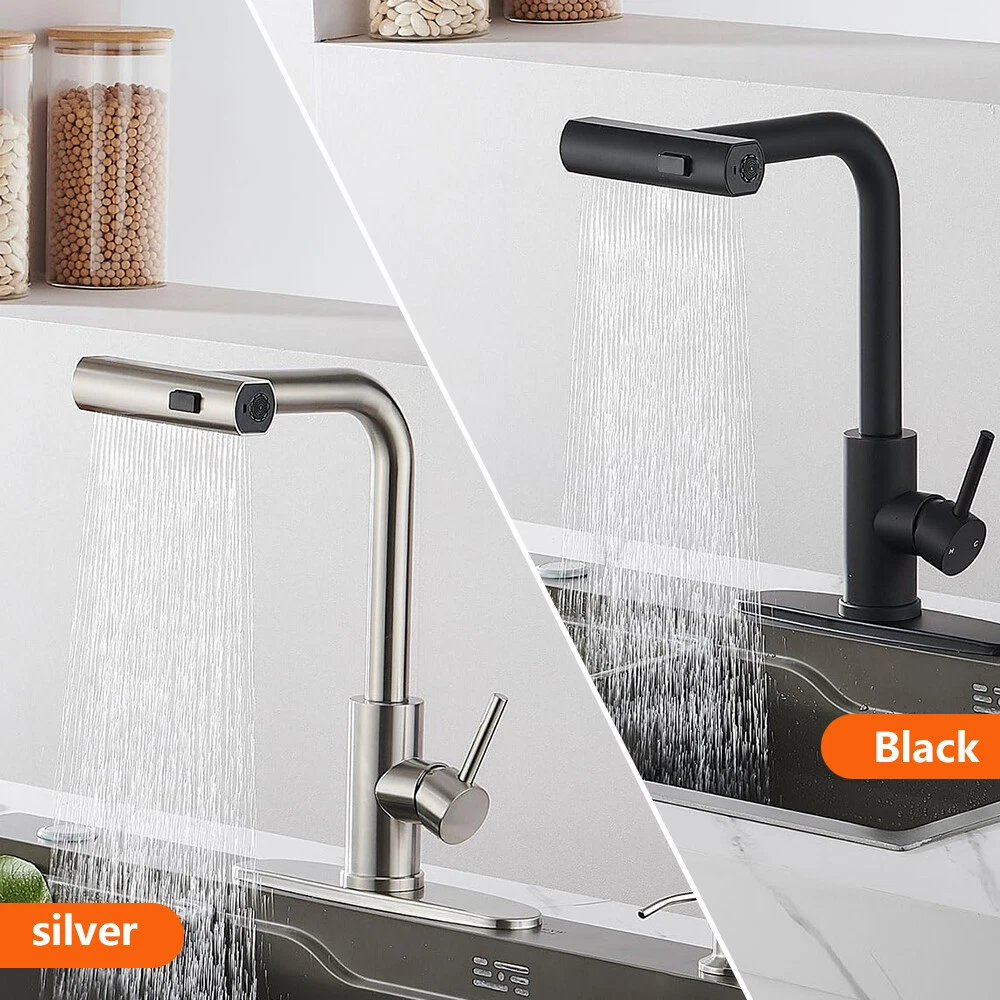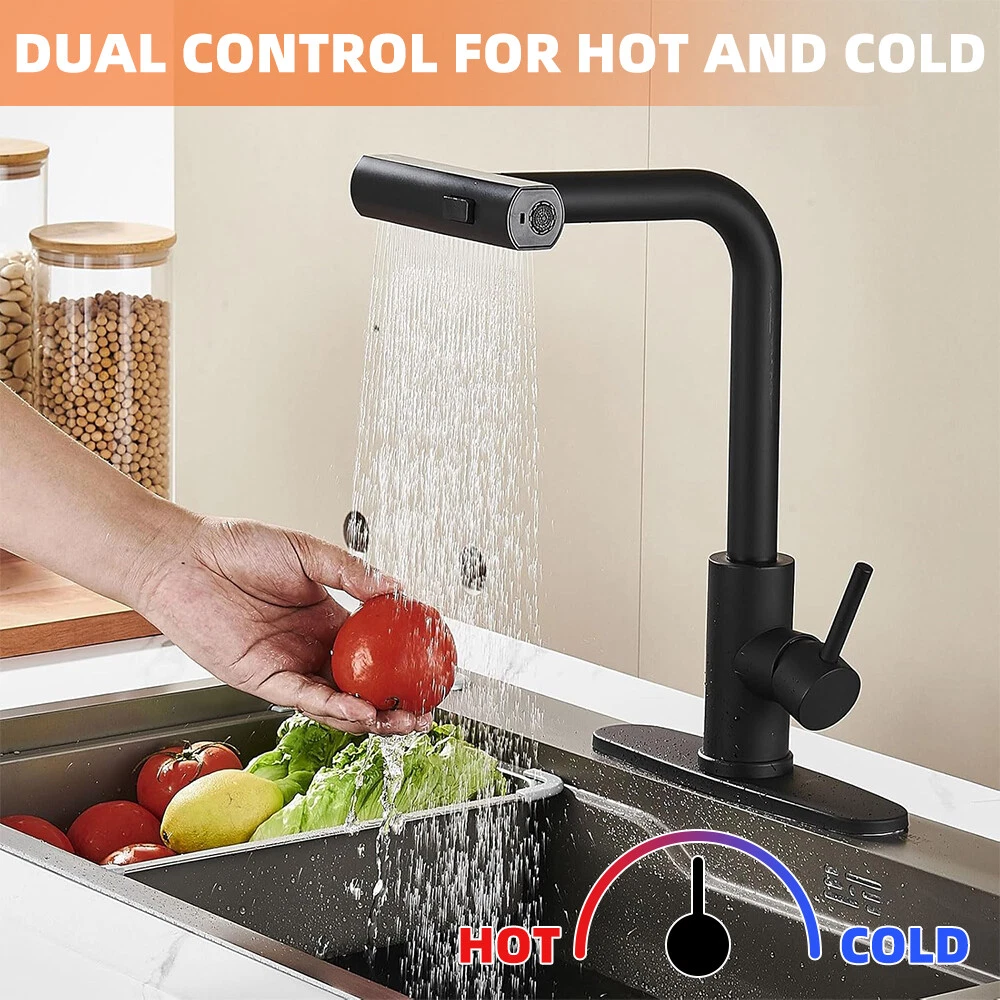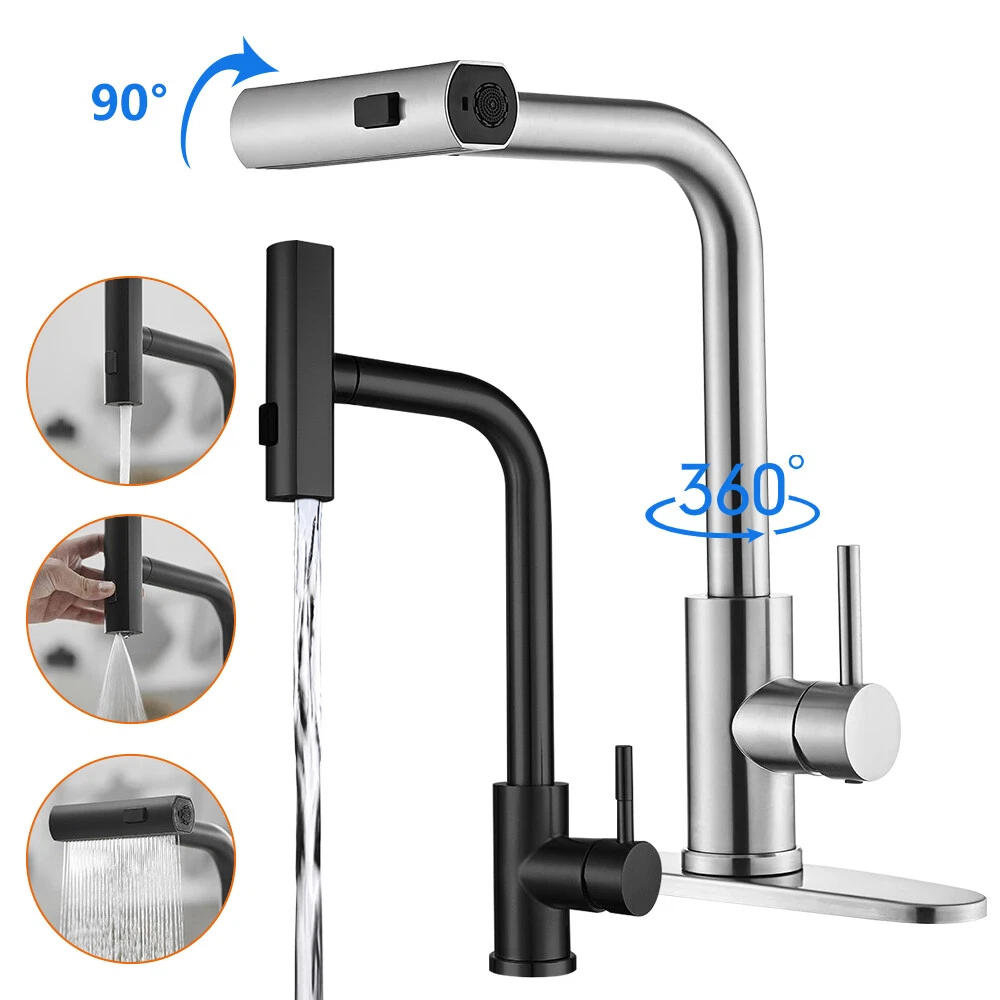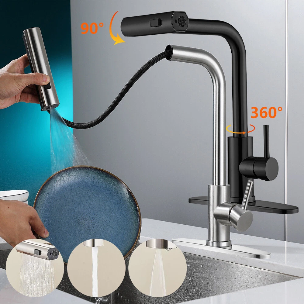 Waterfall Kitchen Sink Faucet with Pull Out Sprayer,Kitchen Faucet Raindance 3 Modes,Stainless Steel 1 Hole Sink Faucet, 360° Swivel & Single Handle Feature : Powerful faucet sprayer : The Kitchen Faucet a robust wide spray to eliminate stubborn residues, a gentle aeratorstream for delicate fruit rinsing, and a sweeping spray for extensive coverage. Unmatched Flexibility : The Kitchen Faucet provides unparalleled flexibility with a 360° swivel spout and a retractable PEX hose. Single-Handed Control : The single-handle mecha nism empowers you to control water temperature and flow volume with one hand. Free up the other hand for multitasking, transforming kitchen chores into fluid, time-efficient activities. Premium Craftsmanship : The waterfall kitchen faucet. Crafted from eco-friendly SUS 304 stainless steel, it resists corrosion and rust. No Plumbers N eeded : Designed for your convenience, the faucet for the kitchen sink comes with a pre-attached deck plate and pre-installed hoses. Specification : Nominal pressure: normal pressure Working Temperature|:1-90° Material: stainless steel Net weight: 1280g (g (grams)) Valve seat diameter: 35MM Specification: brushed three-position pull-out, black three-position pull-out, Function categories: mixer faucet,pull-out faucet Installation type:Deck Mount Opening mode: lifting type Structure: single coupling type Inlet and outlet pipe diameter: 1/2 Applicable type: kitchen faucet Style: modern minimalist Surface technology: baking paint Spool type: ceramic piece spool Packagelis t : 1 x KitchenFaucet 1 x Water inlet pipe 1 x Base Plate