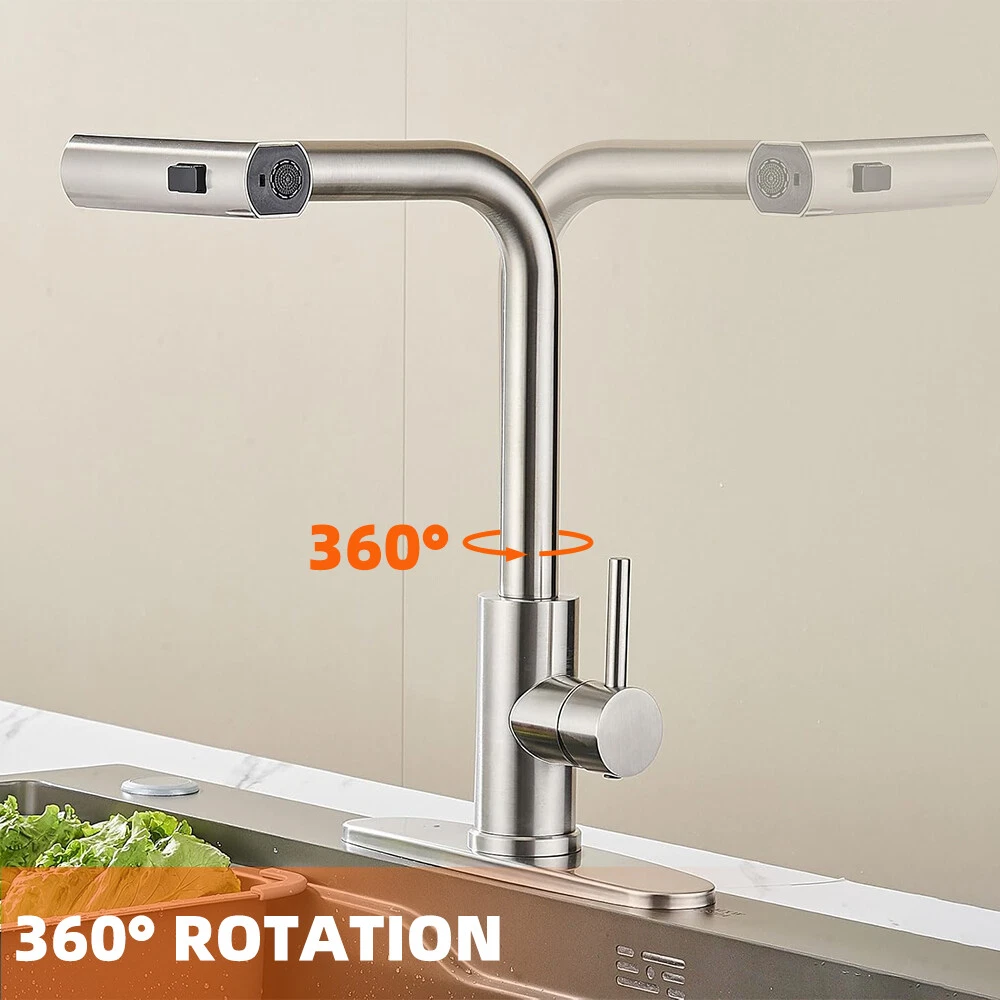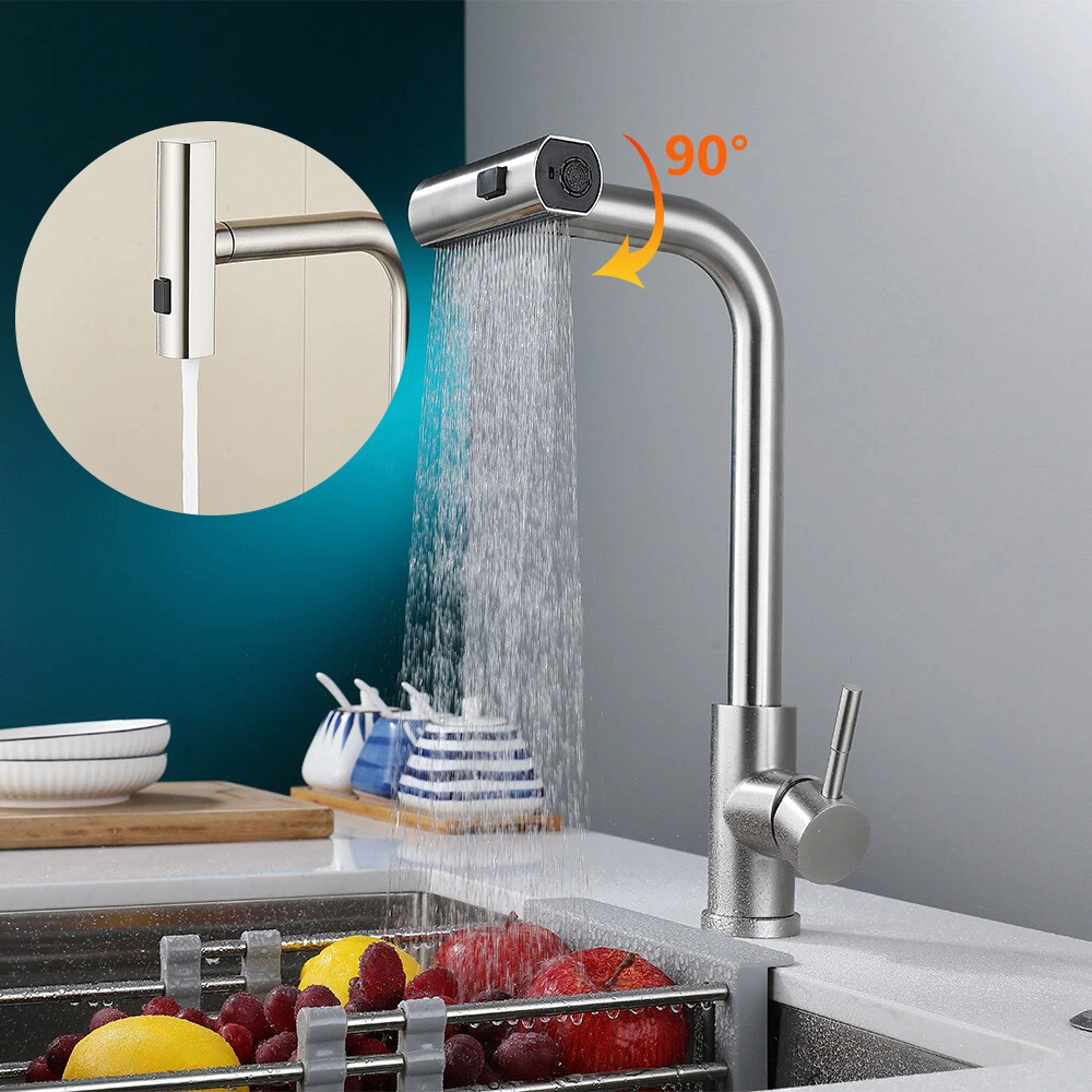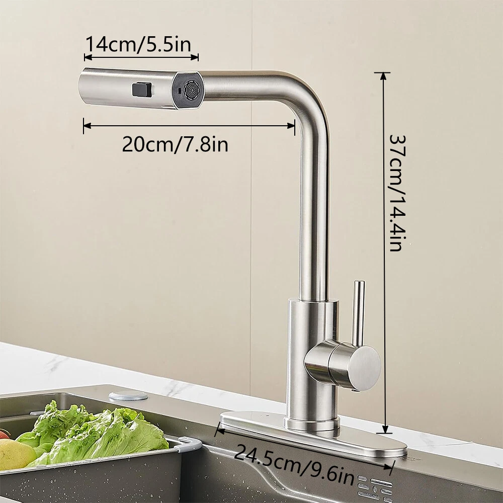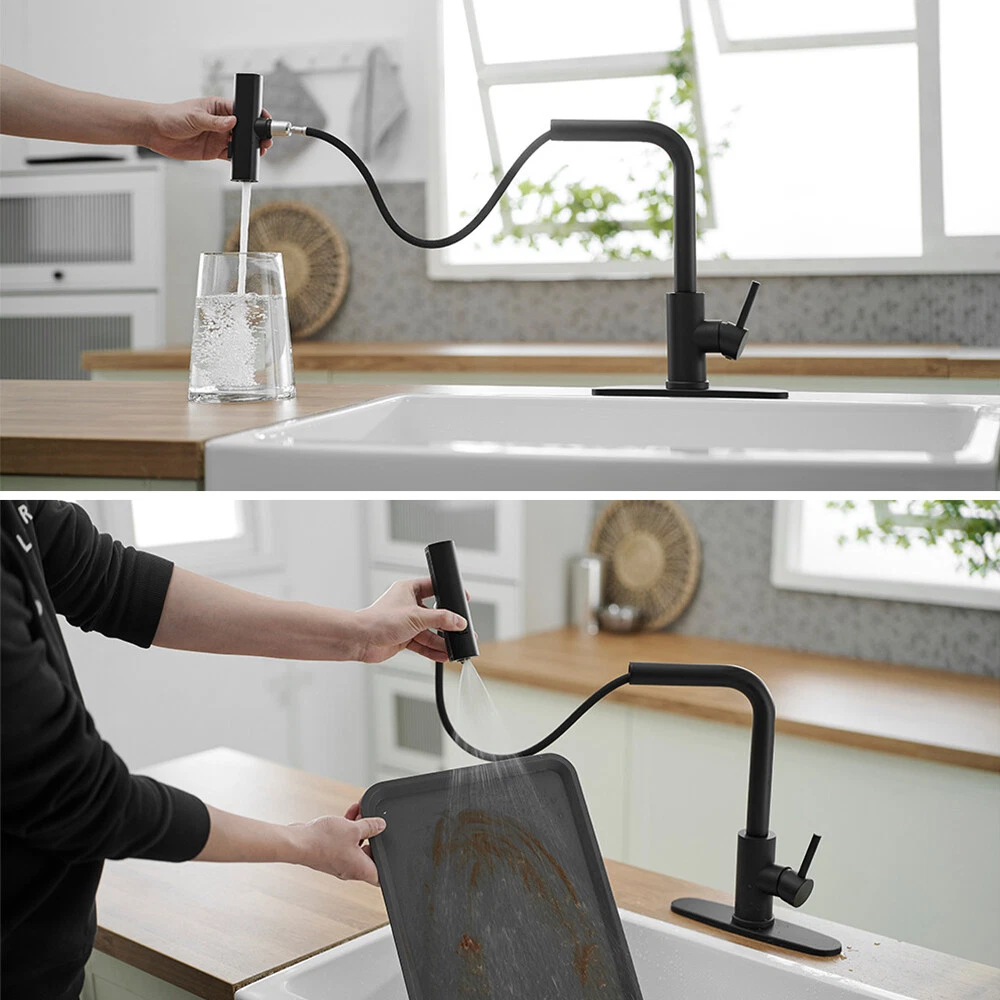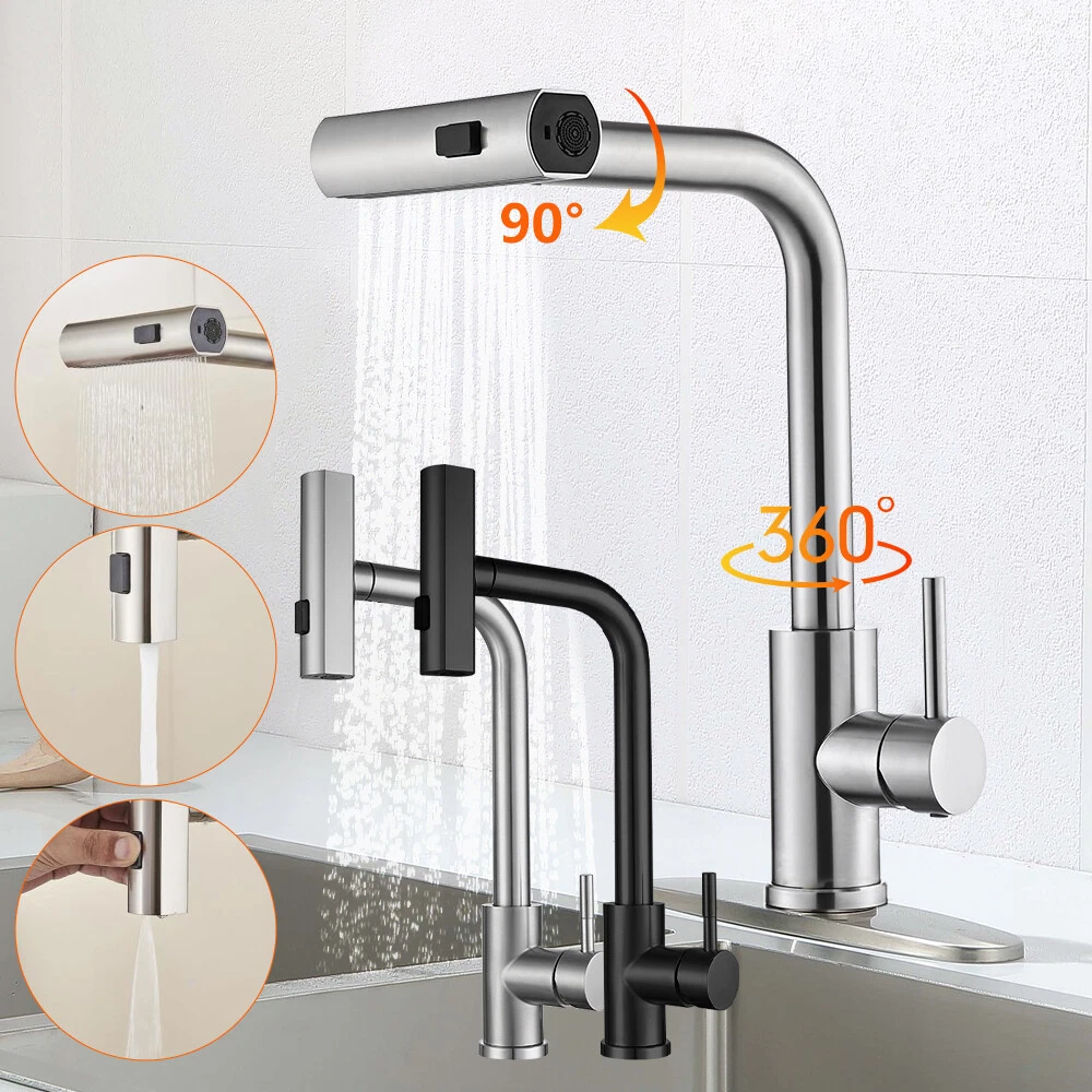 Waterfall Kitchen Sink Faucet with Pull Out Sprayer,Kitchen Faucet Raindance 3 Modes,Stainless Steel 1 Hole Sink Faucet, 360° Swivel & Single Handle Feature : Powerful faucet sprayer : The Kitchen Faucet a robust wide spray to eliminate stubborn residues, a gentle aeratorstream for delicate fruit rinsing, and a sweeping spray for extensive coverage. Unmatched Flexibility : The Kitchen Faucet provides unparalleled flexibility with a 360° swivel spout and a retractable PEX hose. Single-Handed Control : The single-handle mecha nism empowers you to control water temperature and flow volume with one hand. Free up the other hand for multitasking, transforming kitchen chores into fluid, time-efficient activities. Premium Craftsmanship : The waterfall kitchen faucet. Crafted from eco-friendly SUS 304 stainless steel, it resists corrosion and rust. No Plumbers N eeded : Designed for your convenience, the faucet for the kitchen sink comes with a pre-attached deck plate and pre-installed hoses. Specification : Nominal pressure: normal pressure Working Temperature|:1-90° Material: stainless steel Net weight: 1280g (g (grams)) Valve seat diameter: 35MM Specification: brushed three-position pull-out, black three-position pull-out, Function categories: mixer faucet,pull-out faucet Installation type:Deck Mount Opening mode: lifting type Structure: single coupling type Inlet and outlet pipe diameter: 1/2 Applicable type: kitchen faucet Style: modern minimalist Surface technology: baking paint Spool type: ceramic piece spool Packagelis t : 1 x KitchenFaucet 1 x Water inlet pipe 1 x Base Plate