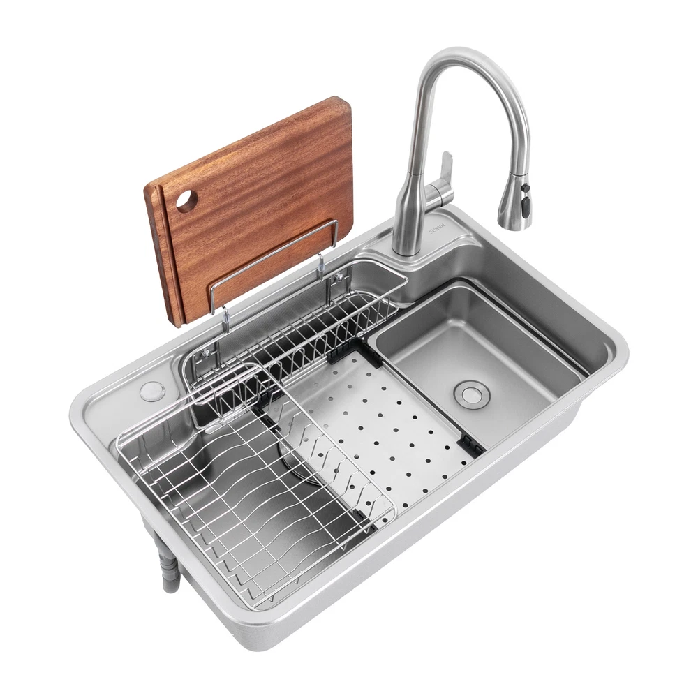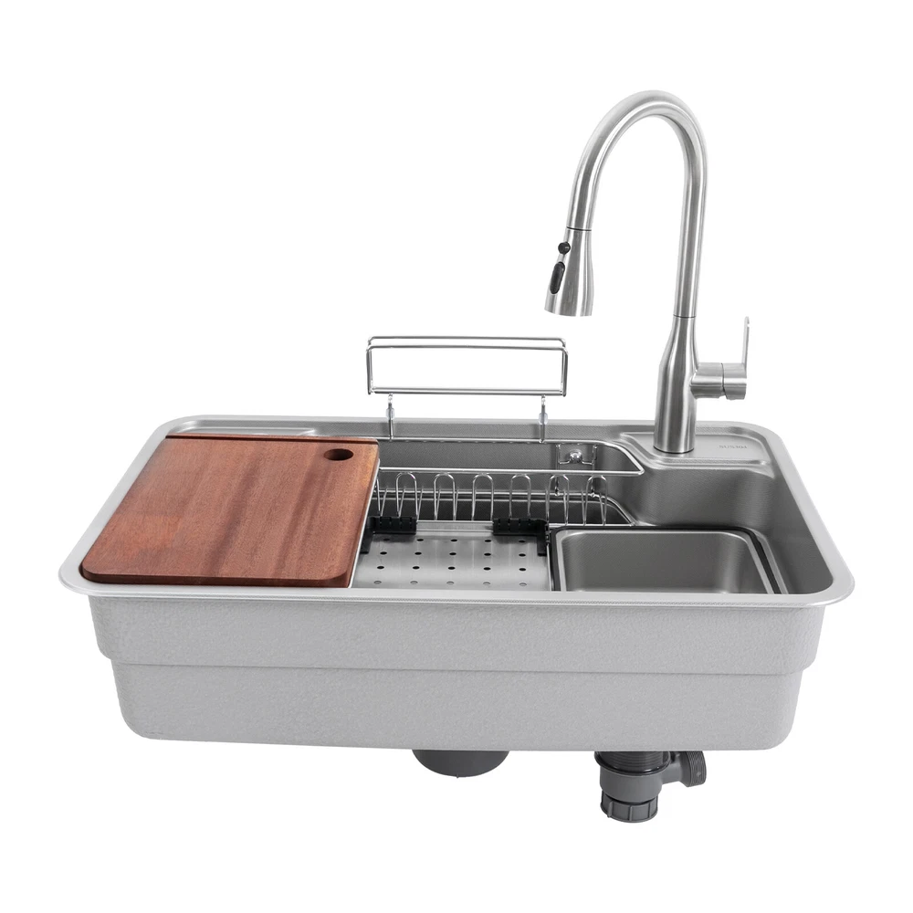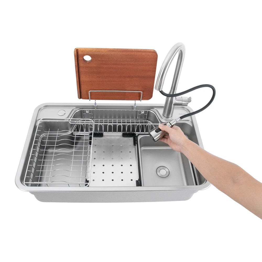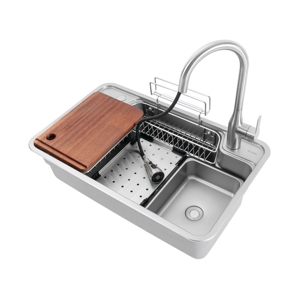 Inner Basin Size (L*W): 74*44cm/29.13*17.32 in Topmount Opening Size: 75*45cm/ 29.53*17.72 in Undermount Opening Size: 74*44cm/ 29.13*17.32 in Kitchen Sink Stainless Steel Workstation Sink with Pull Out Faucet 780*480*230mm Inner Basin Size (L*W): 74*44cm/29.13*17.32 in Topmount Opening Size: 75*45cm/ 29.53*17.72 in Undermount Opening Size: 74*44cm/ 29.13*17.32 in Faucet Size: 42.6*22cm / 16.77*8.66 in Product Size: 78*48*23cm /30.71*18.90*9.06 in Description This kitchen sink made of selected 304 stainless steel stands out for its excellent durability and corrosion resistance. The surface presents a delicate and smooth texture while having a good scratch and wear-resistant performance, which lasts for a long time. It can become your right-hand man in the kitchen life, make the cooking time more pleasant, showing the style and pursuit of quality life. Key Features Sturdy and Durable: The premium 304 stainless steel and the professional nano-coating, vacuum electroplating, and embossing processes make this product wear- resistant, corrosion -resistant , sturdy, and less prone to rusting, so it c an be used in wet environments such as the kitchen and laundry room. Thoughtful Design: Depending on the installation position, you can freely bend and cut the drainpipe. The integrated basin body avoids the problem of water seepage caused by traditional welding, making it more user-friendly. Multifunctional Assistant: A chopping board, a draining board, a hanging basket, a wire basket, and an inner basin make this product a dishwashing, chopping, storage, and draining/defrosting area that makes kitchen work more efficient and organized. The chopping board can be placed stably and is not easily run out of position, and the inner basin with a drain can be drained directly, which is convenient for you to use. Large Capacity: The 9.06'' deep sink allows you to clean large amounts of plates, dishes, and pots, and wash fruits, and vegetables at one time without splashing, saving time. Strong Load-bearing Capacity: One-piece molded basin and 1mm thick sink panel give the product stability and sturdiness with a maximum load capacity of 220.46 lbs, making it easy for you to handle dishes on it. Humanized Design: The thickened anti-condensation coating on the bottom prevents dripping and condensation, keeps the sink dry and avoids the deformation of the cabinet by moisture. The sound-absorbing mats absorb noise from dishwashing, water falling, and rubbish disposal. Excellent Filtration Capacity: A multi-layer filtration mechanism consisting of a sealed lid, stainless steel filter basket , silicone gasket, stainless steel liner, and outer protective cover intercepts food waste residue for easy disposal and prevents clogging. Free Access to Water: The equipped faucet has three water outlet modes: water column, showerhead, and blade, as well as dual control of hot and cold water outlets, which can meet different cleaning needs. It can rotate 360 ° and pull up to a length of 23.62 inches, making it easy to clean every corner of the sink and improving the convenience and flexibility of use. Easy to Clean: The nano-coating surface allows grease to be quickly washed away by the water flow . The R-shaped round corner of the basin eliminates the dead corner of dirt accumulation for easy cleaning. Ideal Gift: The minimalist appearance and good practicality make it a great gift for parents, friends, and lovers on birthdays and housewarming. Details Pre-drilled Holes: The additional hole on the top can be used to install a soap dispenser (not included), a water purification faucet (included), and more. Anti-overflow Hole: It c an reduce the risk of overflowing water. Even if you forget to turn off the water, you don't have to worry. Raised Edges: The raised edges can efficiently prevent overflowing, and keep your kitchen dry and clean. Ceramic Valve Core: The sturdy and durable ceramic valve cores can effectively prevent water leakage and improv e the stability of the faucet. Application It is suitable for cleaning tableware, pots and pans, fruits and vegetables, meat, clothes, etc. in restaurants, laundries, stores, utility rooms, laboratories, canteens, cafes, gardens, warehouses, bars, and dessert shops. Specifications Style: Modern Shape: Rectangular Color: Silver Material: 304 Stainless Steel Surface Treatment: Nano-coating, Vacuum Electroplating, Embossing Mount Type: Topmount, Undermount, Flushmount Assembly Required: Yes Sink Panel Thickness: 1mm/ 0.04 in Max, Load Capacity: 100kg/ 220.46 lbs Down Hole Outer Diameter of: 18.5cm/ 7.28 in Water Dispensing Mode: Water Column, Shower, Blade Tap and Soap Bottle Installation Hole Diameter: 35mm/1.37 in Faucet Pull-out Length: 60cm/ 23.62 in Faucet Rotation Angle: 360° Inner Basin Size (L*W): 74*44cm/29.13*17.32 in Topmount Opening Size: 75*45cm/ 29.53*17.72 in Undermount Opening Size: 74*44cm/ 29.13*17.32 in Faucet Size: 42.6*22cm / 16.77*8.66 in Product Size: 78*48*23cm /30.71*18.90*9.06 in Sink: Gross Weight: 12.5kg/ 27.56 lbs Net Weight: 11.5kg/ 25.35 lbs Package Size: 85*53*31cm/ 33.46*20.87* 12.2 in Faucet: Gross Weight: 1.5kg/ 3.31 lbs Net Weight: 1.2kg/ 2.64 lbs Package Size: 65*34*6cm/ 25.59*13.38*2.36 in Package Included 1* Sink 1* Chopping Board 1* Draining Board 1* Hanging Basket 1* Wire Basket 1* Inner Basin 1* Drainpipe Kit 1* Faucet Kit Notes Please note that to prolong the life of the sink, do not scratch the surface with sharp objects. Please do not use strong acids or alkalis to clean items in the sink, and do not put hard objects or rusty metal in contact with the sink for a long time, keep the sink clean by cleaning the tank and drying it with a rag after each use. Please note that for undermount installations it is recommended that you open the holes after you receive the product. Payment Delivery details Terms of sales About us Contact us Payment We accept ebay payment 。 Fees such as import duties, taxes are not included in the item price or