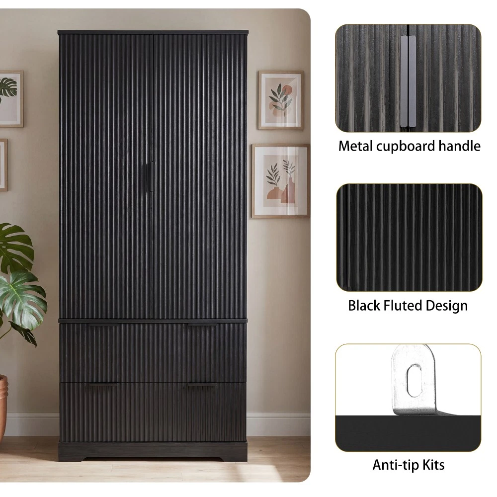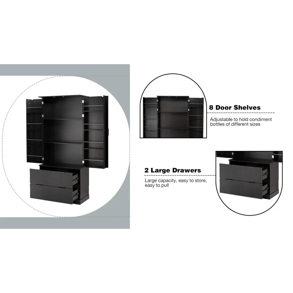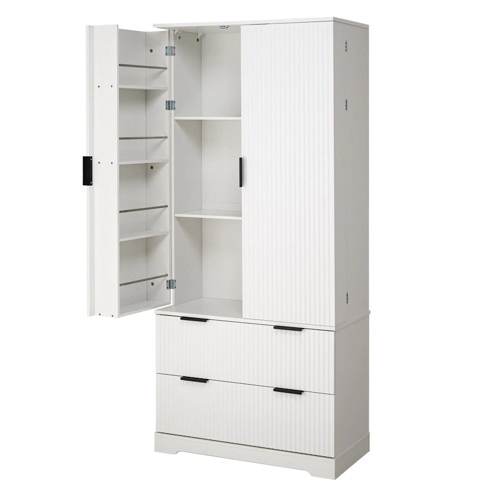 72" Modern Fluted Kitchen Pantry Cabinet - 2 Drawers & 8-Door Spice Rack (Black/White) Freestanding Storage Cabinet | Fluted Texture | Spice Racks | Metal Handles | 1-Year Warranty & 30-Day Free Return Elevate your home storage with our 72" fluted pantry cabinet, blending French-inspired elegance with exceptional functionality. Crafted from high-quality MDF, this freestanding cabinet features 2 large drawers, 3 upper shelves, and built-in door spice racks—perfect for organizing kitchens, bathrooms, offices, entryways, or dining rooms. Choose between sleek black or classic white to complement your interior style. Style 1: Black 72" Fluted Kitchen Pantry Cabinet Product Specifications Category Details Origin China Color/Finish Black (High-Gloss Protective Laminate) Material Premium MDF with Protective Laminate, Metal Handles Assembled Dimensions 31.49" L x 15.75" W x 71.65" H Product Weight 117.70 lbs Package Dimensions 51.97" L x 18.90" W x 9.45" H Package Weight 127.16 lbs Storage Configuration 2 Large Deep Drawers, 3 Upper Shelves (3rd Shelf Adjustable), 8-Door Built-In Spice Racks Assembly Requirement Yes (Recommended for 2 Adults; Numbered Accessories & Detailed Instructions) Key Features Chic French-Inspired Design : This black pantry cabinet combines vintage French charm with modern functionality, featuring vertical fluted stripes that add visual depth and lengthen proportions. Sleek metal handles enhance refinement, durability, and ease of use, making it a stylish centerpiece for both traditional and contemporary interiors. Maximized Spacious Storage : Designed for versatility, the cabinet offers 3 upper shelves and 2 deep lower drawers—blending open and concealed storage. Store dishes, small appliances, daily essentials, or bathroom supplies, eliminating clutter and keeping your space tidy. Perfect as a kitchen pantry, hallway organizer, or bathroom storage unit. Built-In Door Spice Racks : Integrated spice racks on both cabinet doors optimize storage for condiments, jars, and small items, maximizing every inch of space. The smart design prevents items from shifting when opening/closing doors, keeping your spices organized and easily accessible without rummaging through crowded cabinets. Easy-to-Clean & Durable : The high-gloss protective laminate surface resists stains, fingerprints, and moisture. A simple wipe with a damp cloth removes dust and spills, saving you time on household chores while maintaining a pristine look for years to come. Straightforward Assembly : All accessories are clearly numbered, and detailed installation guides are available on the product page. We recommend two adults for assembly; our customer support is ready to assist if you encounter any challenges. Style 2: White 72" Fluted Kitchen Pantry Cabinet Product Specifications Category Details Origin China Color/Finish White (Smooth, Easy-to-Clean Finish) Material Durable MDF, Metal Handles Assembled Dimensions 31.49" L x 15.75" W x 71.65" H Product Weight 117.70 lbs Package Dimensions 51.97" L x 18.90" W x 9.45" H Package Weight 127.16 lbs Storage Configuration 2 Large Deep Drawers, 3 Upper Shelves (3rd Shelf Adjustable), 8-Door Built-In Spice Racks Assembly Requirement Yes (Recommended for 2 Adults; Numbered Accessories & Detailed Instructions) Key Features Elegant French Refrigerator-Inspired Design : Add timeless charm to your home with this white pantry cabinet, featuring a classic French refrigerator-inspired look and fluted texture. The elegant silhouette seamlessly complements kitchens, dining rooms, living rooms, or bathrooms, blending style and functionality effortlessly. Versatile Spacious Storage : Equipped with 3 upper shelves and 2 roomy lower drawers, this cabinet provides ample storage for dishes, small kitchen appliances, everyday essentials, or bathroom toiletries. The mix of open and concealed storage offers flexible organization options to suit any room’s needs. Adjustable Built-In Spice Racks : Each cabinet door features integrated spice racks, perfect for storing condiments, jars, and small items. The 3rd upper shelf is adjustable, allowing you to customize the space for taller items—transforming door space into functional storage and keeping essentials within reach. Sturdy Construction & Easy Maintenance : Crafted from durable MDF, this cabinet is built to withstand daily use. Sleek metal handles add a modern touch, while the smooth finish resists dirt and stains, making it easy to clean with a simple wipe—ensuring long-lasting durability and aesthetics. Multi-Room Functionality : Beyond the kitchen, this cabinet works beautifully as a bathroom storage unit, office organizer, entryway console, or dining room sideboard. Its stylish design and ample storage make it a versatile addition to any room in your home. Hassle-Free Assembly : All parts are numbered for clarity, and detailed installation instructions are provided on the product page. Two adults are recommended for assembly, and our customer service team is available to assist with any assembly challenges. Warranty & Return Policy Shop with confidence! Both black and white pantry cabinets come with a 1-Year Manufacturer Warranty , covering defects in materials and craftsmanship. If you’re not completely satisfied with your purchase, take advantage of our 30-Day Free Return Policy —no questions asked. Our dedicated customer support team is ready to assist you before and after purchase for a seamless experience. Upgrade your home storage with a cabinet that combines French elegance, durable construction, and versatile functionality. Choose your preferred color and order today to enjoy a clutter-free space with peace of mind!