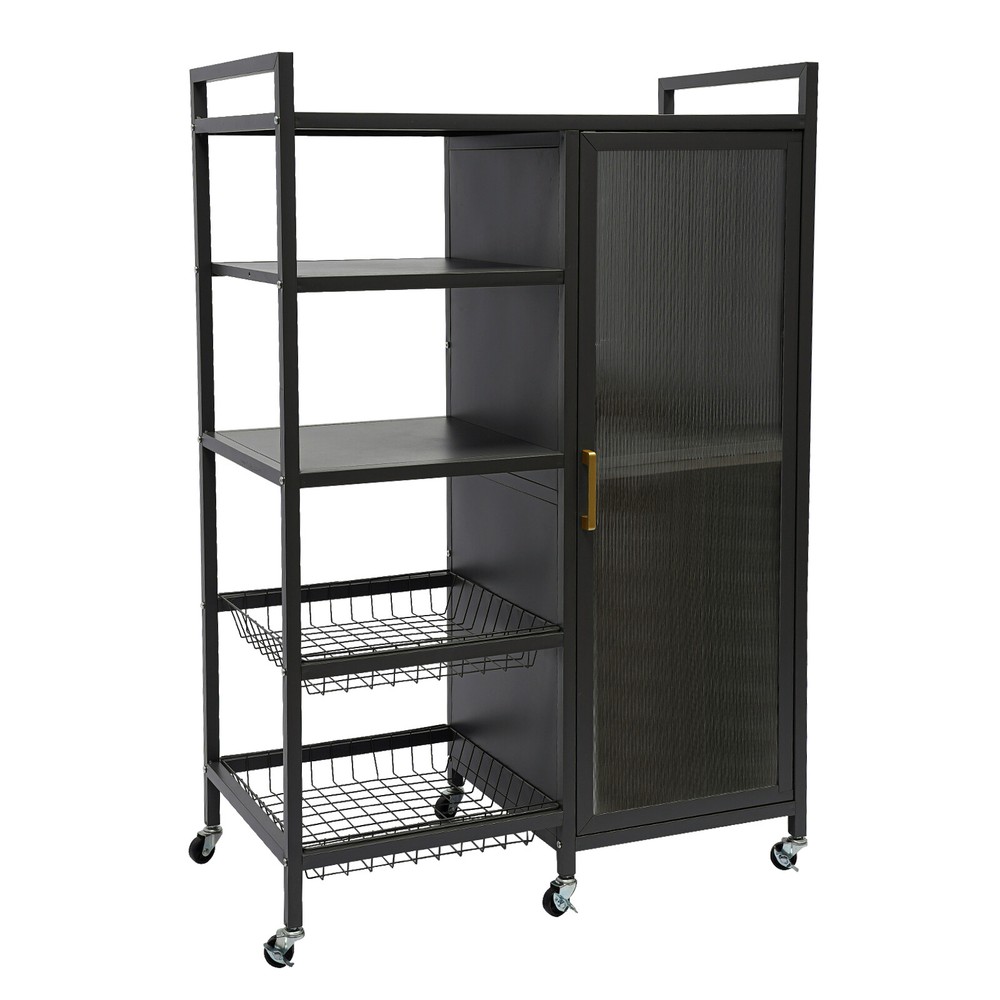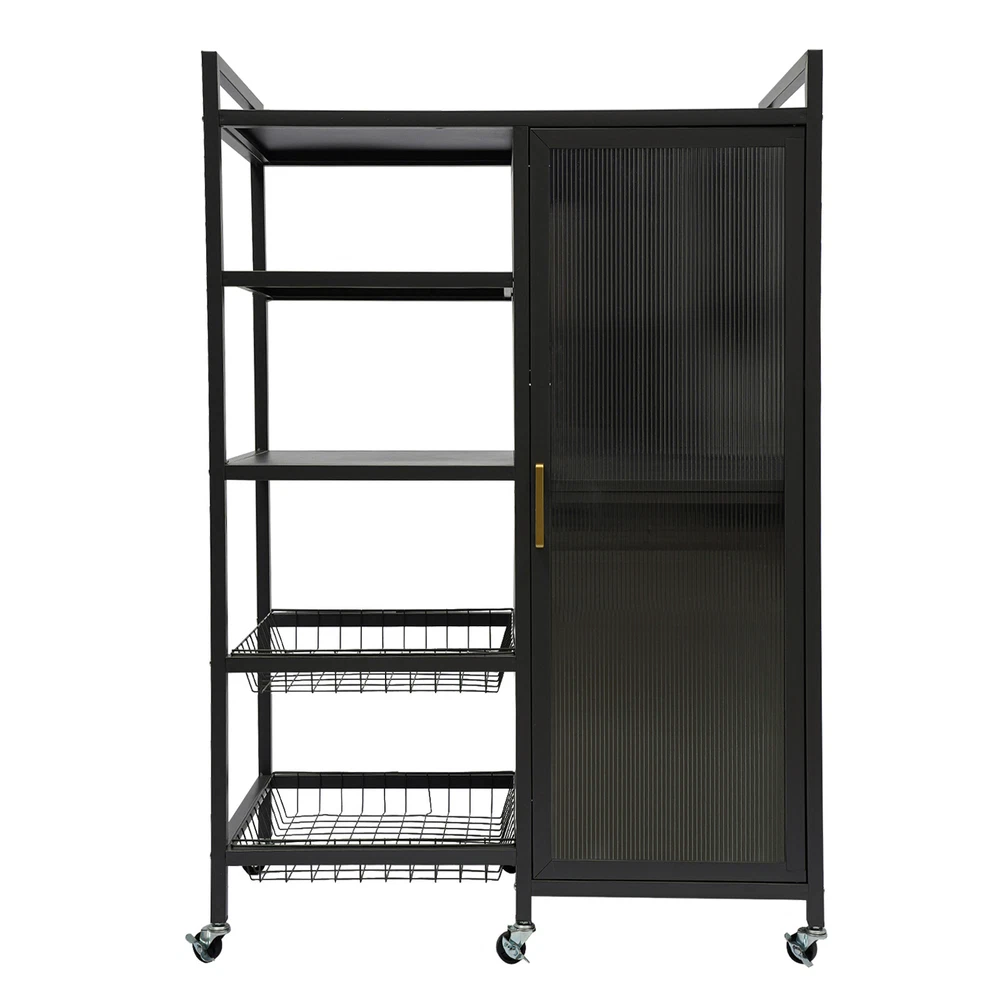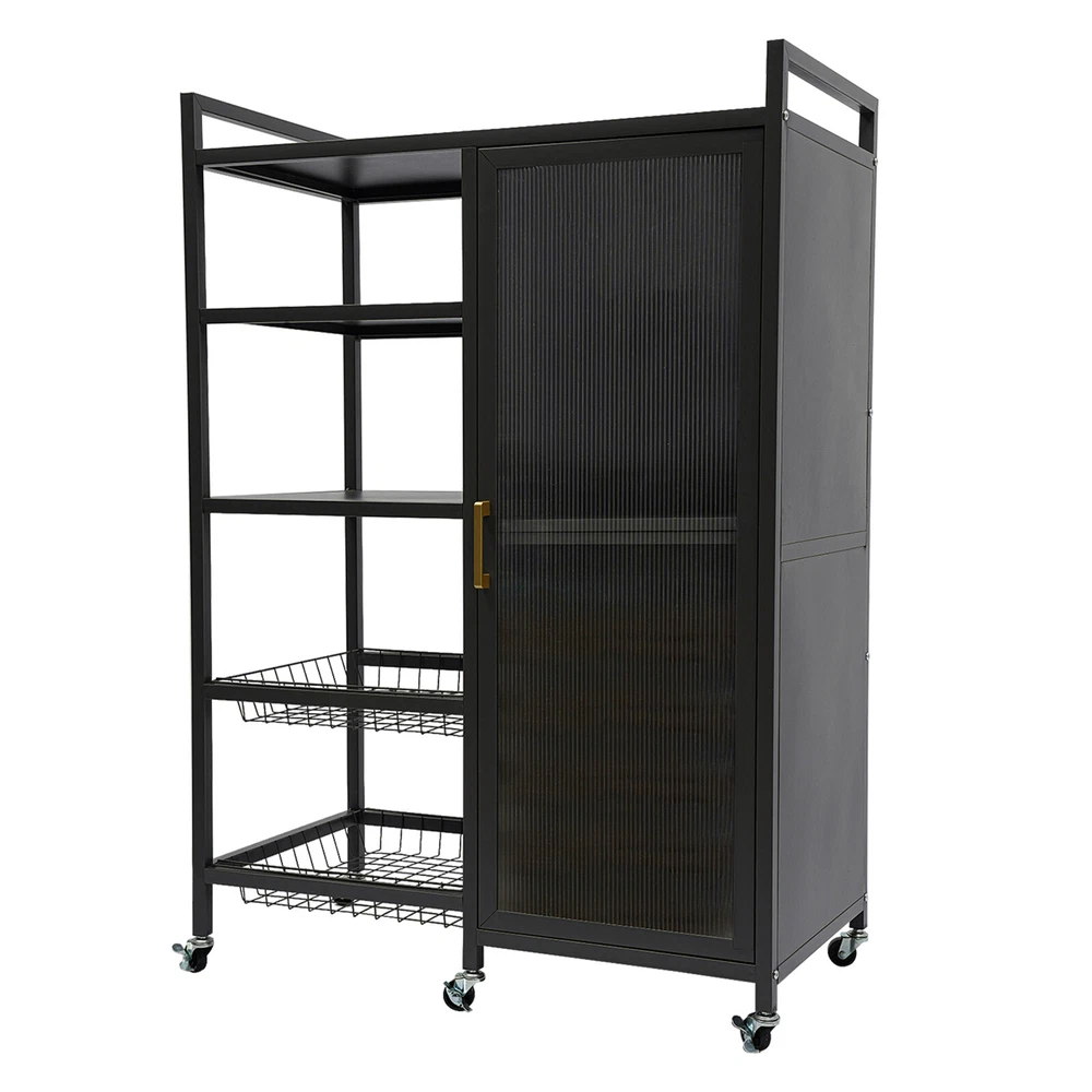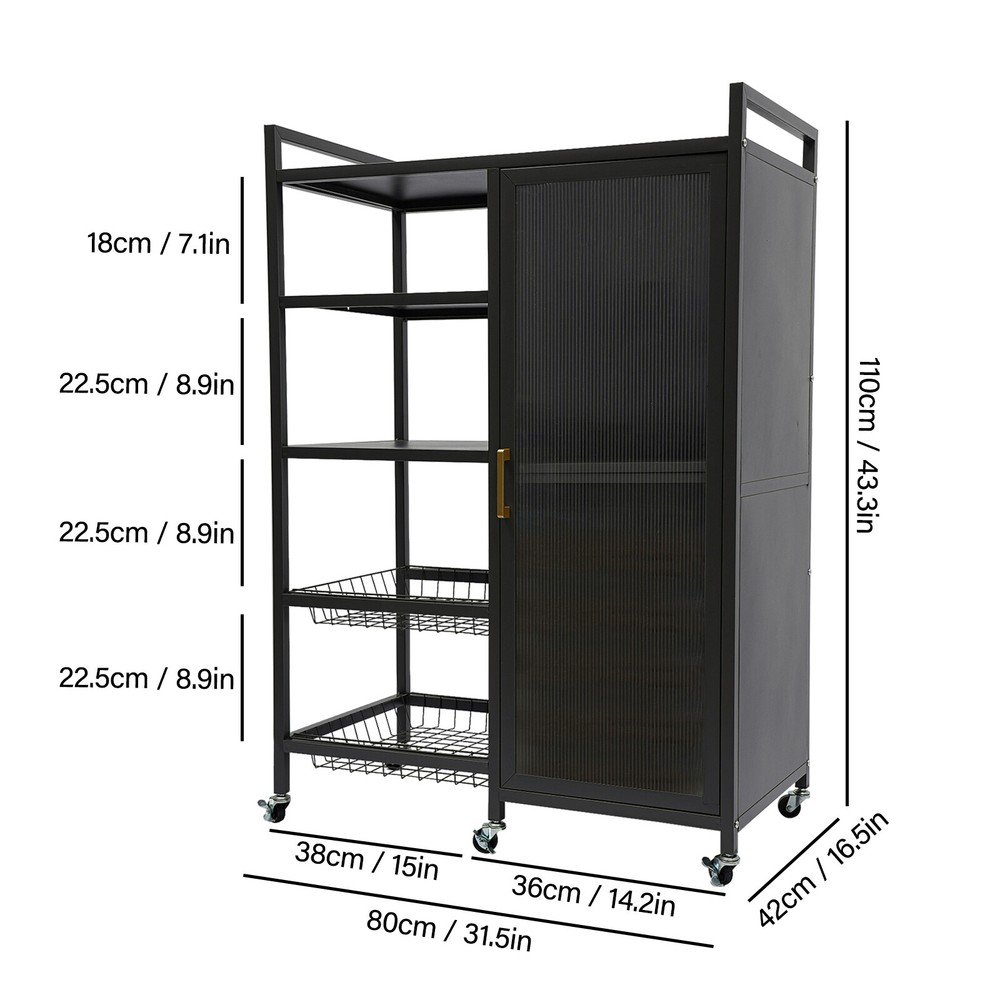 Specification Color: Black Style: Modern Shape: Rectangular Process: Baking Paint Material: Carbon Steel and PVC Installation Type: Floor Standing Assembly Required: Yes Number of Tiers: 4 Top Tier Spacing: 18cm/7.1in Each Bottom Tier Spacing: 22.5cm/8.9in Each Tier Spacing in the Cabinet: 32.5cm/12.8in Product Size: 80*42*110cm/31.5*16.5*43.3 inch Package Size: 115*40*23cm/45.28*15.75*9.06 inch Gross Weight: 16kg/35.27 lbs Net Weight: 15kg/33.07 lbs Package Included 1* Storage Cabinet 6* Universal Wheels 6* Pads Other Accessories for Assembly Standing Kitchen Shelf Storage Cabinet with Door Standing Storage Shelf Description Cleanness and tidiness are a good attitude towards life and will put you and your family in a good mood. Our storage cabinet is made of high-quality material with sufficient storage space and a beautiful and practical design, allowing you to neatly and efficiently organize your belongings and make you feel organized and relaxed. Say goodbye to a cluttered room and enjoy a neater, more efficient life! Key Features Sturdy and Durable: It is made of high-quality carbon steel and PVC with a baking paint process, which is eco-friendly, odorless, anti-corrosion, and rust-resistant , ensuring its beauty and long-time use. Life Assistant: The 4-tier design can effectively organize kitchen utensils, books, towels, toiletries, laundry and other household items. The top platform can hold microwave, rice cooker, etc., while the heightened detachable draining trays can be used separately as a fruit and vegetable cleanup tray for your convenience. Thoughtful Design: The sealed, semi-clear, and magnetically-designed cabinet door allows for convenient opening, prevents dust, moisture, and insects , and also shows inside items elegantly for easy access. In addition, the shelves inside the cabinet can be adjusted to five heights to make it easier for you to place larger cookware or appliances. Move and Fix at Will: Six wheels on the bottom (three with brakes) make it easy to move the product around or hold it in place. Easy to Clean: Thanks to its smooth surface, simple construction,and dustproof door, you can wipe it clean with a damp rag. Simple Installation: With complete accessories and a simple structure, you can put it together by yourself and enjoy the fun of the installation process! Ideal Gift: Thanks to its practicality, it will make a fine gift for family, friends, and loved ones on Christmas, housewarming, birthdays, anniversaries, and holidays. Protective Package: We have used foam wrapping for this product, designed to minimize damage to the product during shipping. Details Convenient Handle: The ergonomic handle can help you open or close the cabinet door more easily. Raised Baffle: The raised top baffle design prevents items you placed from falling. Adjustable Feet: You can replace the bottom wheels with adjustable feet to provide better stability and adapt to uneven floors. Application It is ideal for bedroom, study, nursery, playroom, entryway, living room, kitchen, children's room, bathroom, toilet and so on. It can be used to store dishes, housewares, microwaves, coffee makers, toasters, frying pans, rice cookers, crock pots, vegetable baskets, spice bottles, toys, snacks, towels, paper towels, books, and other daily necessities. Specification Color: Black Style: Modern Shape: Rectangular Process: Baking Paint Material: Carbon Steel and PVC Installation Type: Floor Standing Assembly Required: Yes Number of Tiers: 4 Top Tier Spacing: 18cm/7.1in Each Bottom Tier Spacing: 22.5cm/8.9in Each Tier Spacing in the Cabinet: 32.5cm/12.8in Product Size: 80*42*110cm/31.5*16.5*43.3 inch Package Size: 115*40*23cm/45.28*15.75*9.06 inch Gross Weight: 16kg/35.27 lbs Net Weight: 15kg/33.07 lbs Package Included 1* Storage Cabinet 6* Universal Wheels 6* Pads Other Accessories for Assembly Notes Please check the product style and size before purchasing. Please note that this product does not include any other storage items. Please allow the slight color difference caused by the shooting light and 1-3cm error due to manual measurement and make sure you do not mind before ordering. Payment Delivery details Terms of sales About us Contact us Payment We accept ebay payment 。 Fees such as import duties, taxes are not included in the item price or shipping costs. These charges are the buyer's responsibility. Delivery details Shipping: 2-9 working days to: USA Terms of sales We maintain high standards of excellence and strive for hundred percent customer satisfaction. Feedback is very important to us. We hope that you contact us immediately before you give neutral or negative feedback, so that we can address your concerns. It is impossible to address issues if we do not know about them! About us Your satis faction is our ultimate goal. We work hard to earn your trust and future business. Our certified technicians have tested each item before shipping. The unit comes with 1 year limited warranty on all manufacturing defects. a) If you receive a defective item, you may return it or ask for a discount. Please contact us within 14 days after you receive the package. b) What you returned must be intact and in its original packaging as re? u. Customer is responsible for shipping costs of the returned item. c) We will cover the cost of shipping back t with the shipping rate indicated in the registration page. We will send you a new unit or refund the full payment you paid. Thank you. Contact us Business Hour Business Hour: Monday To Friday: 8:30 AM to 5:00 PM (Beijing China time) Due to time zones, our reply to your questions may not be immediately. But within above working time, we will reply your email within 24 hours. If it's non-workdays, please kindly be patient and wait till Monday. Please contact us with ebay message. Please feel free to contact us if you have any questions. Monday To Friday: 8:30 AM to 5:00 PM (Beijing China time) Due to time zones, our reply to your questions may not be 