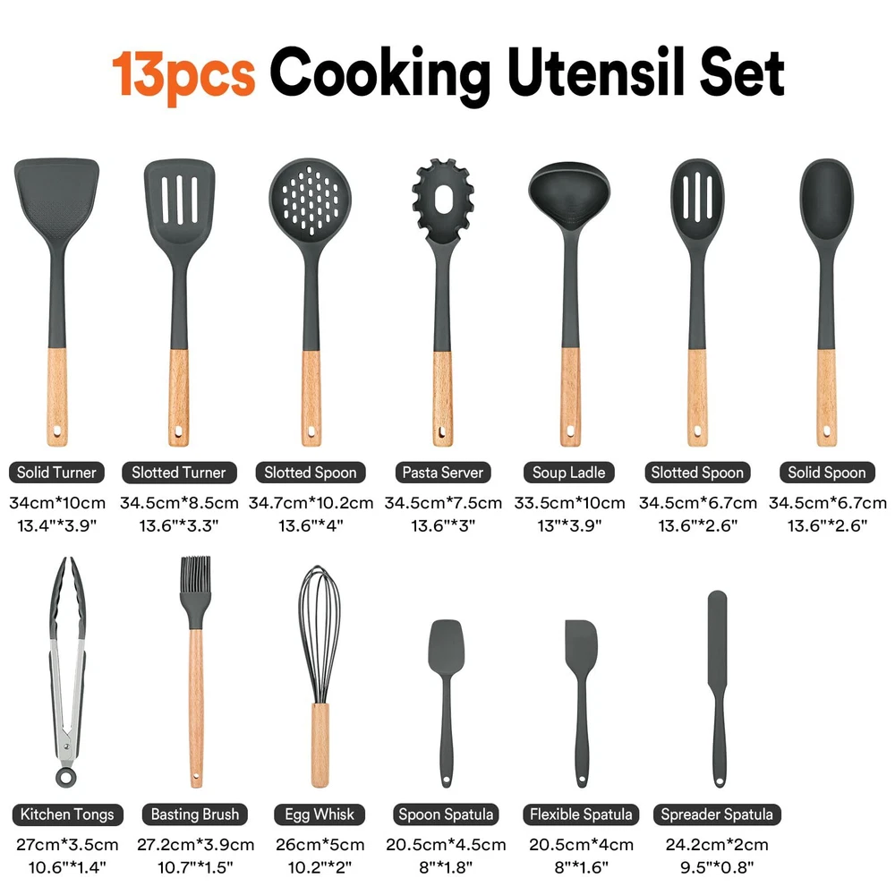 Versatile and Comprehensive: From the everyday kitchen spoons to the oil brush.This kitchen utensils set includes a wide range of silicone cooking utensils, gadgets, and essentials, providing you with everything you need for a variety of cooking tasks Nonstick and Heat-Resistant: The silicone coating on these utensils ensures easy food release and effortless cleaning, while the heat-resistant (up to a whopping 446°F ) to properties allow for safe and comfortable handling on high-temperature stovetops and grills Vintage Wooden Handle: Each wooden handle is made of solid wood which is anti scalding. Smooth and comfortable, precise control while cooking. The wooden spoon and spatula set adds a touch of elegance to your kitchen Odorless BPA-Free, Food-Grade Silicone: Made from durable and food-grade materials, this kitchen utensils set is built to withstand daily use and provide long-lasting performance in your kitchen Convenient Storage: This kitchen utensils set features a hanging hole design for easy and organized storage. Keep your kitchen counter tops clutter-free while having all your essential tools within reach