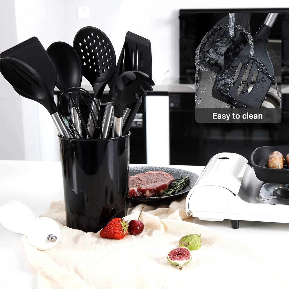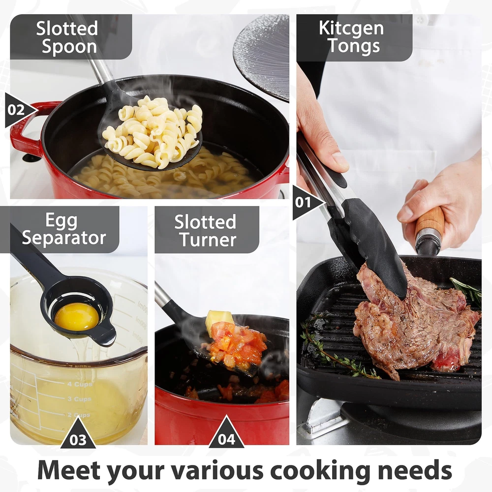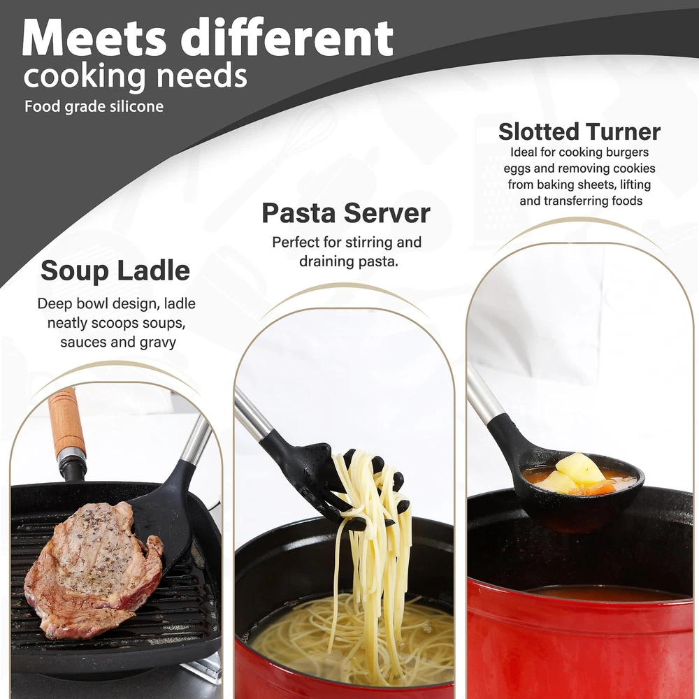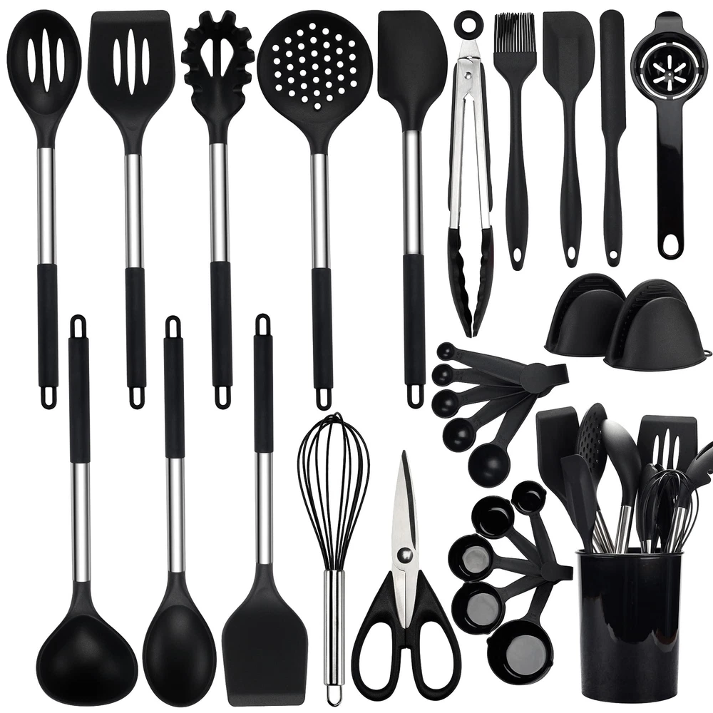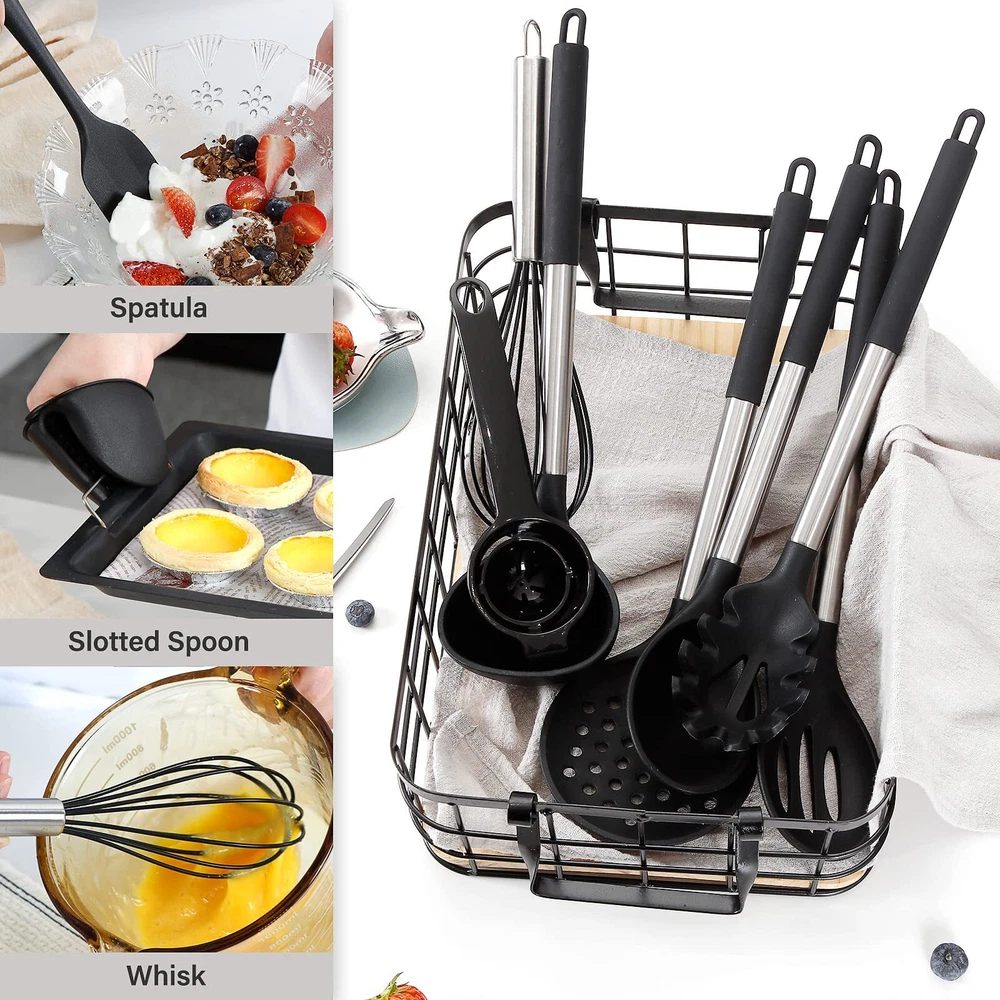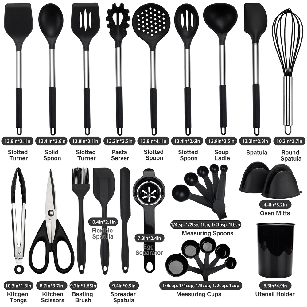 28 DURABLE SILICONE KITCHEN UTENSILS SET: 28 different pieces of kitchen utensils to make your cooking more fun and easy for all your cooking needs, you don't need to spend a fortune to buy each one individually. For example, deep soup, serving spoon, pasta server, flexible pouring brush, mixer, tongs, tumbler, silicone spatula oven mitt, egg separator STAINLESS STEEL AND FOOD GRADE SILICONE UTENSILS SET: The silicone head combined with the high quality stainless steel handle ensures lightweight and durable for everyday use. Designed not to bend, break or rust. Food-grade silicone head with no harsh chemical odor. Stainless steel handle to protect your hands from burns HEAT-RESISTANT, NON-MELTING, ODOR-FREE: healthy silicone tips with no harsh chemical odor. Each cooking utensil can withstand temperatures of up to 446°F. They also won't melt when stirring food directly in the pan. The all-around silicone adds softness, no more worrying about food sticking to your cookware. Extend the life of all your kitchen pots and pans EASY TO CLEAN, DISHWASHER SAFE: This quality kitchen silicone utensil set is easy to clean. To clean these silicone cookware simply rinse gently with warm water or throw in the dishwasher GREAT GIFT: This kitchen utensil kit includes a variety of kitchen utensils, from preparing food, to mixing cooking, each of them has its unique use, this is the best cooking utensil. Perfect for house warming gifts, wedding gifts, mother's day gifts, holiday gifts and anyone else on your gift list. If you have any questions about your purchase or use, we will be happy to help you. Please contact us and we will respond quickly within 12 hours