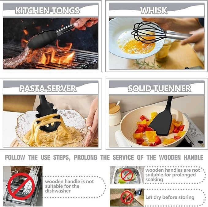 Material Silicone Color Black Item Weight 4.65 Pounds Is Dishwasher Safe No About this item 34PCS KITCHEN UTENSILS SET WITH HOLDER From the everyday kitchen spoons to the garlic crusher, This 34PCS kitchen utensils tools set included all the kitchen stuff you could possibly need to bring out your inner chef. This means you don’t have to spend extra money on repetitive utensil tools. This cooking utensils set includes a Slotted Spatula, Slotted Spoon, Turner, Pasta Server, Kitchen Tongs, Grater, Scissors, and so on. It is a great starter pack for a first apartment HEAT-RESISTANT, NON-MELTING-SOFT SILICONE One of the best things about Umite Chef silicone cooking utensils is their ability to withstand heat safely, each kitchen gadgetsl is heat-resistant up to a whopping 446°F and won’t melt (even leave it in the pot for a while) and our utensils head won't even become knicked or warped even at those extreme temperatures. The soft silicone won’t scratch non-stick cookware or your expensive pans VINTAGE WOODEN HANDLE -EASY TO CLEAN Each wooden handle is made of solid wood which is anti scalding. Smooth and comfortable to the touch, it completely prevents the heat transfer during the cooking process. Please note that each wooden handle has a slightly different color and texture. The one-piece design eliminates any gaps where food can get trapped, making cleaning a breeze. PLEASE NOTE that due to the wooden handle, We don't recommend soaking in water for a long time or dishwasher cleaning ODORLESS BPA-FREE, FOOD-GRADE SILICONE Each utensil is made of food-grade silicone, BPA-free, can use in any type of food. Stainless steel is wrapped inside to maintain its shape and flexibility, ensuring no warping. And it will not retain odors or colors like plastic kitchen utensils. ATTENTION Before the first use, the original smell will disappear after the silicone soaking in water and exposed it to the air for about 3 hours GREAT PRESENTS SET This kitchen utensil set comes with everything you need to get started cooking. A utensils holder can help you organized your kitchen tools well. If you moving or just need a new set of cooking utensils highly recommended. Perfect for house warming presents, wedding presents, mother's day presents, holiday presents and anyone else on your presents list Product information Item Weight 4.65 Pounds Is Dishwasher Safe No Shape Oblong Handle Material Wood Material Type Free Non-Stick Coating Free Recommended Uses For Product Cooking