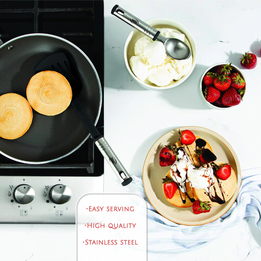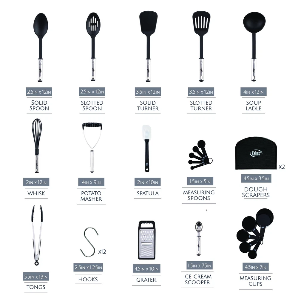 KITCHEN UTENSIL SET: Our utensil set have everything you need for a perfect cooking experience! kitchen gadgets and accessories are made of a combination of nylon and stainless steel to ensure no scratching or sticking. COOKING UTENSILS SET INCLUDES: Soup Ladle, Solid Spoon, Slotted Spoon, Solid Turner, Slotted Turner, Potato Pusher, Whisk, Grater, Spatula, Tongs, Ice scream Scooper, Measuring Cups, Measuring Spoons, 2 Dough Scrapers, 12 Hanging Hooks And a Beautiful Gift Box. HIGH QUALITY KITCHEN TOOLS DESIGNED TO LAST: No more worries about melting or rusty kitchen utensils. Our high-quality kitchen gadgets are polished with a special oil to prevent it from getting rusty. They are dishwasher safe, light weight and non-stick. is up to 350 F/180℃. GREAT VALUE NYLON AND STAINLESS STEEL UTENSIL SET: Don't spend a fortune buying each utensil individually. Buy yourself a complete kitchen tool set. Our 35 peice high quality set has everyting you need included. It is specifically designed to help you with all your food preparations, such as whisking, peeling, cutting, stirring, mixing, basting, baking, grilling, frying and serving up that perfect dish. GREAT GIFT IDEA: The Kitchen Utensils set come in a classy box ready to gift! Great for House Warming gifts new home, wedding gift, mothers day, holiday and anyone else on your gift list apartment must haves, college dorm room essentials.