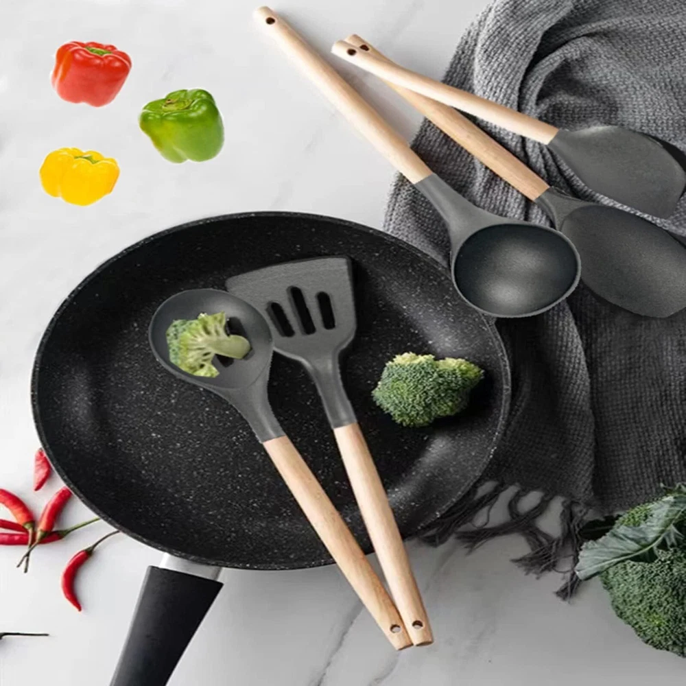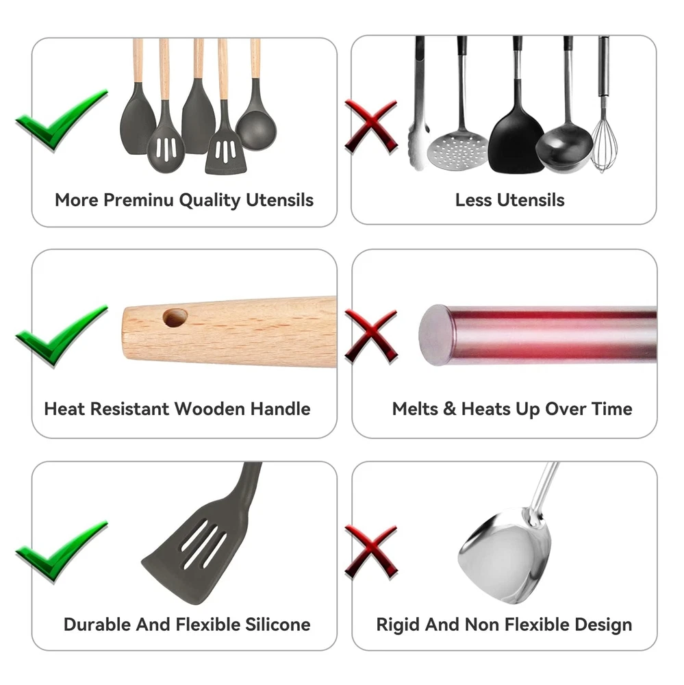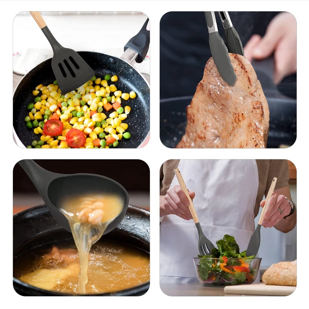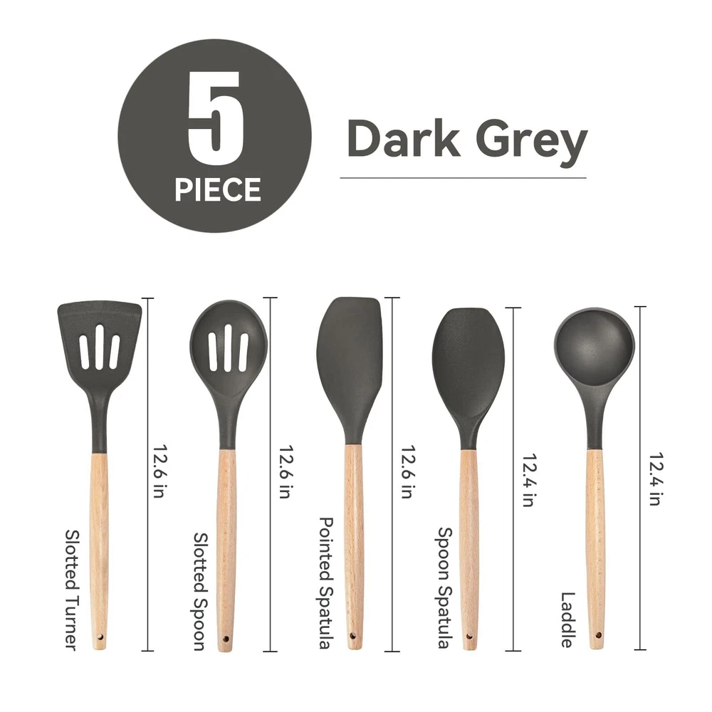 PREMIUM MATERIAL: Our kitchen cooking utensil set made of food-grade silicone head and hardwood handle.Cooking with the non-stick silicone utensils set will protect your cookware from any scratch,can be use well without melting, environmentally friendly and odorless, flexible with higher strength, used for a long time. EASY TO STORE AND CLEAN: The whole kitchen utensils set for nonstick cookware adopt a seamless design, and the soft silicone and wooden handle design make it beautiful and firm. Cleans up in seconds with warm water and soap, or dishwasher safe. Each end of the silicone spatula has a hanging loop, you can hang it up after cleaning to make it dry quickly. HEAT RESISTANT DESIGN: This silicone kitchen utensil High-temperature resistance range is 40°C -230°C (104°F-446°F), safe for hot food, stove, dishwasher, etc. The soft silicone design will not harm the coating of your pot and will not leave any traces, it is healthy and safe to use. Does not retain odor or color while you use the silicone cooking utensils. WIDE APPLICATIONS: This silicone cooking utensils set suitable for kitchen, restaurant, field camping, party barbecue, seaside vacation, etc. Great for chefs, bakers, pastry chefs, or amateurs. Ideal gift for anyone. Best for stirring, scraping, folding, cooking, and steaming all kinds of food. The non-stick silicone cooking utensils set is a must-have item for your kitchen. PACKAGE INCLUDES: You will receive 5 x silicone kitchen utensils, grey color, including 1 Spoon, 1 Spoonula, 1 Spatula, 1 Turner, and 1 Slotted Spoon.Each piece of silicone kitchen utensils offers a perfectly balanced weight and elegant design that will enhance your kitchen decor. If you have any questions about our silicone spatula set during use, please contact us in time, we will solve your problems as soon as possible.