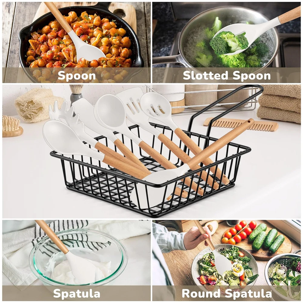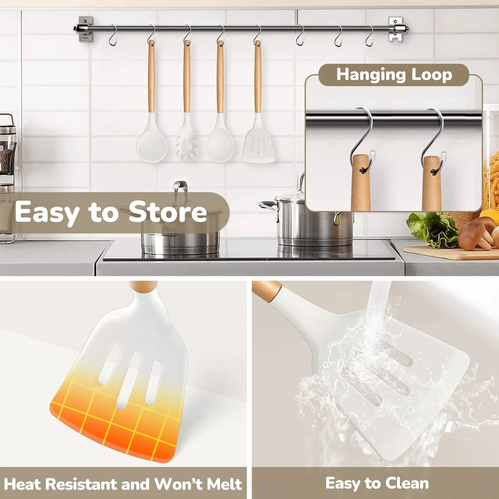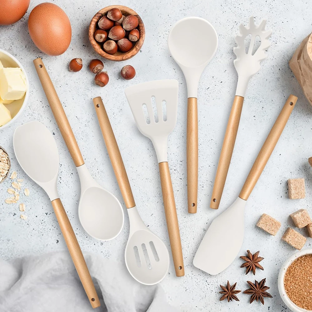 Silicone Kitchen Utensils Set of 7, made of food grade silicone and premium wood. No toxic substance leaching into food and won’t harmful to you and your families. The silicone heads are high heat resistant for no melting or deforming during. The silicone heads are strongly connected to wooden handles for not easily breaking off. Non-slip and ergonomic handles for comfortable grip. 7pcs kitchen cooking utensils for more convenient and practical in your cooking life. Specification List of Package: 7 pieces – pasta server, soup ladle, slotted turner, solid spoon, slotted spoon, spatula, spatula spoon Material: Silicone, wood Features: Nontoxic, heat proof, non scratch, non-stick, firmly connected Dimension (Length x Width) Pasta server – 12.35’’ x 2.25’’ Soup ladle – 12.5’’ x 3’’ Slotted turner – 12.75’’ x 3.3’’ Solid spoon – 12.5’’ x 2.75’’ Slotted spoon – 12.5’’ x 2.75’’ Spatula – 12.5’’ x 2.4’’ Spatula spoon – 12.4’’ x 2.6’’ Advantages Non Toxic – Made of food grade silicone and premium wood, ensuring nontoxic and healthy cooking. Heat Proof – Premium silicone heads are high heat-proof, no melting, no deforming or no bending when cooking. Long Ergonomic Handle – Long handle design keeps your hand away from the heat and wooden handles for better heat insulation to avoid burning your hand. Non Scratch – Soft silicone heads effectively avoid scratching your nonstick pans and pots’ surfaces. Easy Cleanup – Non-stick smooth surface helps easily clean by hands, make cleaning a breeze. Using Instructions 1. Please wash them with warm water before first using to wash off any residue left from manufacturing. 2. Please wash with soapy water and clean them with soft dishcloth or sponge to avoid scratching the surface. NOT DISHWASHER SAFE. 3. Please dry them immediately rather than air dry for a longer lifespan. 4. Please do not directly put the silicone kitchen utensils on the flame. FOOD GRADE SILICONE – kitchen utensils set is made of premium food grade silicone without any toxic substance and doesn’t react with food to affect its taste, Let you enjoy the pleasant and safe cooking experience HEAT RESISTANT – This cooking utensils set can withstand high temperature up to 446°F/230°C, No melting or deforming during cooking, Silicone head with high softness to keep your non-stick frying pans or stock pots from scratching, Extend their service life and long lasting for years, A great replacement of metallic cooking utensils ERGONOMIC WOODEN HANDLE – This silicone kitchen utensils’ handles are made of solid wood, Smooth surface without any sharp spurs to provide comfortable grip, Anti-scald wood handle effectively protects your hand from burning during heat transferring EASY CLEAN & STORE –Non-stick surface for easy food releasing to help clean easily, Hand wash recommended for better maintenance (No Dishwasher Safe), A utility hanging hole on the wooden handle for easily being hung neatly on the wall for convenient storage and drying faster after washing GREAT VALUE SET – The silicone cooking utensils set includes 1 X pasta server, 1 X soup ladle, 1 X slotted turner, 1 X slotted spoon, 1 X solid spoon, 1 X spatula, 1 X round spatula, 7 different shapes for meeting your daily basic cooking needs, Practical and versatile for turning, mixing, serving and more, A great helper in your kitchen