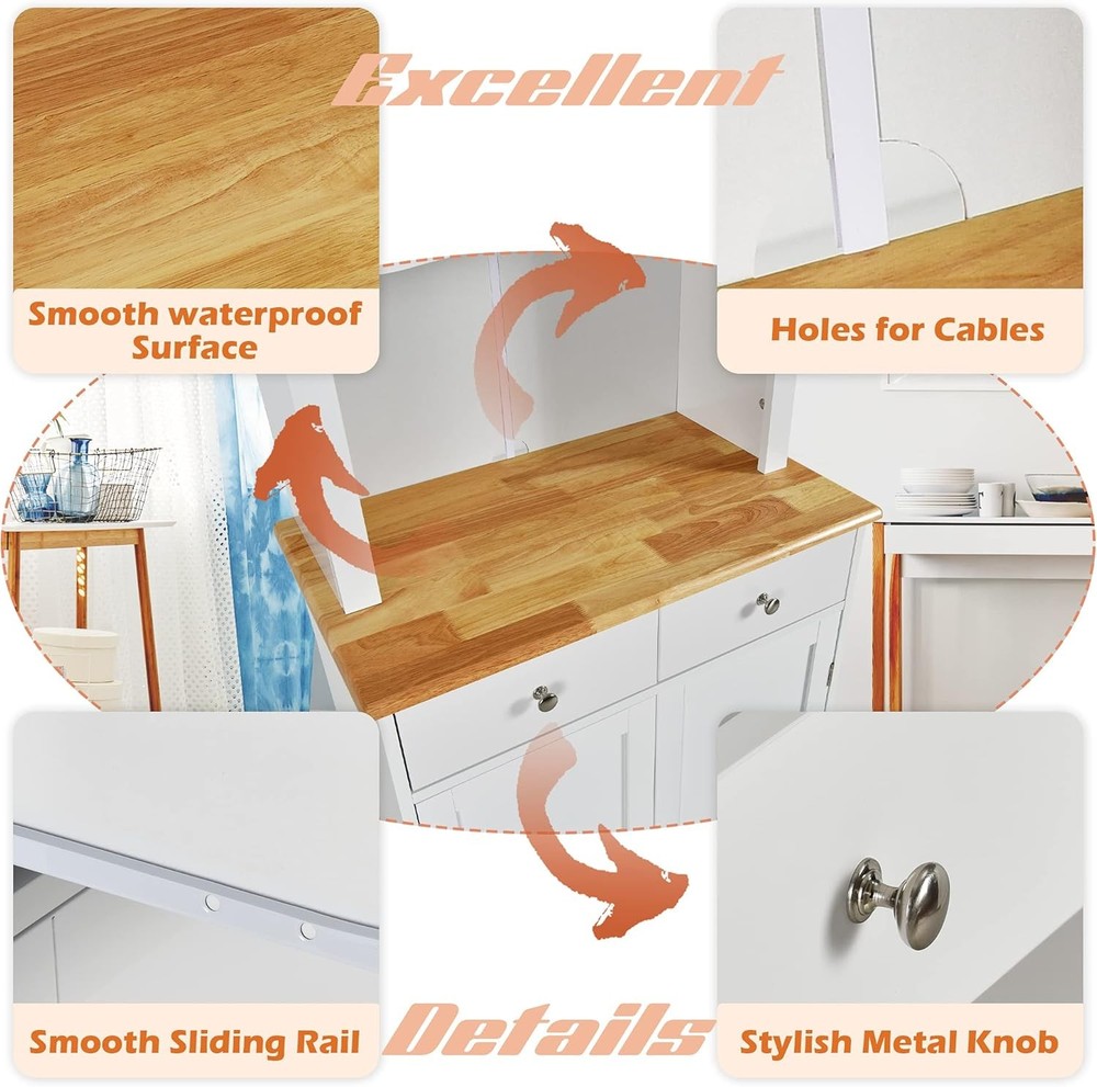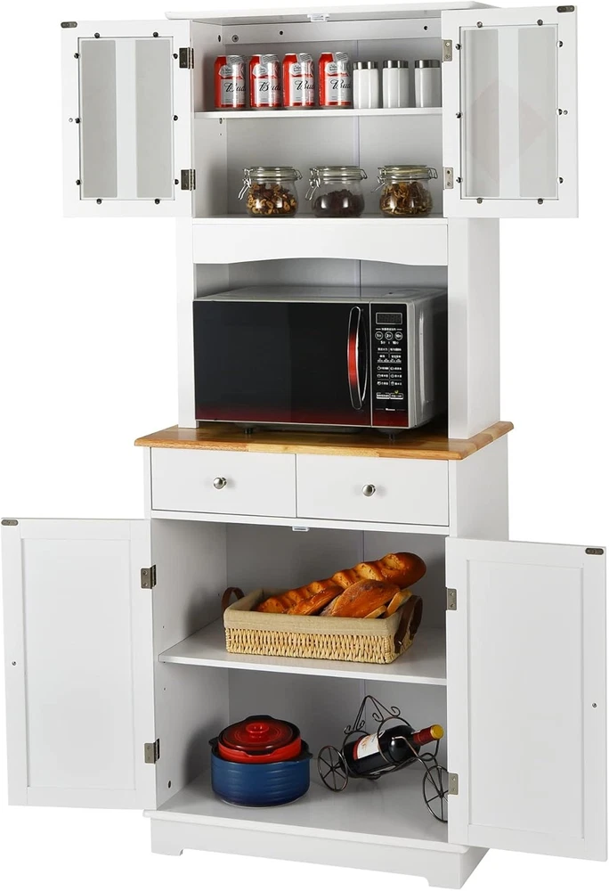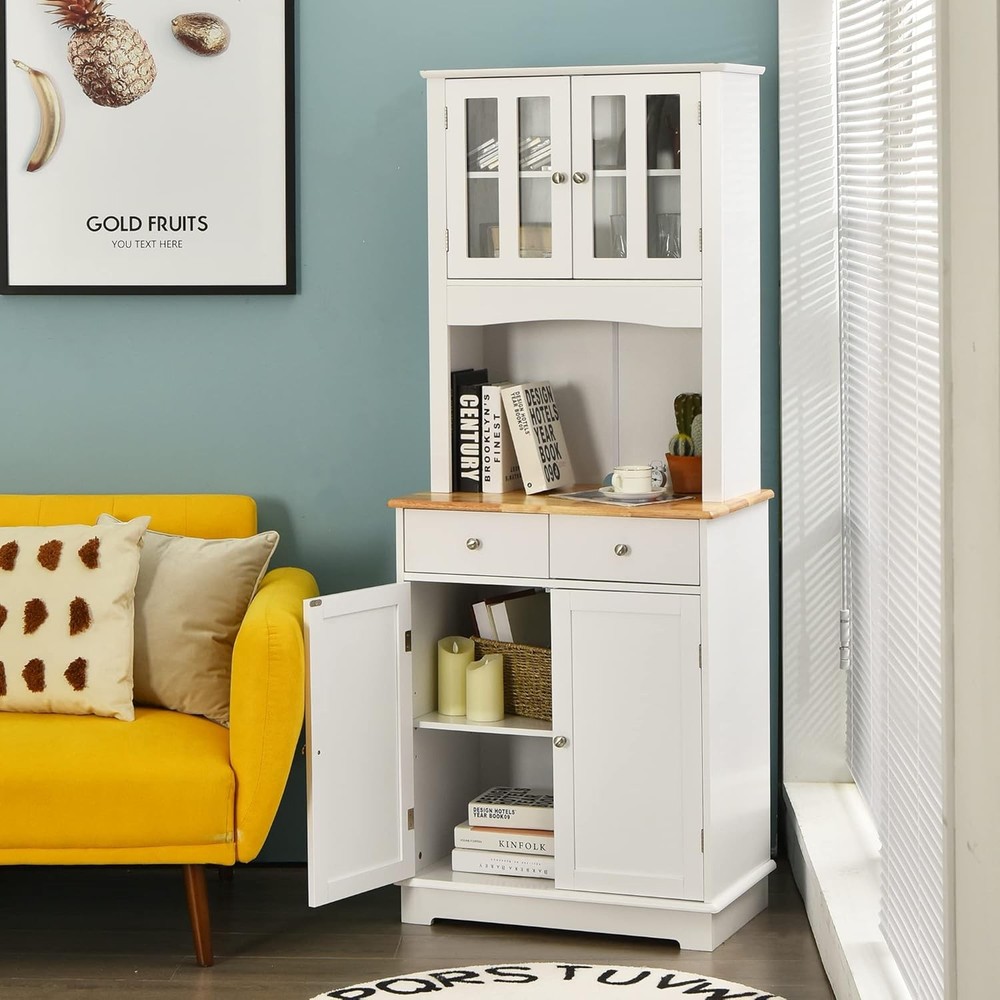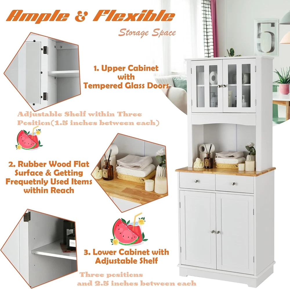 Kitchen Hutch Cabinet, Kitchen Cabinet with Framed Tempered Glass Doors, Flat Countertop and 2 Drawers, Kitchen Pantry Storage Cabinet with Adjustable Shelves, 27 x 16 x 67 inches (White) Product Description About this item - Let Me Stay in Your Kitchen - Nice to meet you here and let me introduce myself. My name is kitchen cabinet and my mission is to get your kitchen well organized by offering you with ample storage space! As can tell from the pictures left that I am not only decent in appearance but also function well. Would you give me a chance to stay in your kitchen? - Various Storage Space - This pantry cabinet gives you sufficient storage space to store multiple kitchen utensils and make them to be easily located when you need them. The flat rubber wood countertop could be used to place your microwave oven. The upper cabinet with tempered glass doors and the lower cabinet offer extra storage space for kitchenware and dinnerware. - Materials Self-statement - The majority of this kitchen hutch cabinet is made of P2 MDF, making it extra solid for daily use. The surface is waterproof for easy maintenance. The rubber wood countertop has great heat resistance, allowing you to prepare some food there. For extra stability, the kitchen hutch could be attached to the wall firmly with included expansion bolts. - Smart Design - 1. Adjustable Shelf: Both of the two shelves inside the two cabinets are adjustable in three positions for flexible storage. The distance between each position varies respectively that 1.5 inches in the upper cabinet while 2.5 inches in the lower large cabinet. 2. For better using the microwave oven on the countertop, we’ve left a hole to let the cables go through on the back panel. Our buffet cabinet would just serve its purpose well thanks to the smart details. - What Cares - Your 100% satisfaction means a lot to us and we will exert great effort to make things simple for you. Should you have any problem with this kitchen pantry storage cabinet, just feel free to contact us and we would be glad to offer you with feasible solution to make it settled.