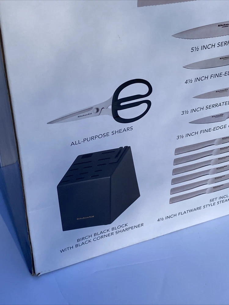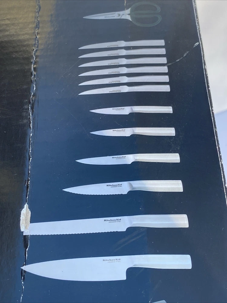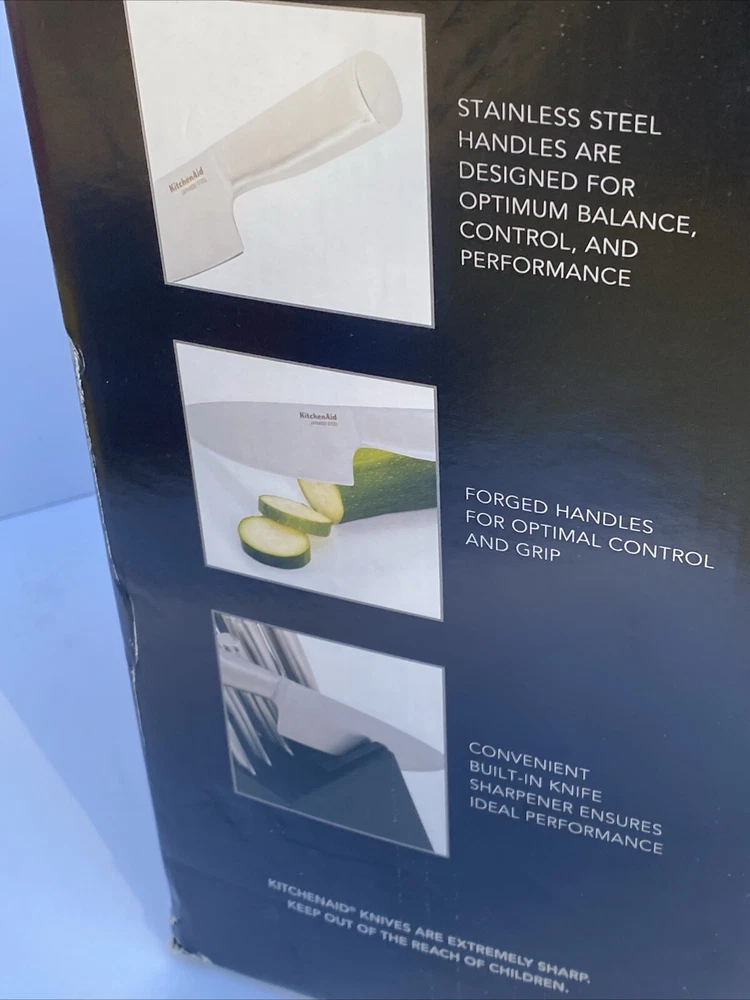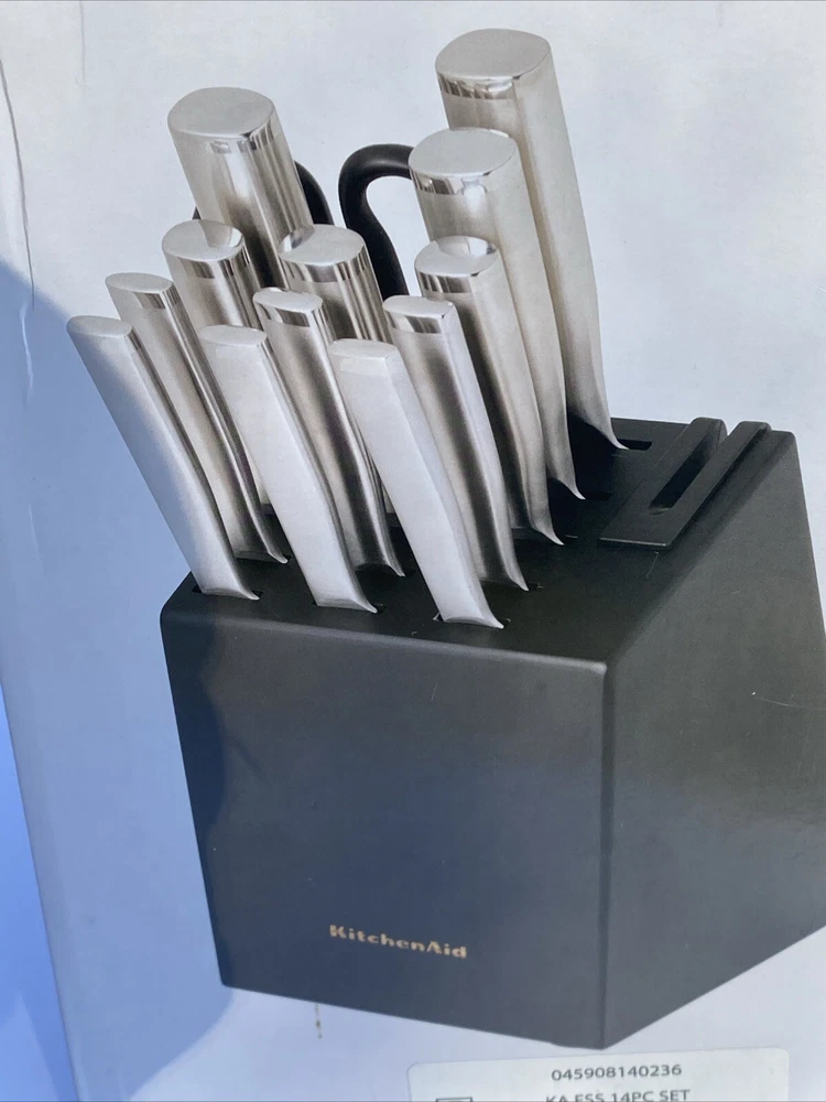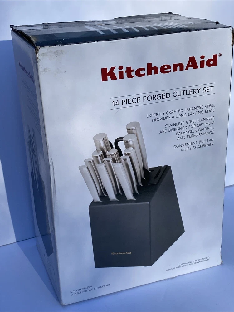 The KitchenAid 14 Piece Forged Cutlery Japanese Steel Knife Set is a high-quality set that includes 11 items in a stainless steel block with a sharpener. The knives are made of durable stainless steel, ideal for cutting vegetables, fruit, cheese, and meat. This set is designed with a modern stainless steel handle and is perfect for any kitchen.