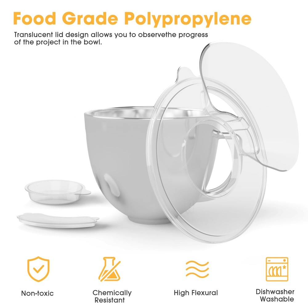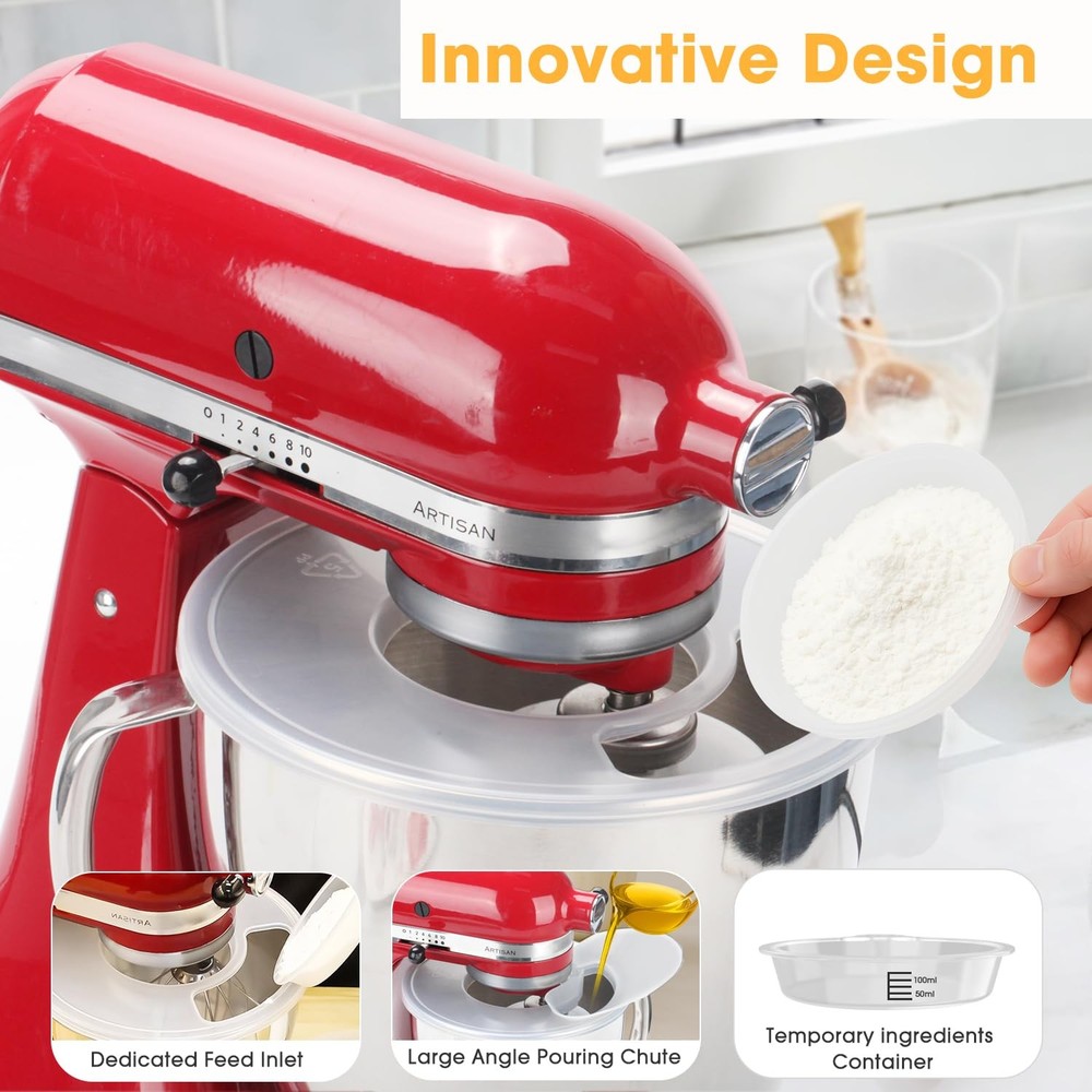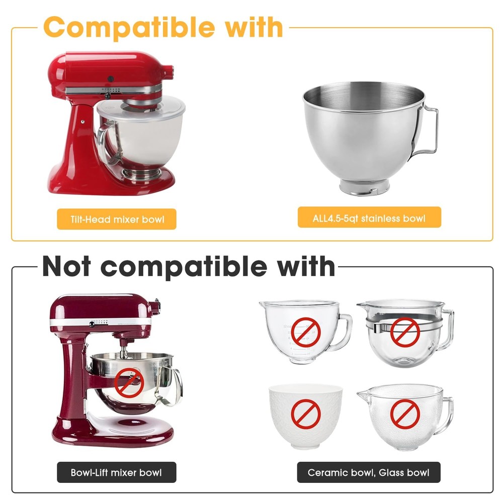 Upgrade Mixer Bowl Cover for KitchenAid 4.5-5 Qt Tilt-Head Stand Mixer, Splash Guard with Extra Pouring Window and Flip for KitchenAid Mixer [Wide Compatibility]: The mixer bowl covers are design for KitchenAid 4.5-5QT Tilt-Head Stand Mixers, compatible with models: K45SS, KSM75, KSM90, KSM95, KSM150PS, KSM152PS and KSM155GB and so on. Adopt a fully enclosed design with no dead ends in all directions, perfectly preventing spills and splashes. Providing you with an easy and convenient cooking experience. [Premium Material]: These mixer splash guards are made of great quality polypropylene, Chemical and heat resistance, Odorless, non-toxic. It can be easily and safe cleaned in the dishwasher or by hand washing. Convenient to install and remove and can be used easily without practice. It is also easy to clean and maintain, just rise and wipe with water and a soft cloth after use. [Innovative Design]: Features an extra pouring window and flip-top design with a large angle pouring chute that allows you to add a variety of ingredients with ease; the full wrap-around pouring shield and pouring chute dust cover perfectly retains the ingredients in the center of the mixing bowl, and the mixing will be more efficient and thorough, effectively preventing splashes and spills when mixing lightweight ingredients such as flour, and minimizing countertop messes. [Exclusive Appearance]: The transparent lid design allows you to observe the progress of the project in the bowl. The inner of the bowl lid is a small bowl marked with a scale of 150ML. When your mixing is over or paused, you can cover the bowl cover to achieve dust-proof and fresh-keeping effect. [After Sale Support]: We provide 30 days money back and 12 months warranty for every consumer, if you have any questions about the mixer splash lid, please feel free to contact us, we will be here to help you.