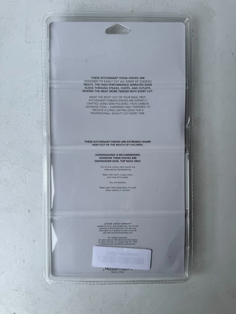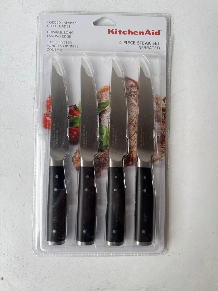 KitchenAid Gourmet 4-Piece Steak Knife Set Serrated Stainless Steel Blades Black Description KitchenAid Gourmet 4-Piece Steak Knife Set Serrated Stainless Steel Blades Black. Product Detail • Brand : KitchenAid • Material : Stainless Steel • Blade Color : Silver • Type : Knife Set Please message me if you have any questions.