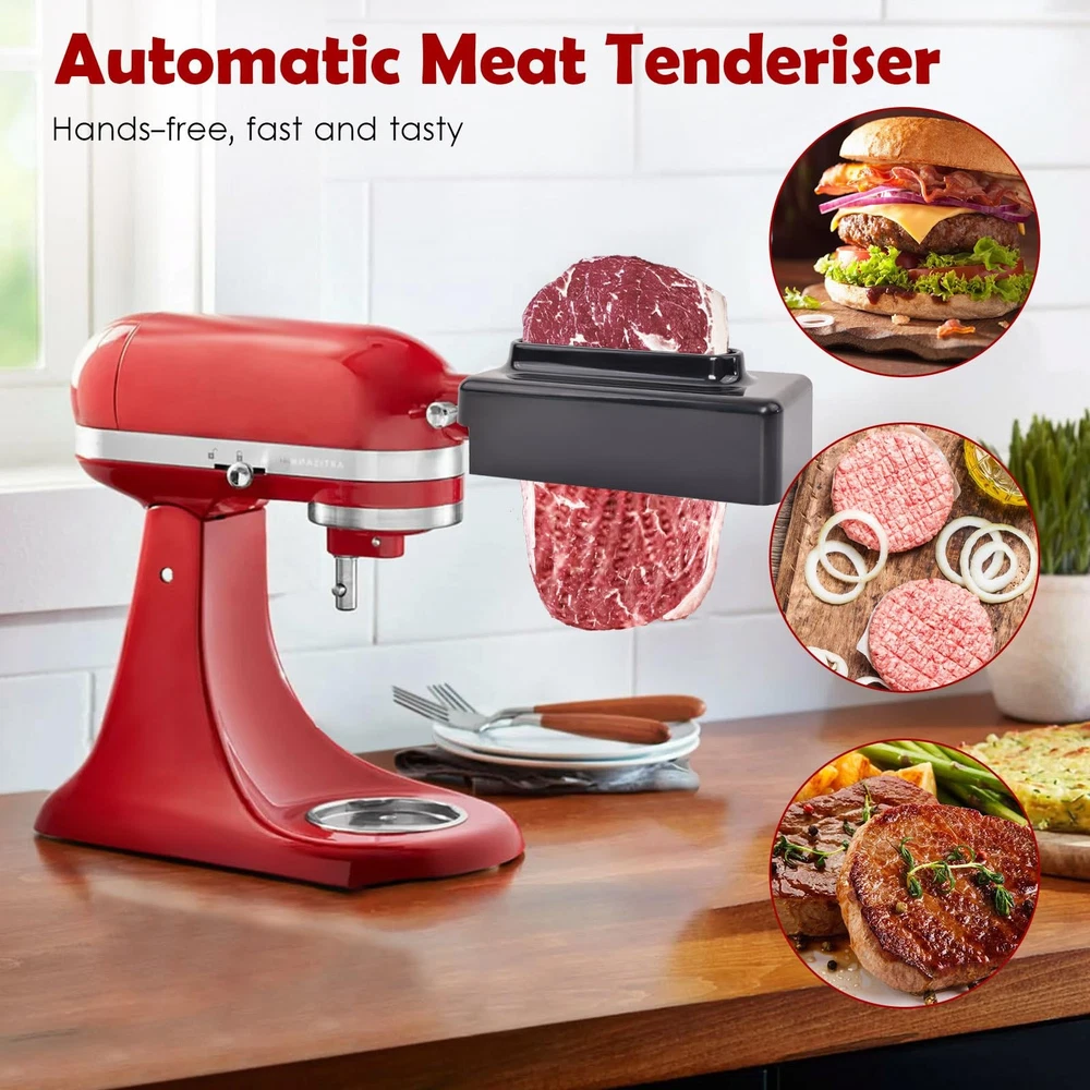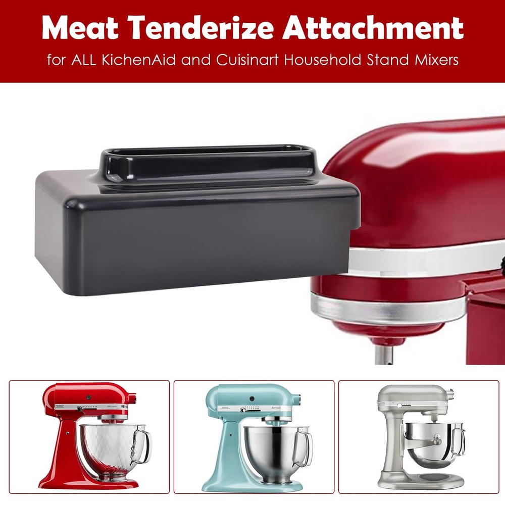 The meat tenderiser for KitchenAid and Cuisinart home stand mixers has been improved many times for smoother use. The use of metal gears solves the problem of plastic gears breaking easily and makes it more durable. It is suitable for meats such as beef, lamb and pork (meat thickness ≤ 4/5 inches or 2 cm). Using the meat tenderizer reduces marinating and cooking time, makes it easier to flavour your favourite meats and softens hard meats in less than 10 seconds. It is made from aluminium alloy, which is lightweight and strong, durable and non-rusting, and will keep your meats in their original flavour. Cleaning is easy too, you can hand wash it with warm water and neutral detergent or use the dishwasher and dry it immediately after rinsing. Meat Tenderizer Attachment: fits ALL KitchenAid and Cuisinart household stand mixers. Stainless Steel: Upgraded metal gears, won't rust, lightweight, strong and durable. Prevent breakage, smoother to use. Suitable Meat: Suitable for beef, lamb, pork, etc (meat thickness ≤4/5in). Do not use it on fish or chicken as chicken and fish are already tender and can be easily crushed using it. Easy to Set and Use: Simply attach it to the front port of your stand mixer to soften tougher cuts of meat in less than 10 seconds, reducing marinating and cooking time. Meat marinated with the meat tenderizer attachment for kichenaid stand mixer is more flavourful than untenderised meat, retaining maximum flavour and making it easier to chew. Easy to Clean: Can be cleaned with water and mild detergent. Or use a DISHWASHER. This meat tenderize accessories and attachment for kitchen aid and cuisinart stand mixer is a great addition to the kitchen.
