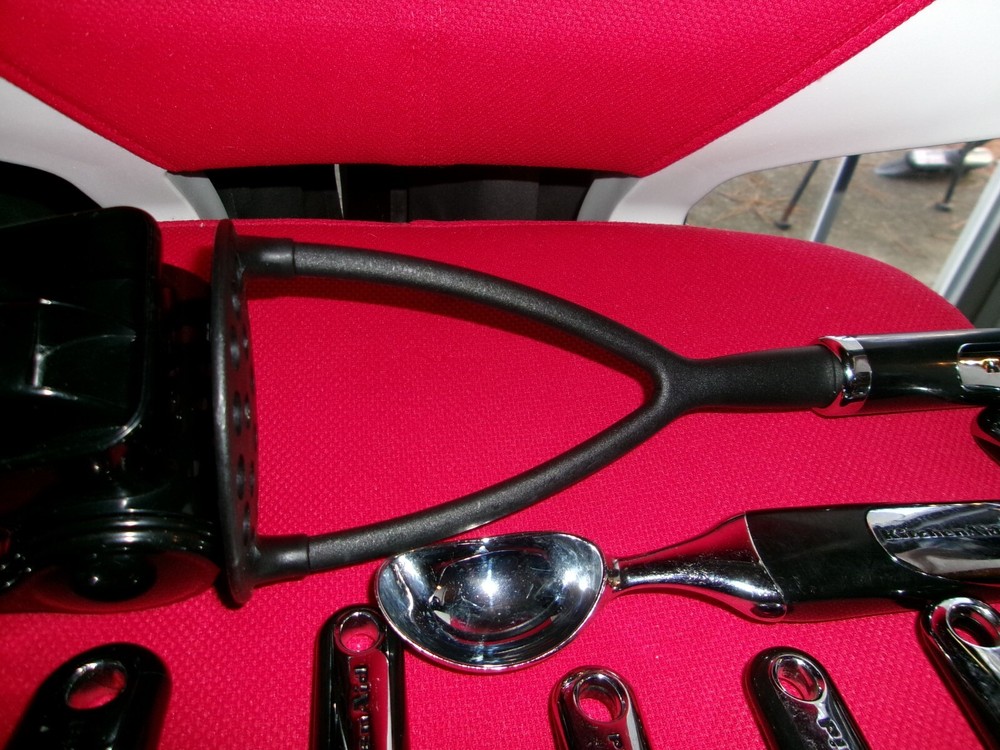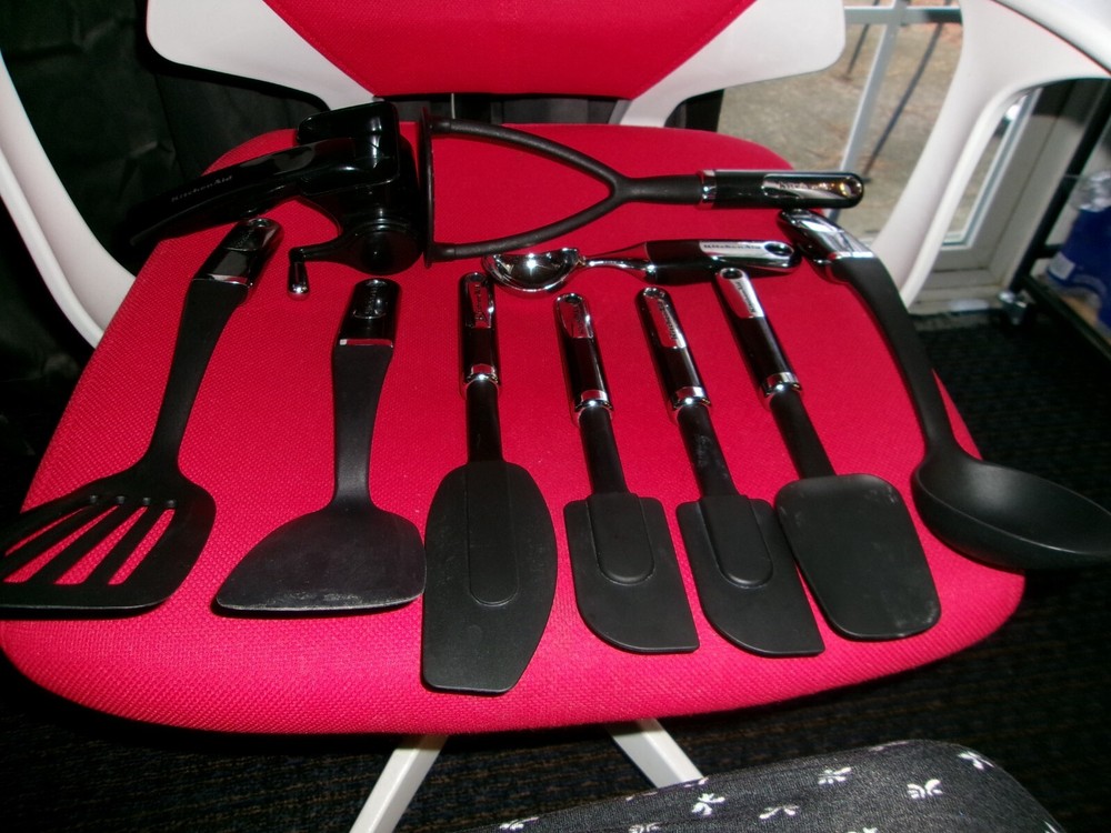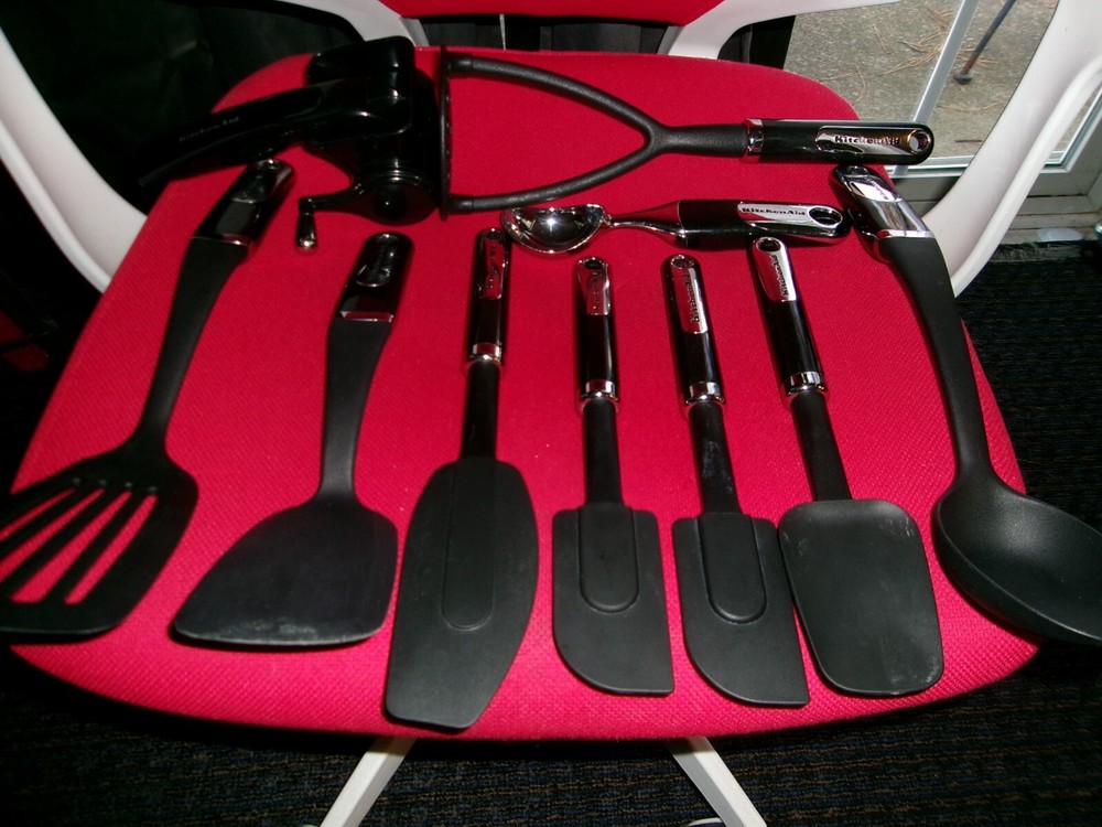 The "KitchenAid Tools" set includes 11 pieces of black kitchen utensils made of plastic. The set encompasses a variety of all kinds of tools with plastic handles, ideal for cooking and food preparation. It is designed for use in the kitchen and is a part of the KitchenAid brand.