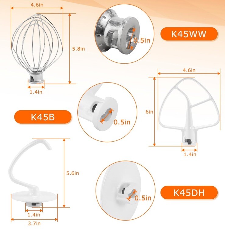 BRAND NEW Kitchen Aid Tilt Mixer Attachment 3-Piece Set. Set contains 1 x K45WW 6-wire whip, 1 x K45DH C Dough hook and 1 x K45B Flat Beater. Specially designed for Kitchen Aid Tilt-head stand mixer.
