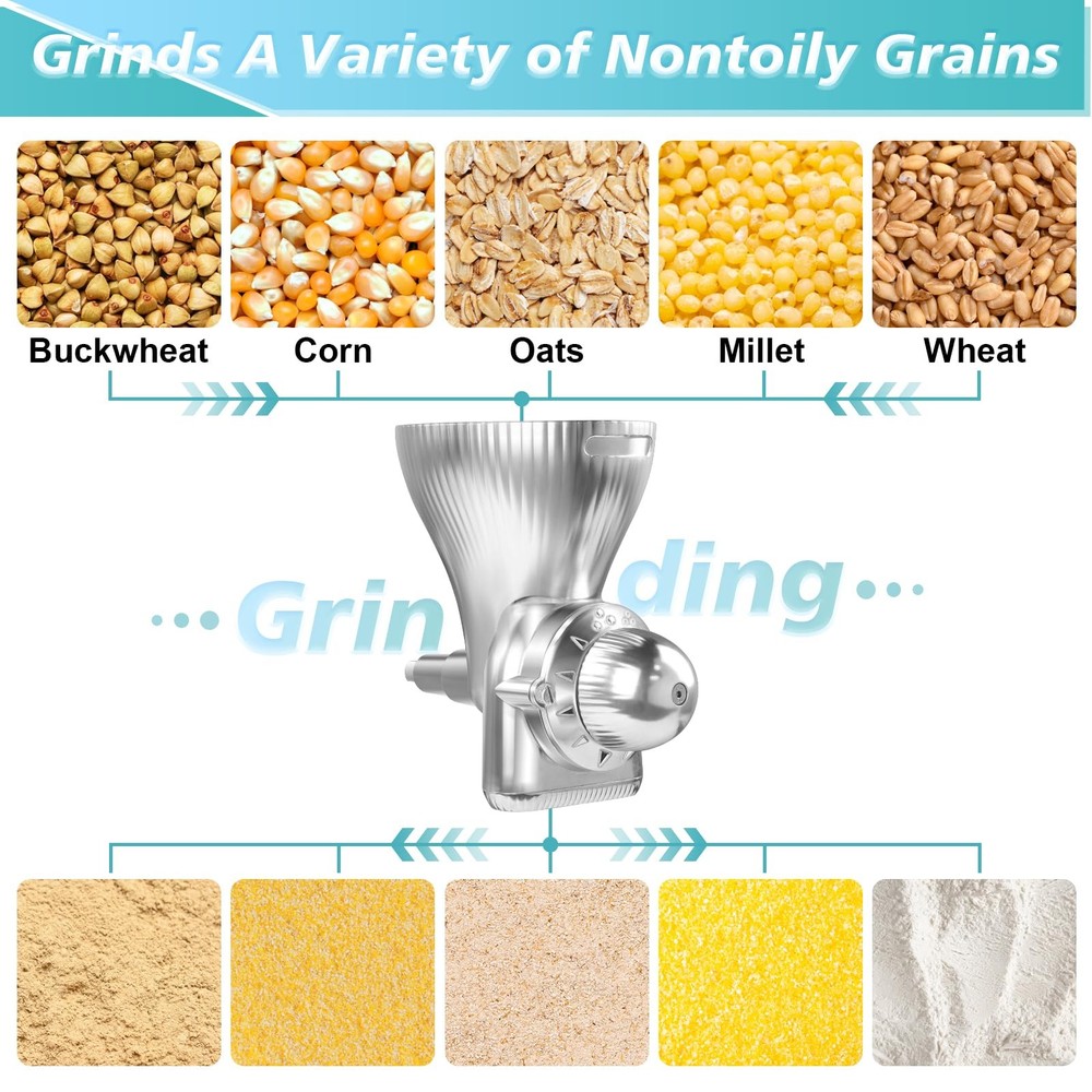 All Metal Grain Mill Attachment : The grain mill attachment is made of high-quality, which is durable and rust-resistant - Flour mill attachment is specially designed for all KitchenAid stand mixers, fitting greatly for your KitchenAid stand mixers for perfect grinding result. All Metal Grain Mill Attachment : The grain mill attachment is made of high-quality metal, which is durable - Flour mill attachment is specially designed for all KitchenAid stand mixers, fitting greatly for your KitchenAid stand mixers for perfect grinding result. Adjustable Grinding Degree : The grain mill attachment for kitchenAid stand mixer is a adjustable grinding accessory, The grain mill attachment has 12 different grinding levels, allowing you to adjust the fineness of the ground grain from coarse to fine, suitable for different types of grains and spices. Wide Application : Effortlessly grinds a variety of non-oily grains, including wheat, oats, rice, corn, barley, buckwheat, millet, and other cereals. Tips : Avoid oily or moist seeds (peanuts, soybeans, sunflower seeds) . Their high oil or high-moisture contents can damage the grinding mechanism. Easy Use and Clean : The grain mill attachment is directly linked to the kitchenAid stand mixer, and once the tray is installed, grinding can begin. The grinding chamber and grinding blades are detachable, making it easy to clean and maintain. Simplifies the cleaning process with an included brush, ensuring easy maintenance after each use, especially when switching between different types of grains. Do not immerse grain mill in water or other liquid. Do not wash in dishwasher. High-Quality After-Sales Service : The grain mill attachment comes with an instruction manual. Please read it carefully before use. If you have any questions during use, tell us and we will try our best to solve your problem.