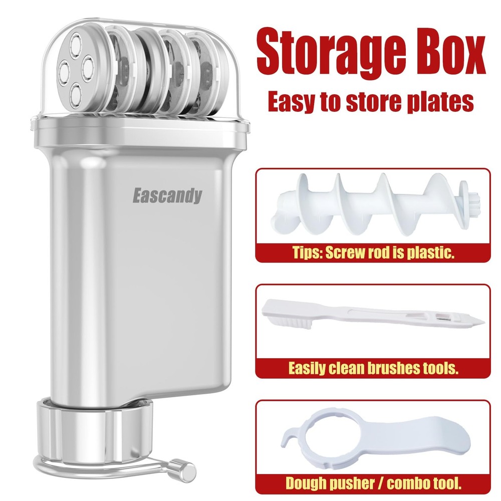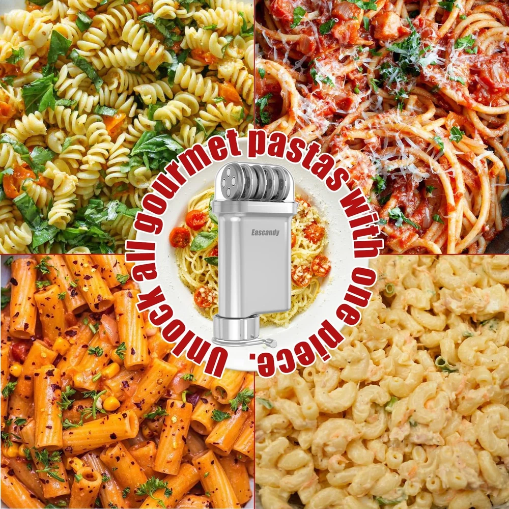 Bring the joy of fresh, homemade pasta to your kitchen with the Stainless Steel Gourmet Pasta Press Attachment. Designed exclusively for use with all KitchenAid Stand Mixers, this pasta press is made from durable, high-quality alloy metal, offering superior durability and performance compared to plastic alternatives. Whether you're craving spaghetti, rigatoni, or fusilli, our versatile pasta maker comes with 5 interchangeable pasta plates, allowing you to create your favorite pasta shapes with ease. The all-metal design ensures that this pasta press lasts longer and withstands heavy use, making it a superior choice over plastic versions. Cleaning is a breeze with the included cleaning tool that removes dough from the press and plates effortlessly, while several components are also dishwasher-safe for added convenience. Upgrade your pasta-making experience with the Gourmet Pasta Press Attachment and enjoy fresh, restaurant-quality pasta at home whenever you like! Premium Metal Construction – Made with high-quality alloy metal material, our pasta press is more durable, longer-lasting, and better than plastic alternatives that may crack over time. 5 Versatile Pasta Plates – Quickly switch between discs to make a variety of pasta shapes, including spaghetti, bucatini, rigatoni, fusilli, large macaroni, and small macaroni. Easy to Clean with Included Tools – Designed for hassle-free cleaning with an included cleaning tool to remove dough from plates and press components, pasta ring, and combination tool. Compatible with All KitchenAid Mixers – Easily create fresh, homemade pasta with the Gourmet Pasta Press Attachment, designed to fit all household KitchenAid Stand Mixers. Professional Pasta-Making at Home – Enjoy restaurant-quality pasta with the convenience and performance of a professional-grade, stainless steel press that’s designed to outlast and outperform plastic models.