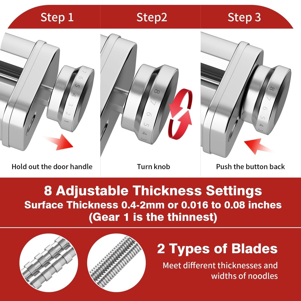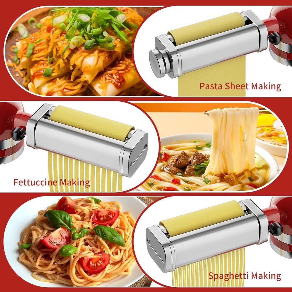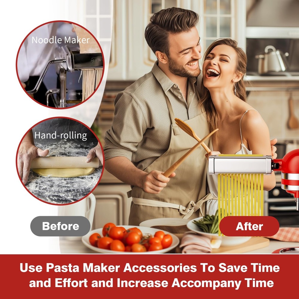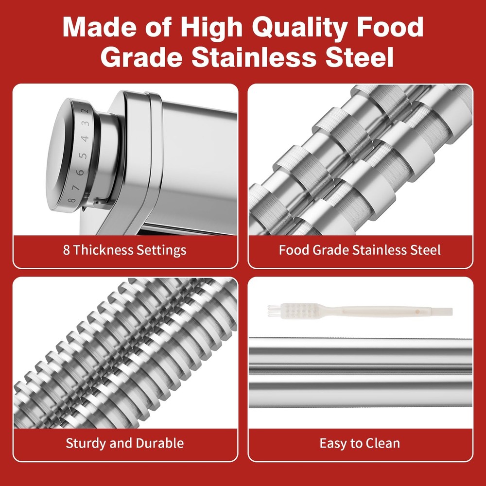 This pasta maker attachment for kitchenaid mixer is made of high-quality SUS304 stainless steel material, creating a safe and stable user experience. Internally integrated high-precision stainless steel gears ensure low-noise operation and efficient noodle making, perfectly compatible with all KitchenAid mixers, upgrading your kitchen life. Compared to traditional manual noodle makers, it greatly saves time and energy, making noodle making easy and fast.Kitchen aid pasta maker is specially designed with 8 thickness adjustments, ranging from delicate 0.4mm to wide 2mm, including 1.6mm fine noodles and 6.3mm wide noodles, to meet your creative needs for various types of pasta. When using, it is recommended to set the mixer speed to 2 or 3 gears when using drum accessories, and 3-5 gears when using cutters to achieve the best production effect. Cleaning and maintenance are equally easy, whether using the built-in cleaning brush, dry cloth wiping, or directly rinsing with running water, the machine can be easily kept clean as new. But please be careful not to soak it in water or put it in the dishwasher for cleaning. Giving this pasta cutter for KitchenAid stand mixer as a gift to family and friends who already have a pasta attachment for kitchenaid stand mixer at home is not only a practical choice, but also an encouragement to their cooking passion. Let them, who love cooking, have more time to explore the fun of more delicious food while enjoying the ease of making noodles. Get a pasta maker now and embark on a wonderful and convenient culinary exploration journey! NEW EXPERIENCE OF PASTA UPGRADE: “This kitchen aid pasta attachment for KitchenAid stand mixers is compatible with all KitchenAid stand mixers. It is easy to connect and operate, and it aims to enhance the pasta-making experience, simplify the production process, and extend the service life of the accessories.” MULTIFUNCTIONAL PASTA ACCESSORIES: This pasta roller for kitchenaid attachment has 8 thickness Settings (0.4 mm to 2 mm), you can easily adjust the thickness of the pasta sheet to suit your needs, and use it to make Wonton, Italian dumplings, pancakes, corn cakes, dumplings and more. Use Fettuccine Cutter and Spaghetti Cutter to cut pieces of pasta into 1.6 or 6.3 mm (0.06 inches or 0.25 inches) wide noodles to make delicious pasta, such as pasta, lasagna, etc. Enjoy the process, stimulate your taste buds, and taste delicious food. PASTA GOOD HELPER: Pasta attachment for kitchenaid is made of high-quality SUS 304 stainless steel material, designed to be sturdy and safe. It is equipped with high-precision stainless steel gears to achieve low-noise and efficient noodle production, making it an ideal choice for improving noodle quality. However, the attachment is not belong to KitchenAid. EASY TO CLEAN: This pasta maker for kitchenaid attachment is easy to clean. It is recommended to use a cleaning brush or a dry soft cloth to rinse and dry under running water, but it should not be washed in a dishwasher or soaked in water for a long time. The accompanying cleaning brush and stainless steel polished surface simplify the maintenance process. GIVING AND RECEIVING, SHARING JOY: Pasta attachment for kitchenAid stand mixer is an ideal gift designed for cooking enthusiasts who own a kitchenAid stand mixer. It allows family or friends to easily enjoy the fun of making fresh pasta at home, making it an excellent choice to express their feelings during holidays or birthdays. The kitchen pasta maker aid is compatible with all KitchenAid mixers and is the perfect addition for culinary enthusiasts. WARM SERVICE: If you encounter any problems while using the pasta attachment for kitchenaid, please feel free to contact us at any time. We promise to respond quickly within 24 hours, committed to achieving your satisfaction and making every use of Pasta maker for kitchenaid mixer worry free, enjoying convenience and peace of mind.