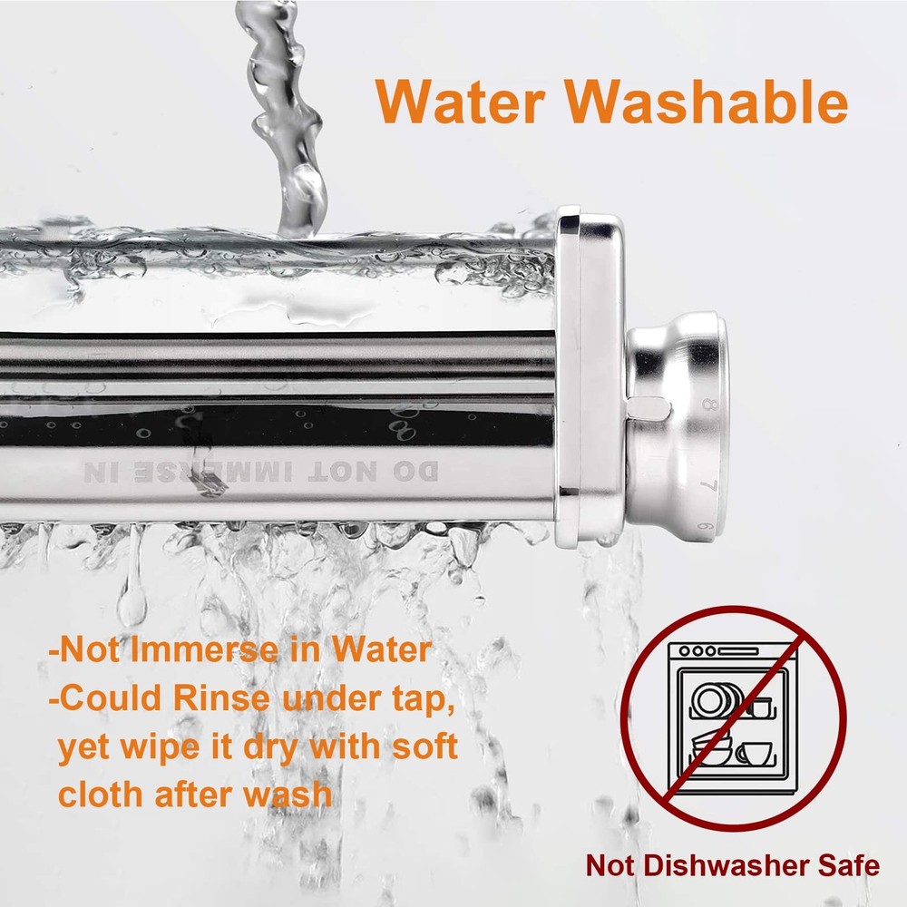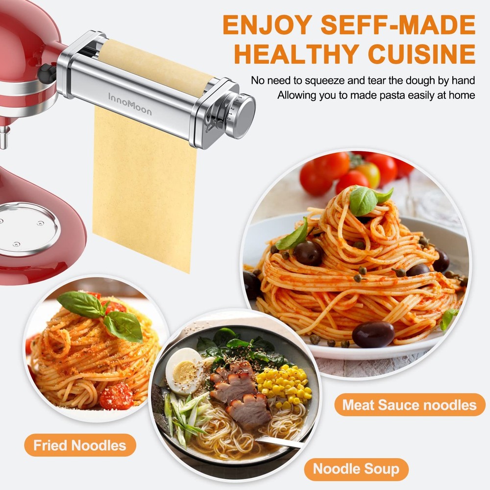 Stainless Steel Pasta Roller & Cutter Attachments, design for Kitchen-Aid Stand Mixers, to work as Professional Pasta Maker. Enjoy making fresh pasta with your family at home ! Easy to Use-Easily inserts into your stand mixer: ~ Pasta Sheet Roller easily roll 5.5-inch sheets of pasta with 8 thickness settings(0.4mm-2mm), adjust to your desired sheet thickness. Help you make different thickness of fresh pasta, for Ravioli, Tortellini , Agnolotti, Dumplings, Empanada, Lasagna, Noodles... ~ Spaghetti Cutter cuts pasta sheets into classic Spaghetti noodles, tagliolini ~ Fettuccine Cutter cuts pasta sheets into hearty Fettuccine noodles, linguini ~ Plastic dough scraper /cutter help knead, cut and quickly transport dough, nice dough preparing tool ~ Cleaning Brush included help clean attachments ~ Instruction and Recipe book included Food Grade Stainless Steel Construction for durable long lasting performance and healthier fresh pasta -Food grade and High quality stainless steel components, including outer housing and inside axle-rollers, cutters / blades and gears. Compatibility Our attachment specially designed for KitchenAid Stand Mixer, all household models. Maintenance and Cleaning: To protect product specially the precise gears inside, Do not Immerse in Water ! Also Not put into dishwasher! Could wash under tap. yet then need clean by cleaning brush or dry soft cloth. 24hrs customer service stand by for you, please contact us for any question Note: This attachment is designed for Kitchenaid stand mixers, yet not a Kitchenaid brand product, not created by Kitchenaid. 3 Set Pasta Attachment for KitchenAid: Pasta maker attachment for kitchenaid mixer include pasta sheet roller,spaghetti,fettuccine cutters; Three separate stainless steel pasta fabrication components can save you the trouble of hand-rolling and cutting. Just a few minutes to enjoy a gourmet pasta meal at home. Say goodbye to the manual pasta maker machine, save your time and energy. (Yet this attachment does not belong to KitchenAid) Sturdy & Efficient: Commercial Stainless Steel Construction, ensure smoothly rolling and clean cutting of Pasta dough sheet.This pasta attachment for kitchenaid stand mixer is made of high-quality 304 stainless steel.High precise Stainless Steel gears inside ensure making pasta efficiently in a low noise way. Durability is much better than the "3 shaft in 1 set" pasta maker attachment on the market. Multifunction Pasta Attachment for Kitchenaid Mixer: Include Pasta Sheet Roller, Fettuccine Cutter, Spaghetti Cutter Attachment, cleaning brush and user manual,plus 1 Dough Scraper to help you make authentic, fresh pasta quickly and easily. The pasta maker attachment for kitchenaid mixer is necessary kitchen gadget for people who love handmade a variety of pasta at home. 8 Thickness Setting: Pasta attachment for kitchenaid mixer can be adjusted in 8 thicknesses (0.4mm-2mm or 0.016 to 0.08 inches) through the knob to make delicious food: Ravioli, Tortellini, Dumplings, Empanada, Lasagna, Noodles and more, caters to all your pasta making needs. This kitchen aide pasta maker attachment makes having homemade pasta and noodle a breeze. Easy Clean and Reliable Service: With over 10 years professional design and manufacturing experience on stand mixers, this pasta attachment for kitchenaid mixer are created to easy to attach, easy to use. The cleaning brush included and product high polishing surface all help clean easily. Not Dishwasher Safe, please wash it and dry it. If you have any questions about the products, please contact us.