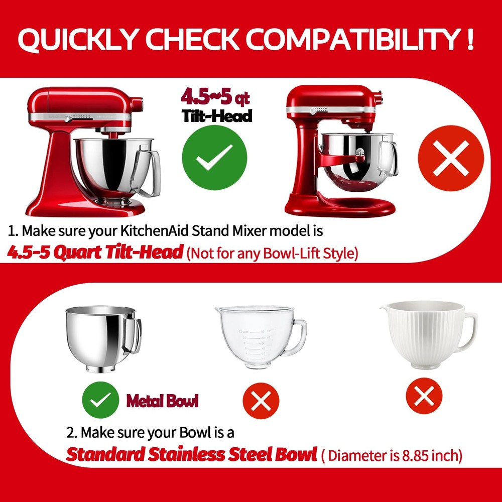 Please note: This pouring shield is not compatible with glass bowls, ceramic bowls, or bowls larger than 5 quarts. 【Wide Compatibility & Totally Enclosed Design】's pouring shield accessories and attachments for kitchen aid stand mixer is made of food-grade PC plastic, carefully designed to be perfectly compatible with the KitchenAid 4.5 -5 QT Tilt Head Stand Mixer Stainless Steel Bowl. Based on market, adopts a fully enclosed design with no dead ends in all directions, perfectly preventing spills and splashes. Providing you with an easy and convenient cooking experience 【Innovative flip-top design】Add your desired ingredients at any time. Simply push and pull with your finger to operate. 【Clean, Relaxing, and Enjoyable Cooking Experience】features a brand new design with a large angle pouring chute that allows you to add a variety of ingredients with ease; the full wrap-around pouring shield and pouring chute dust cover perfectly retains the ingredients in the center of the mixing bowl, and the mixing will be more efficient and thorough, effectively preventing splashes and spills when mixing lightweight ingredients such as flour, and minimizing countertop messes 【Safer Food Grade Materials】closed mixing bowl cover shield is made with food-grade plastic, which possesses good corrosion resistance to acid and alkali, is environmentally friendly, non-toxic, odorless, and durable. At the same time, the mixing bowl shield has excellent mechanical properties, its impact strength is good, and even if the mixing bowl shield is destroyed, it will only be torn and will not produce a lot of flying debris, safe and reliable. 【Easy to Install and Clean】splatter guard for the mixer is very easy to install and remove and can be used easily without practice. It is also easy to clean and maintain, just rinse and wipe with water and a soft cloth after use.