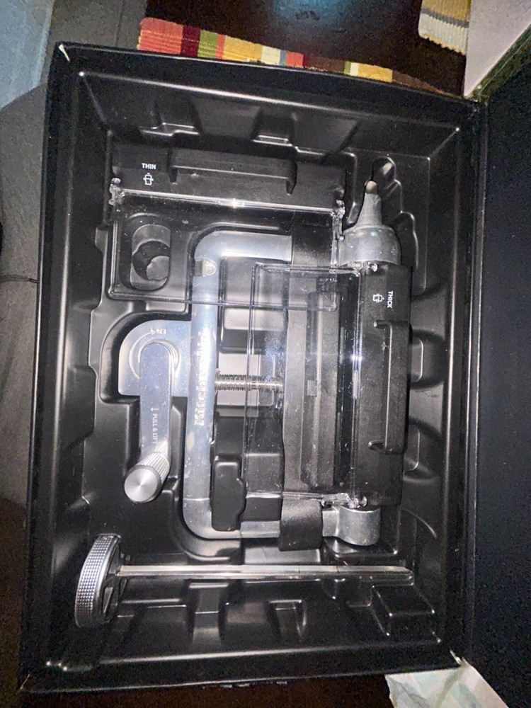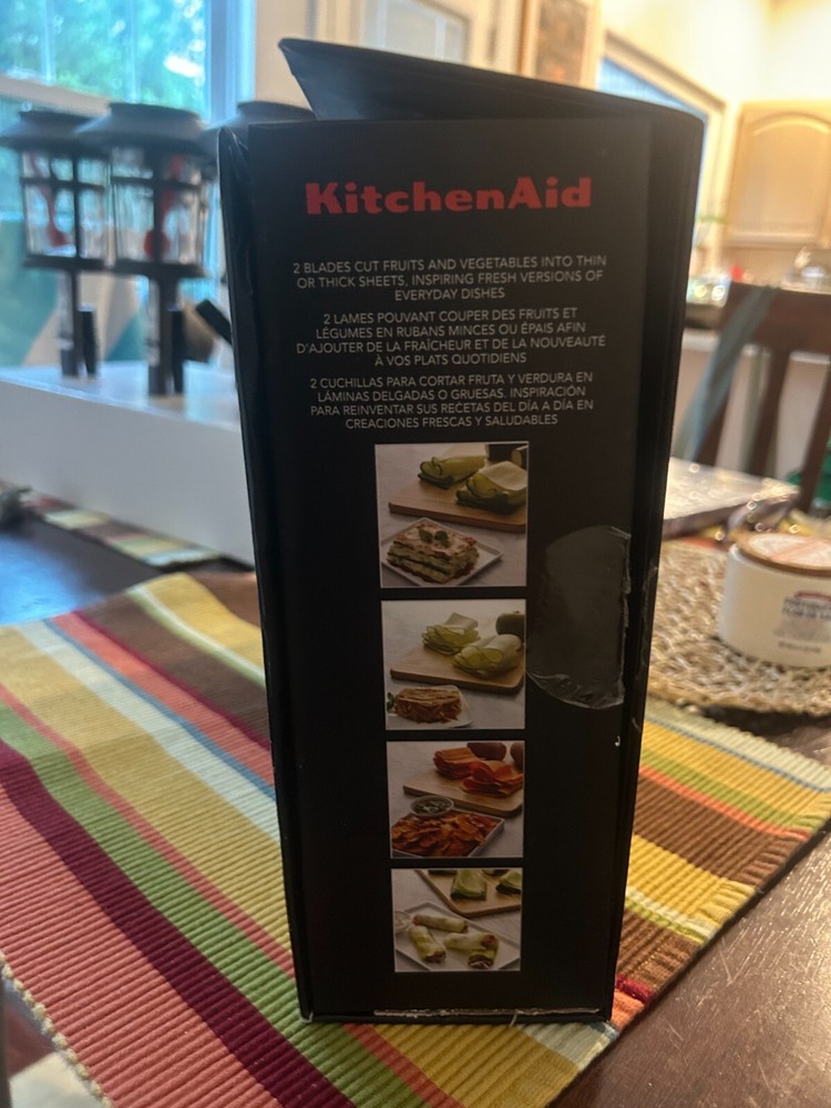 KitchenAid Vegetable Sheet Cutter attachment – lightly used and fully sanitized. The tool and all components are clean and in excellent working condition; the original box has some marks but is included. Compatible with all KitchenAid stand mixers Includes cutter and core removal blade Easy to clean, all parts sanitized before shipping