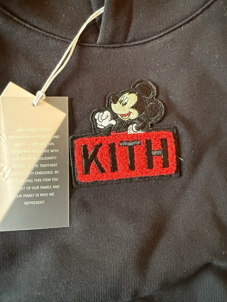 This is a Kith Baby X Disney Mickey Box Logo Hoodie in black, designed for ages 9-12 months. Made of 100% cotton knit fabric, this unisex baby and toddler outfit includes a hoodie featuring the iconic Disney character Mickey Mouse. The hoodie is accented with the KITH logo, making it a stylish and fun addition to any little one's wardrobe.
