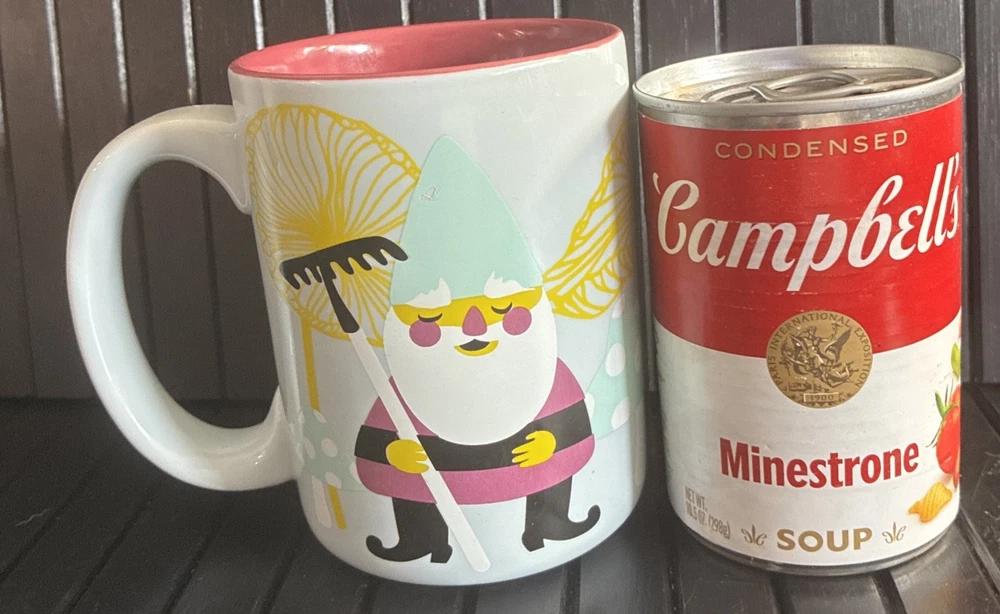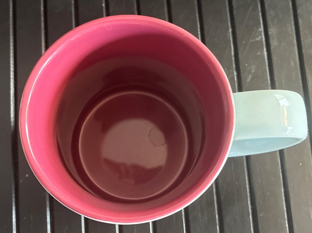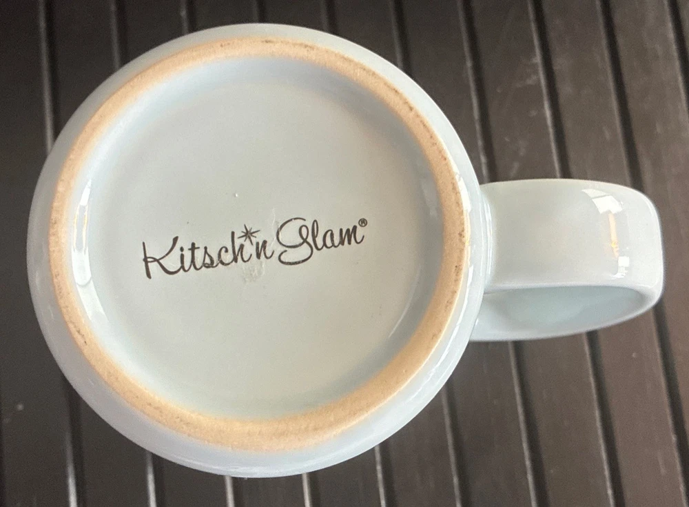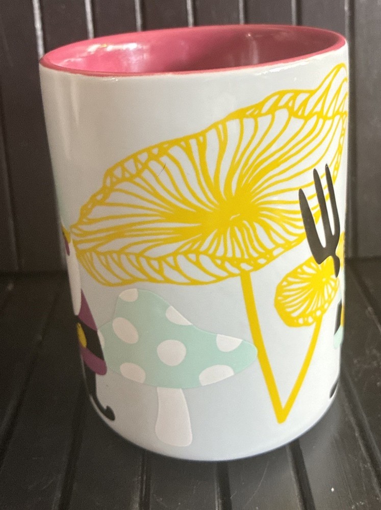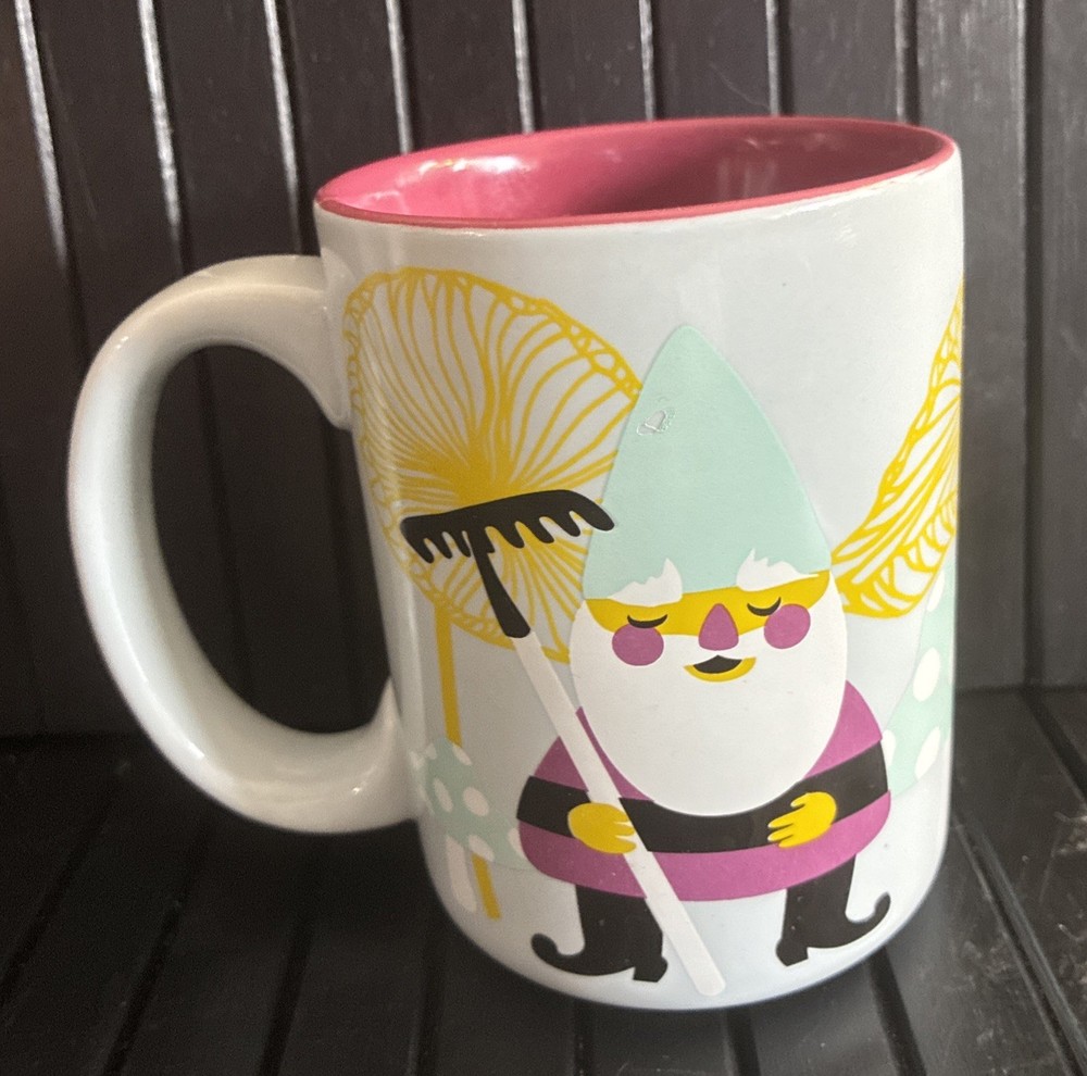 Kitch*n Glam 14 oz coffee mug- pastel blue with farm gnomes and mushrooms. Each side of mug has a different gnome and farm tool. The inside of the mug has a glossy magenta finish. Item is in excellent used condition with no chips, nicks, scratches, cracks, crazing or discoloration. UC3