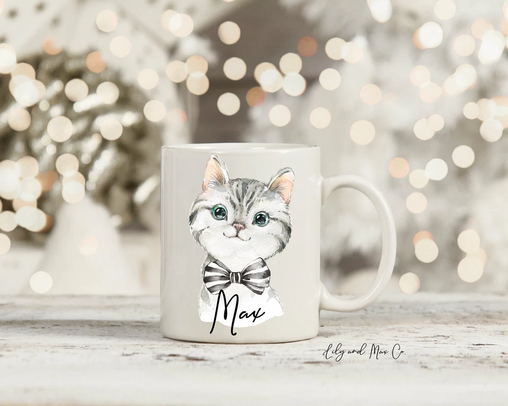 Kitten Mug Christmas Gift Mug Cat Ceramic Mug Boy Kitten Personalized Mug Product Details.. This high quality 11oz. ceramic white mug has a premium hard coat that provides crisp and vibrant color reproduction sure to last for years. Perfect for all hot & cold beverages. The highest quality printing possible is used. It will never fade no matter how many times you wash it. Material: 100% Ceramic. Print both sides. Dishwasher and Microwave Safe. High Gloss + Premium White Finish. Printed in the U.S.A. Personalized & Custom. We support personalized and custom mug to add custom, when placing an order, you can add notes to the "order note" in shipping address section. Also you can contact us directly via message. Shipping Info. Ready to ship in 1 to 2 business days, All products are made-to-order and proudly printed in the United States. Shipped by USPS and DHL, You will receive your order in 5-7 days. Replace & Refund. All products are defective during shipping broken, chipped will be replaced free of charge. You are not satisfied with the product, we will refund 100% money to you. If any other issues arise, please do not hesitate to message, we would be more than happy to assist you.