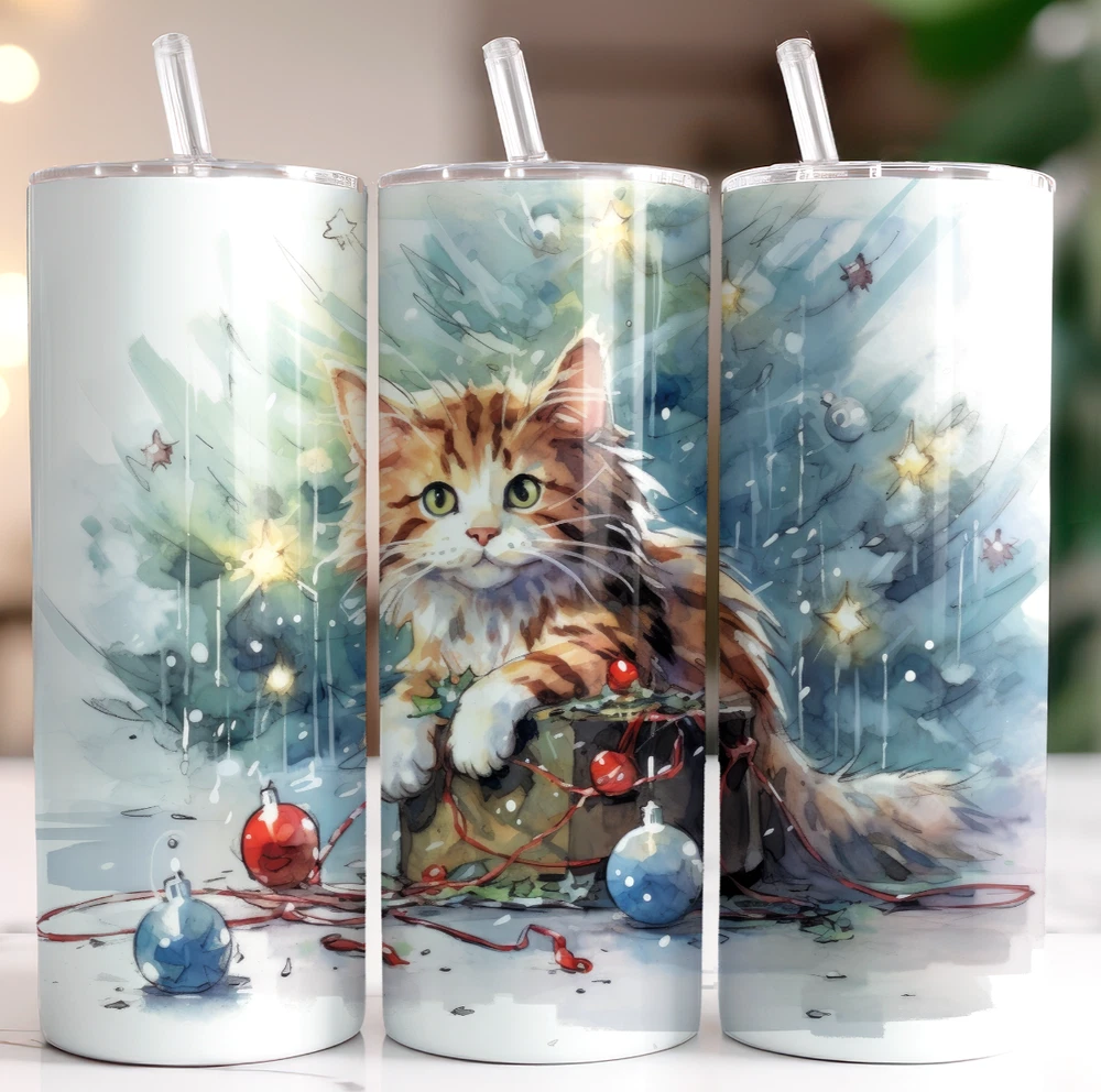Kitten Tangled Tree Multicolor 20oz Insulated Tumbler With Box Lid Straw New