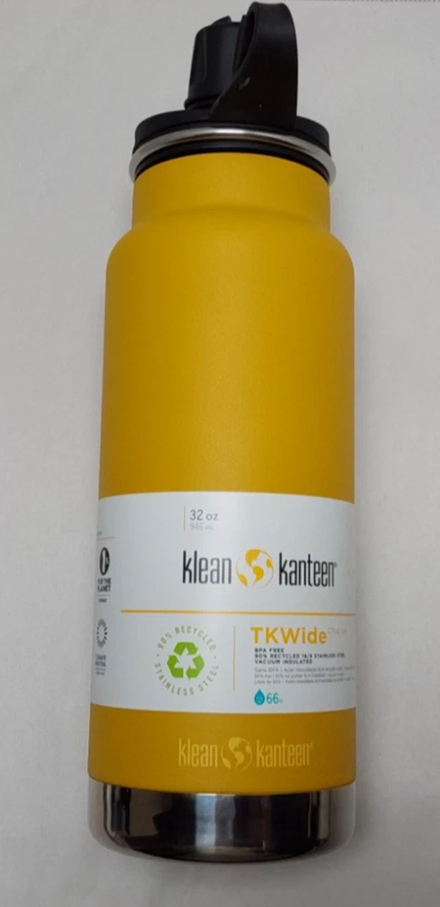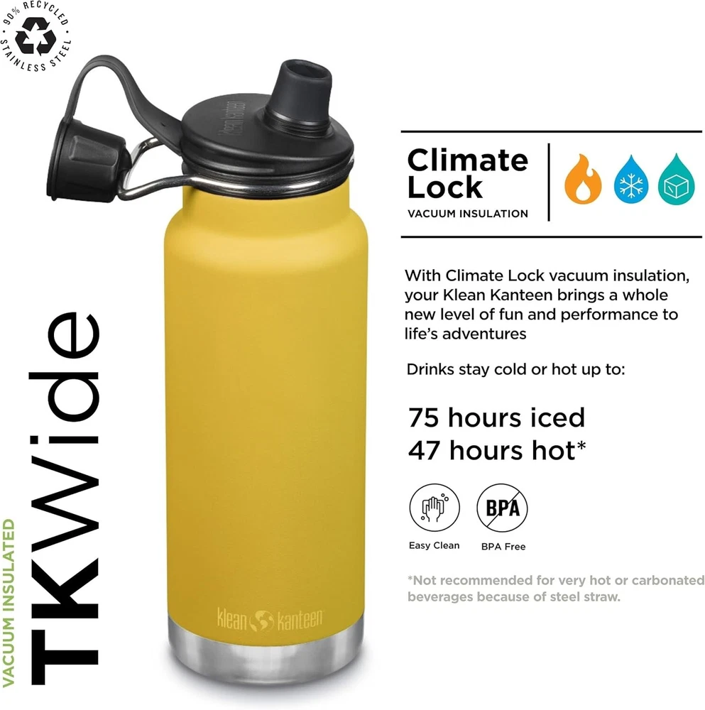 Klean Kanteen 32oz TKWide Insulated Stainless Steel Water Bottle with Chug Cap - Marigold (Yellow Color) TK Closure internal thread design increases thermal performance and compatible with TKWide caps Climate Lock keeps contents hot up to 14 hours or iced up to 47 hours applying and those that use our water bottles 18/8 food grade stainless steel - BPA Free.....