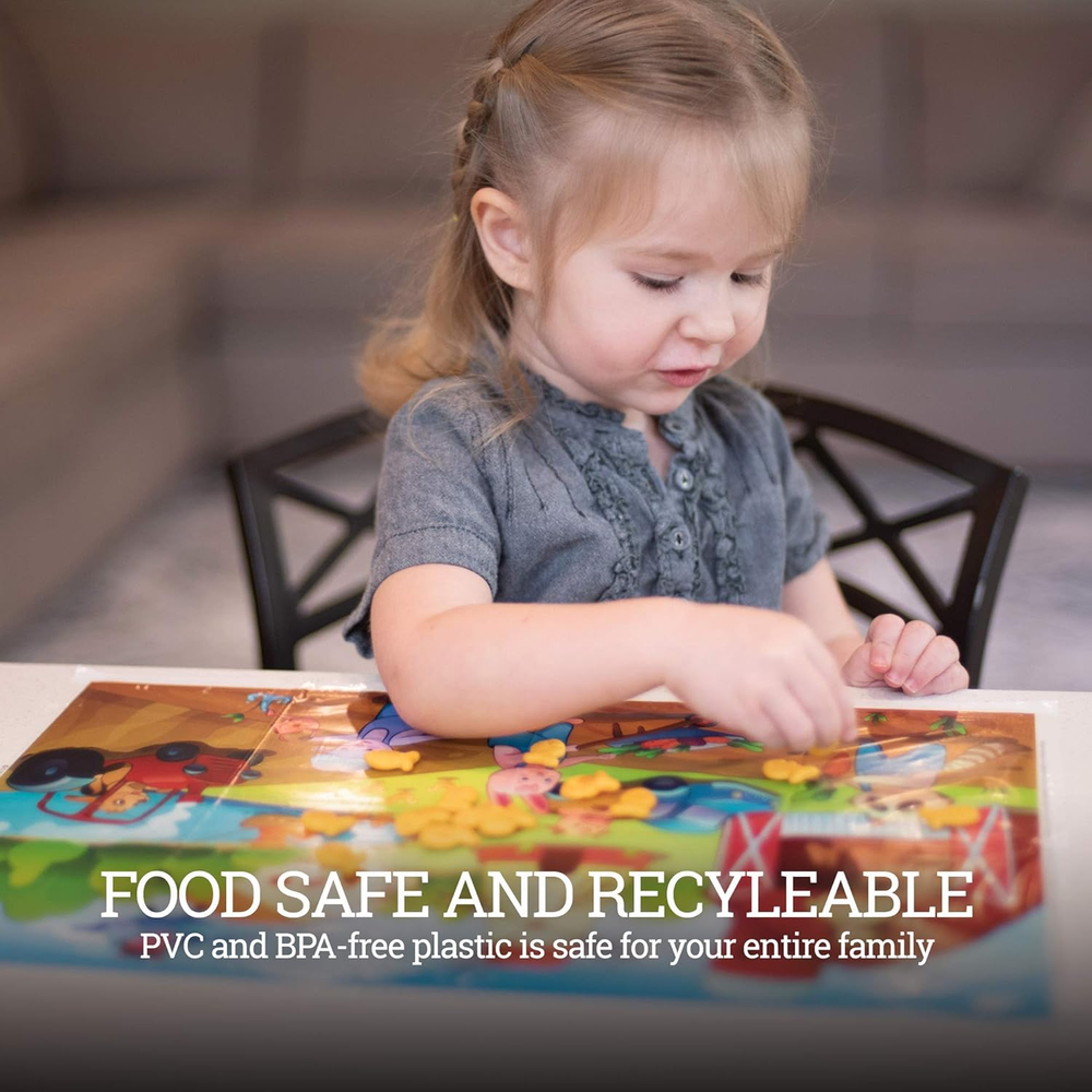 FUN IMAGES KIDS LOVE: This 40-pack set of placemats that stick features vibrant colors and delightful designs that will excite your child and keep them occupied as they explore new, imaginary worlds! STAYS IN PLACE: With a stick on placemat, your children's mat will no longer end up on the floor! Temporary adhesive strips on all 4 sides make it difficult for toddlers to pull them free, and yet they're easy enough for adults to remove when done FULL COVERAGE: The large 12"x18" size means your infant can eat off the mat itself (skip the plate), without concerns about the table cleanliness! Your child will learn independence and self-feeding skills, and you'll enjoy easy clean up later EASY TO GRAB-AND-GO: Unlike some competitors, our placemats are individually folded, which makes them much more convenient to grab and go! Simply grab one from the top of the stack, and you're ready for grandma's house or a restaurant SAFE FOR KIDS: Our sticky placemats for toddlers are tested and verified by third-party labs to ensure that the plastic meets or exceeds all safety requirements (BPA, PVC, and Lead-free). We don't cut corners on children's health and safety Product Description Disposable Placemats for Eating, Crafting and Travel! HomeWorthy is dedicated to providing high quality products that are safety-tested and approved for use by everyone, from infants to adults! We offer a large assortment of disposable placemats that help protect you and your loved ones from lingering yuckiness on public surfaces. With disposable placemats that stick to the surface, you will rest assured that you have a clean surface on-the-go. Protection for Restaurants They provide a clean surface for kids to eat off, and they also protect tables from spills and messes. You'll enjoy easy cleanup afterwards, and your servers will appreciate you! Ditch the plate...just let them eat right on the mat! Multi-Purpose Placemats Your kids will love our 40 pack placemats of various Animal designs! They're easy to slip into your purse for travel, or leave in your glove box for when you're on the go. They also make great airplane tray covers (they fit all tray sizes---simply pull off the sticky strips and fold them over the edges of your tray), traditional meal placemats, and can be used in any social situation when you need a guaranteed clean surface for your child. SAFE EATING SURFACE Whether your child has food allergies, or you just want to protect them from dirty surfaces and more---we have it covered (literally). EASY CLEANUP WHEN CRAFTING Enjoy easy clean up for meals or messy children's crafts. No longer worry about markers, paints or play dough on your delicate tables! STICKY ADHESIVE STRIPS We know those little ones love to pull their placemats to the floor. With 4 adhesive sticky strips on the backside, these mats will stay in place where you put them!