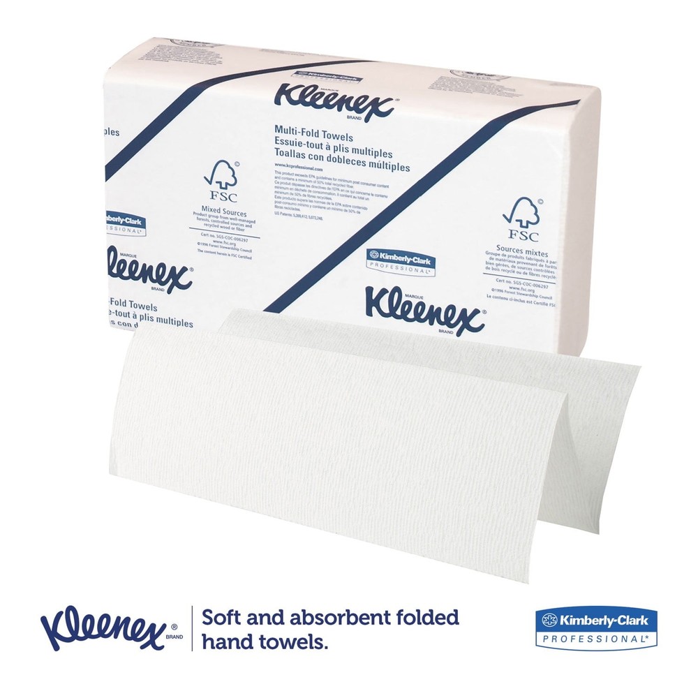 Image is important, especially for your business. Providing top-quality Kleenex Multifold Paper Towels in your office washroom and kitchen lets your employees and guests know that you care enough to offer the very best experience. Each paper towel is made of soft, absorbent material, so users will use fewer paper towels and waste less. Their fold is designed to dispense one-at-a-time, while bringing the next towel forward for another user. They're designed be used with universal multi-fold towel dispensers, giving you maintenance flexibility. Multi-Fold Towels, Convenience Pack—9 1/5 x 9 2/5. 150 towels per pack. Towel/Wipe Type: Multi-Fold; Application: General Purpose; Material(s): Paper; Color(s): White. On Jul 10, 2025 at 23:36:30 PDT, seller added the following information: On Jul 11, 2025 at 02:38:10 PDT, seller added the following information: